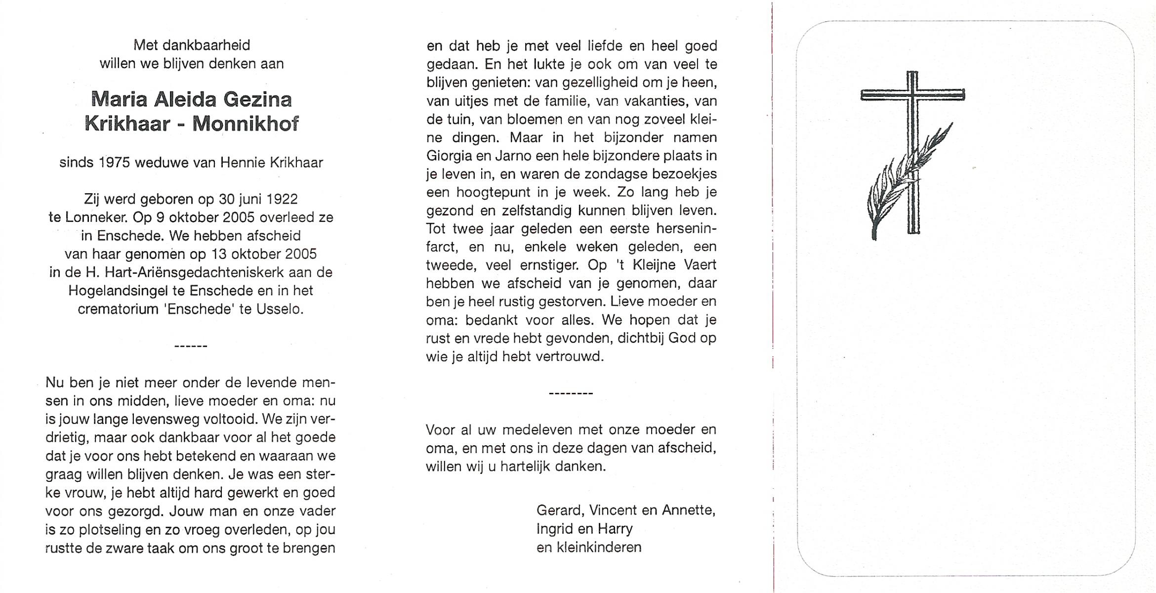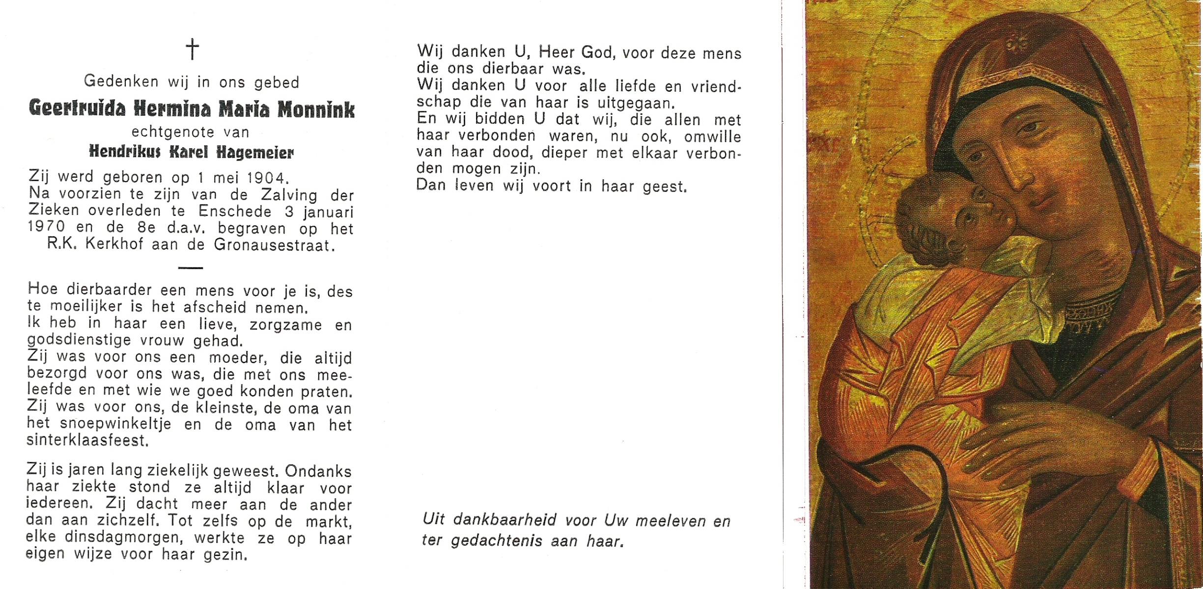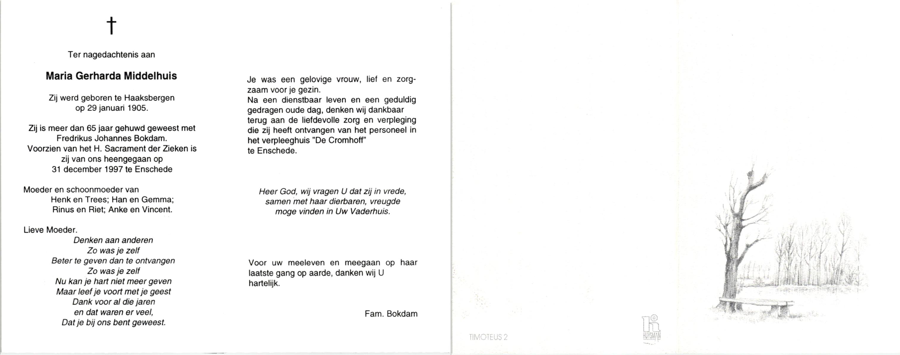 MIDDELHUIS, , Maria Gerharda, geboren op 29-1-1905 te Haaksbergen, overleden op 31-12-1997 te Enschede op 92-jarige leeftijd.