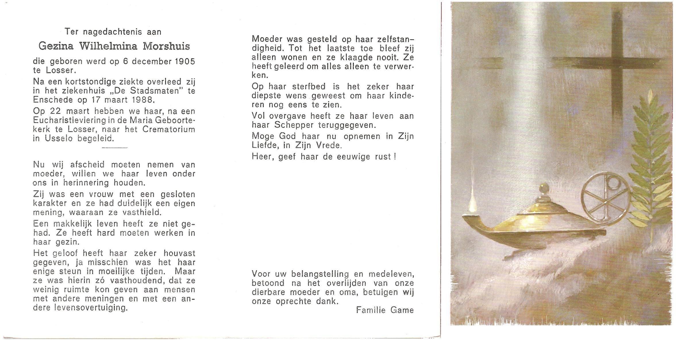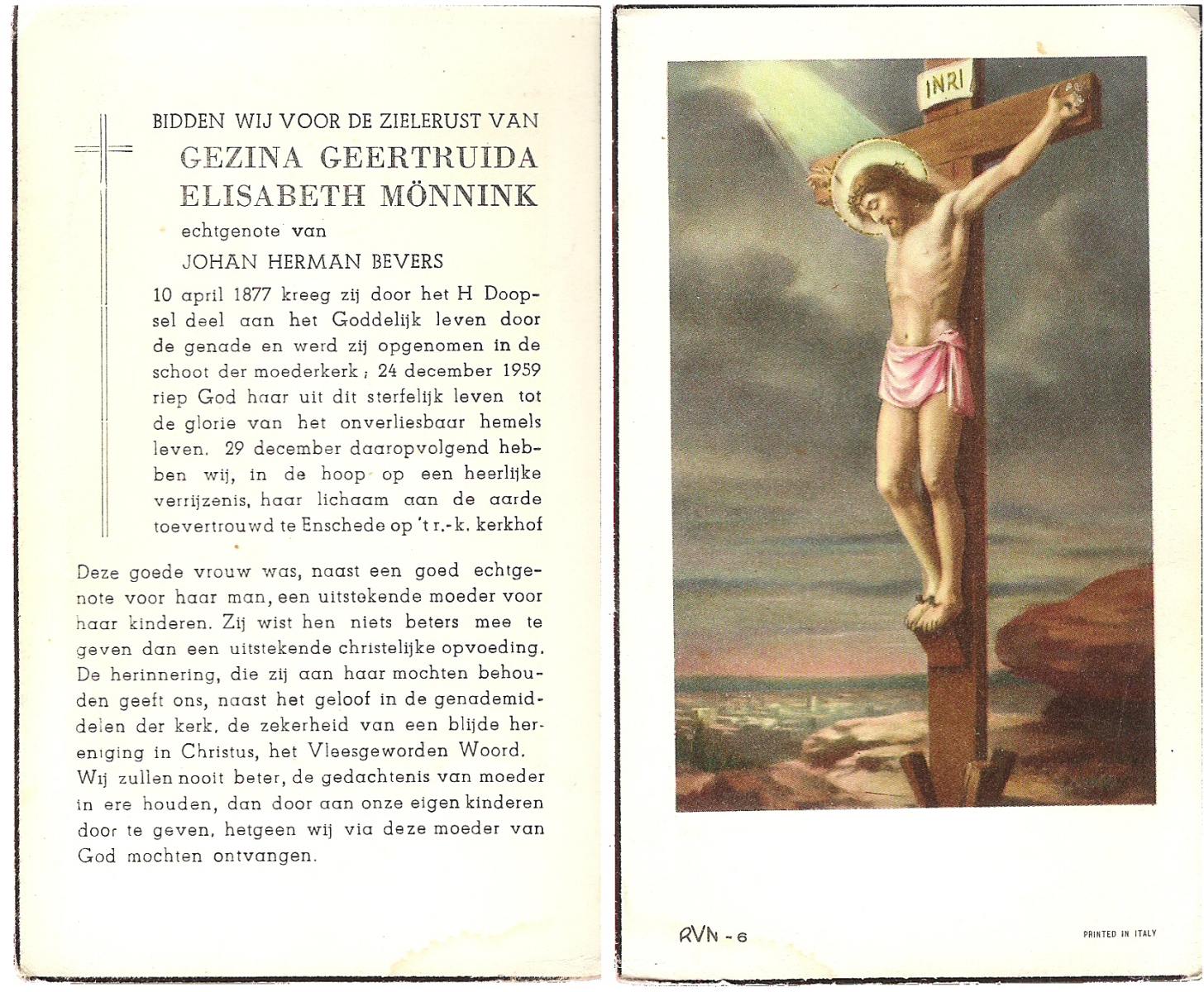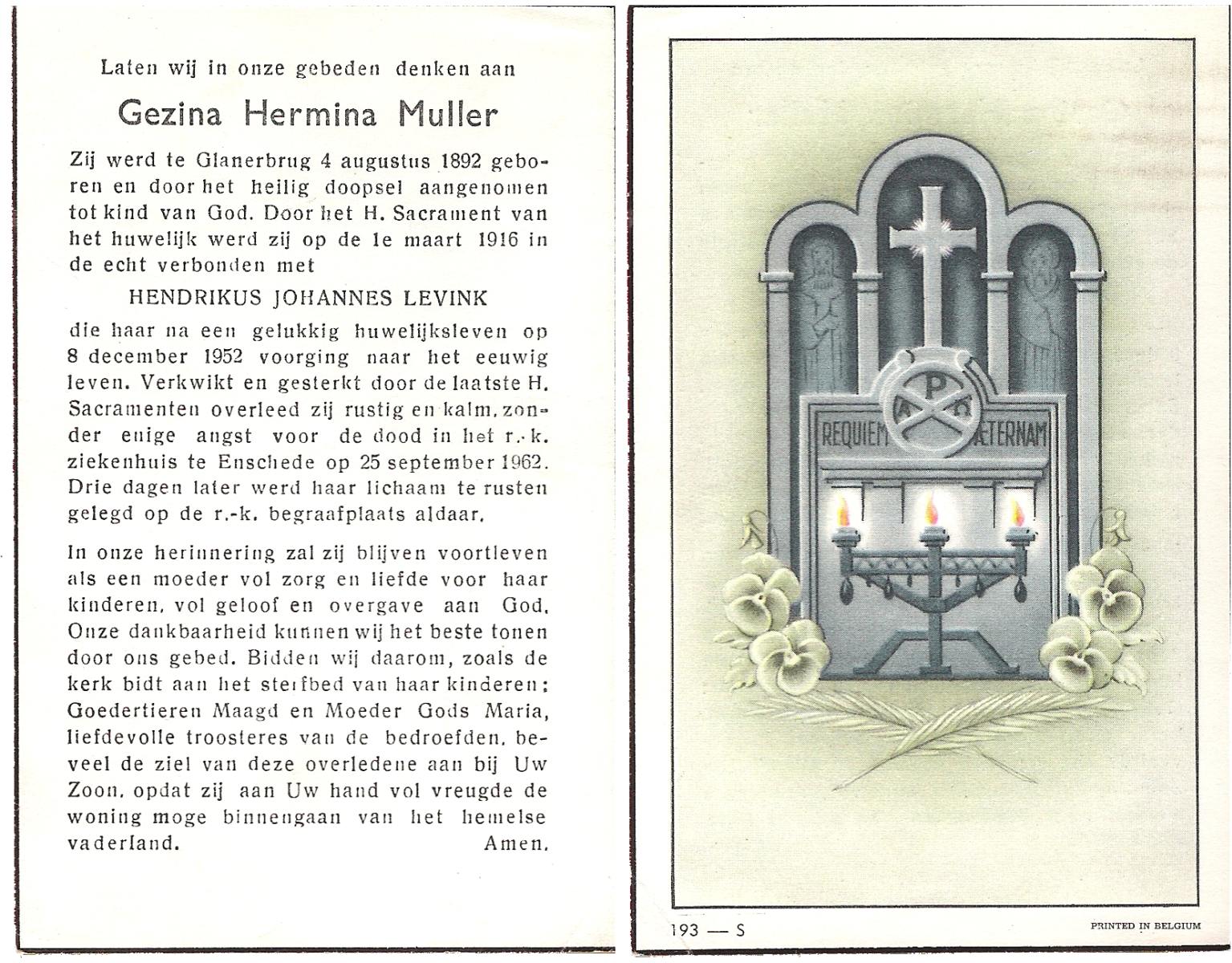 MULLER, Gezina Hermina, geboren op 04-08-1892 te Glanerbrug, overleden op 25-9-1962 te Enschede op 70-jarige leeftijd, begraven op 28-9-1962 te Enschede.