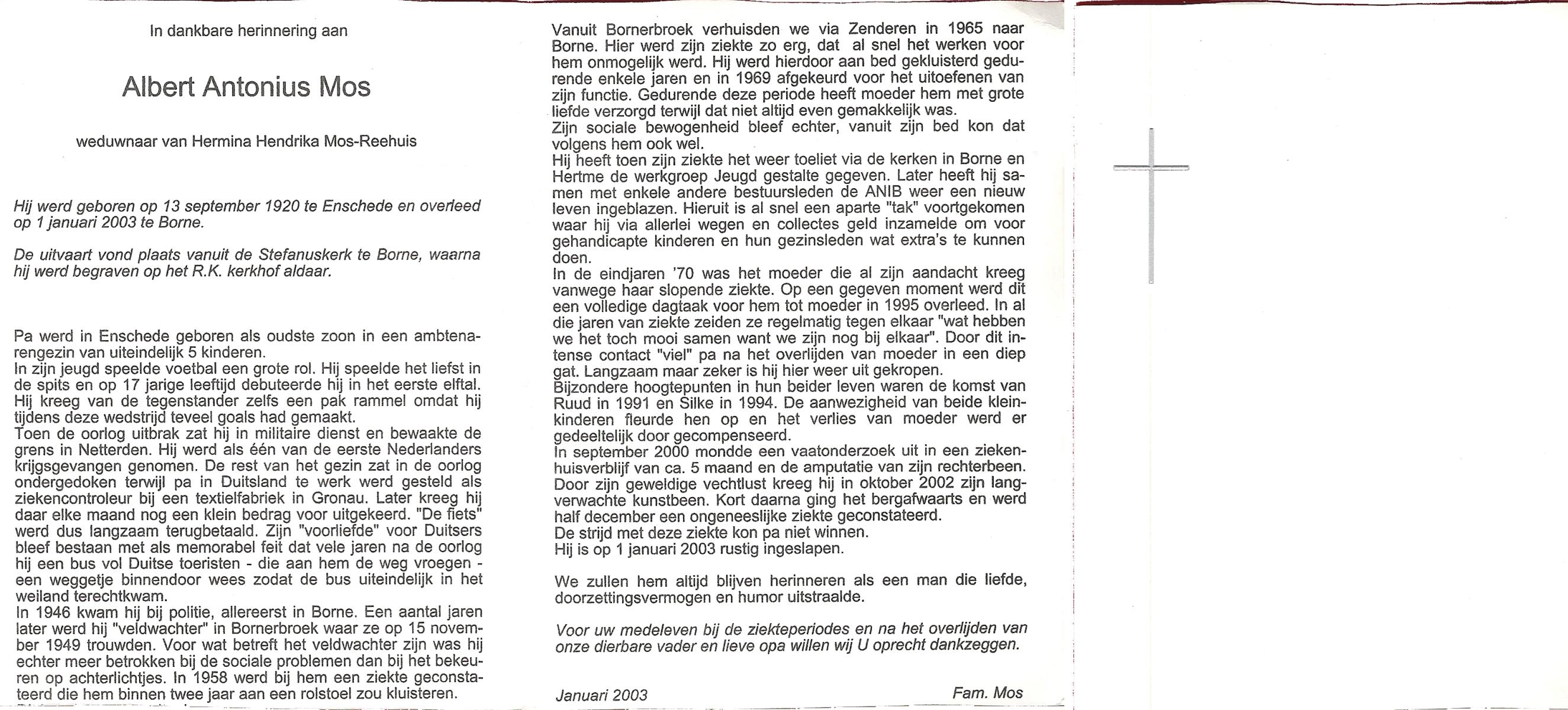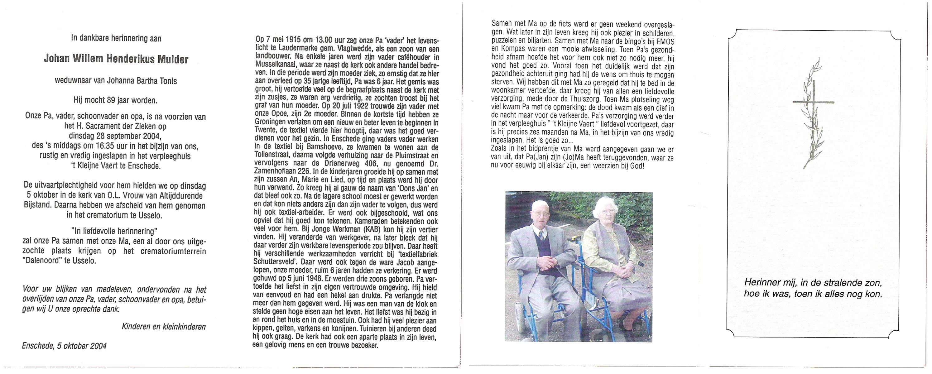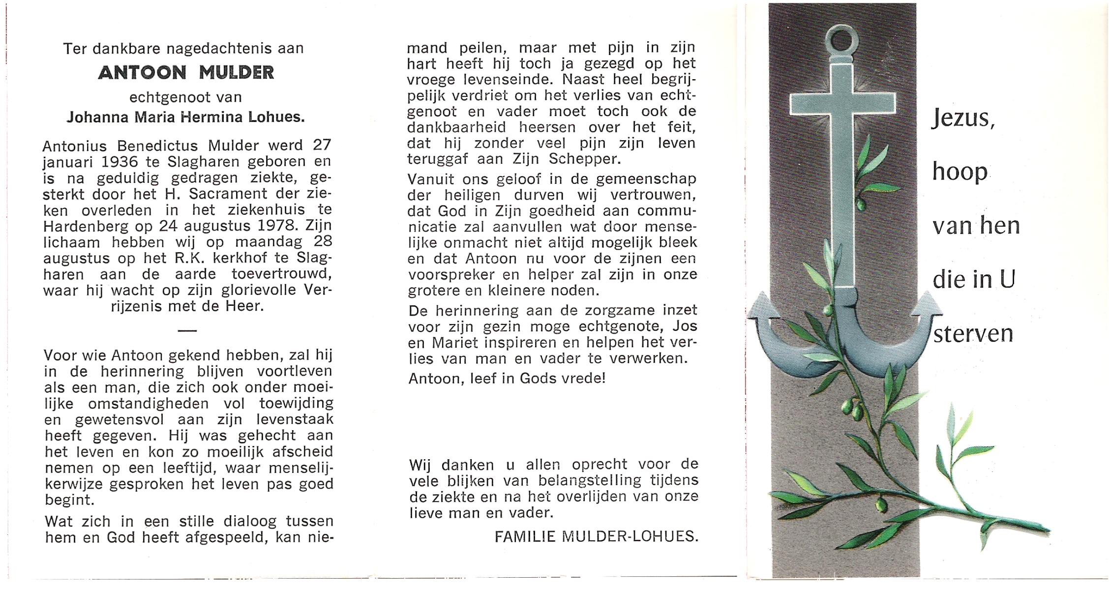 MULDER, Johannes Antonius, geboren op 22-10-1924 te Rijssen, overleden op 4-6-2003 te Almelo op 78-jarige leeftijd, begraven op 7-6-2003 te Almelo.