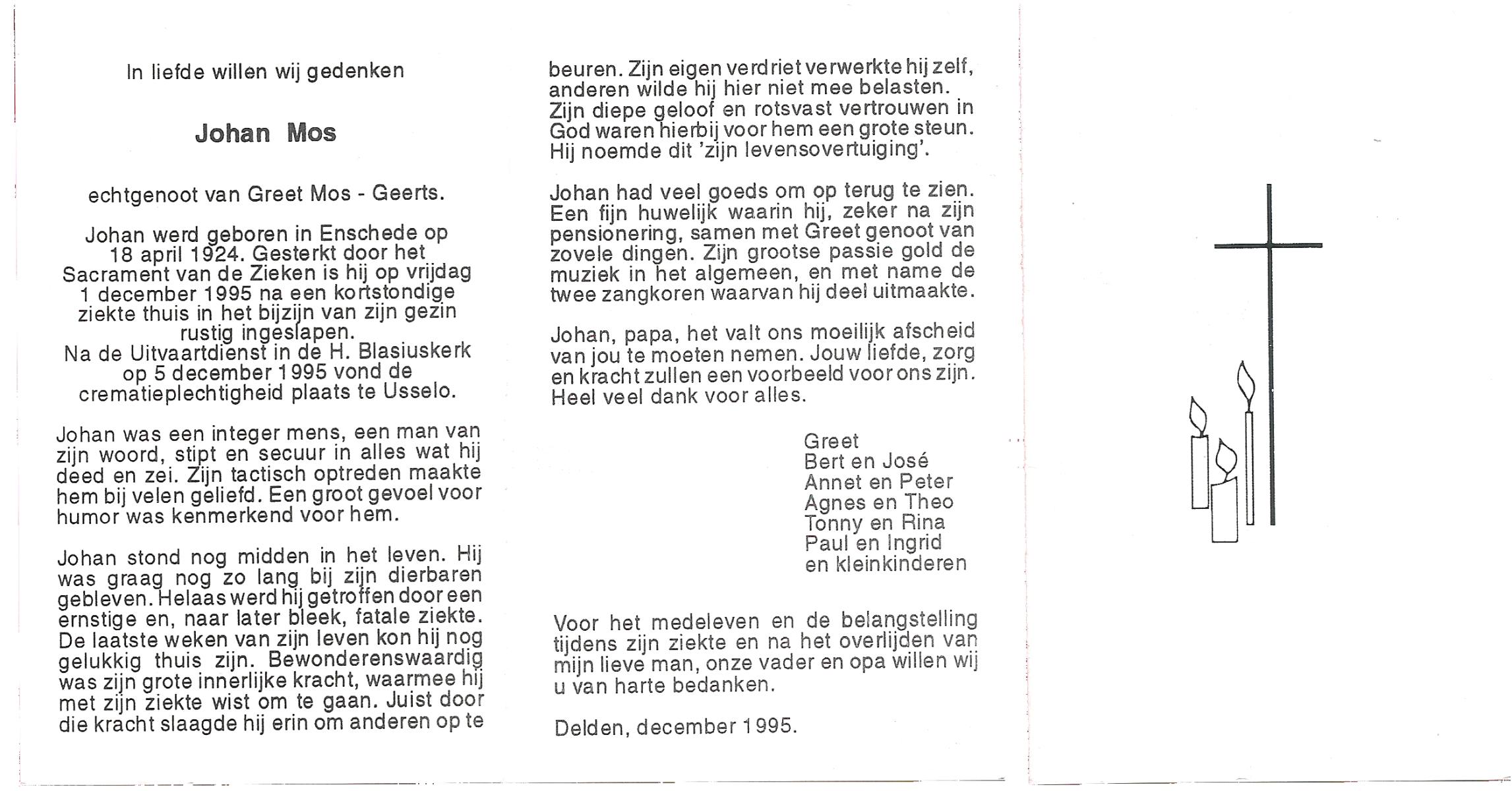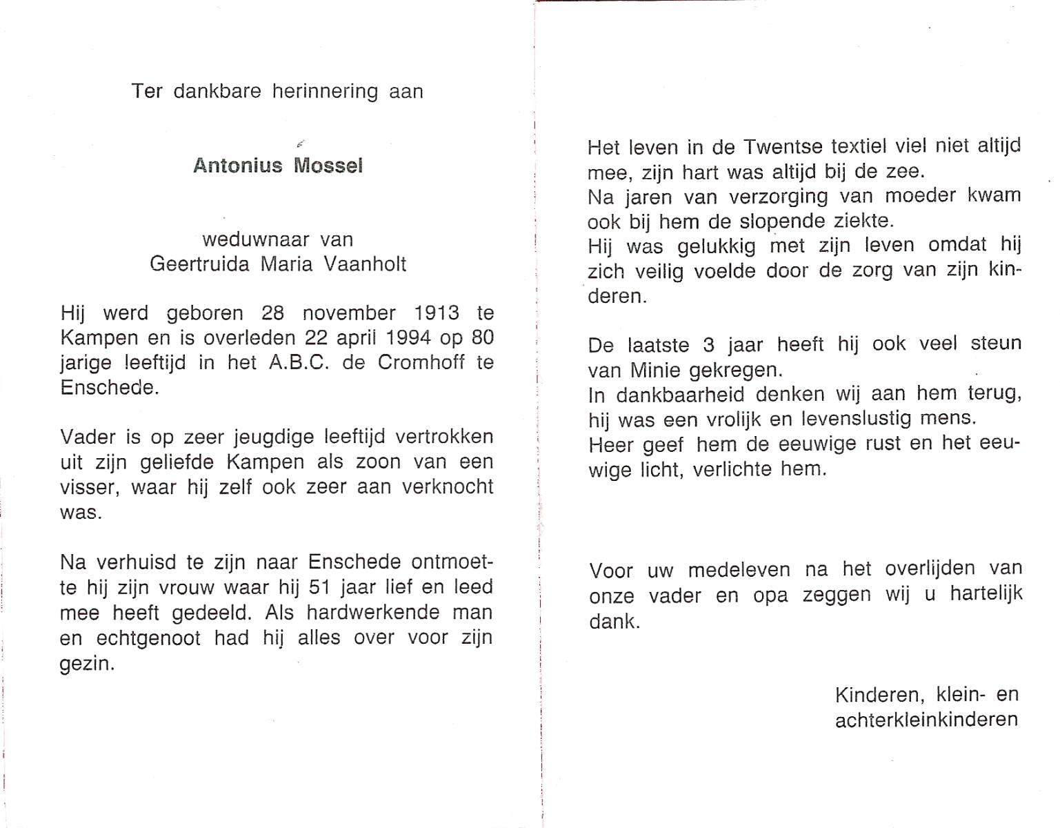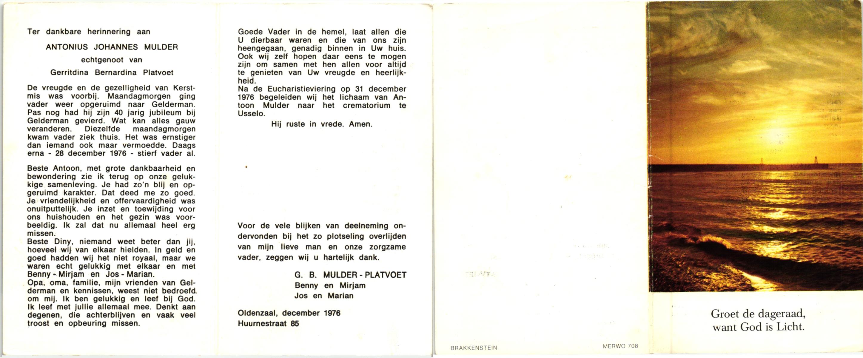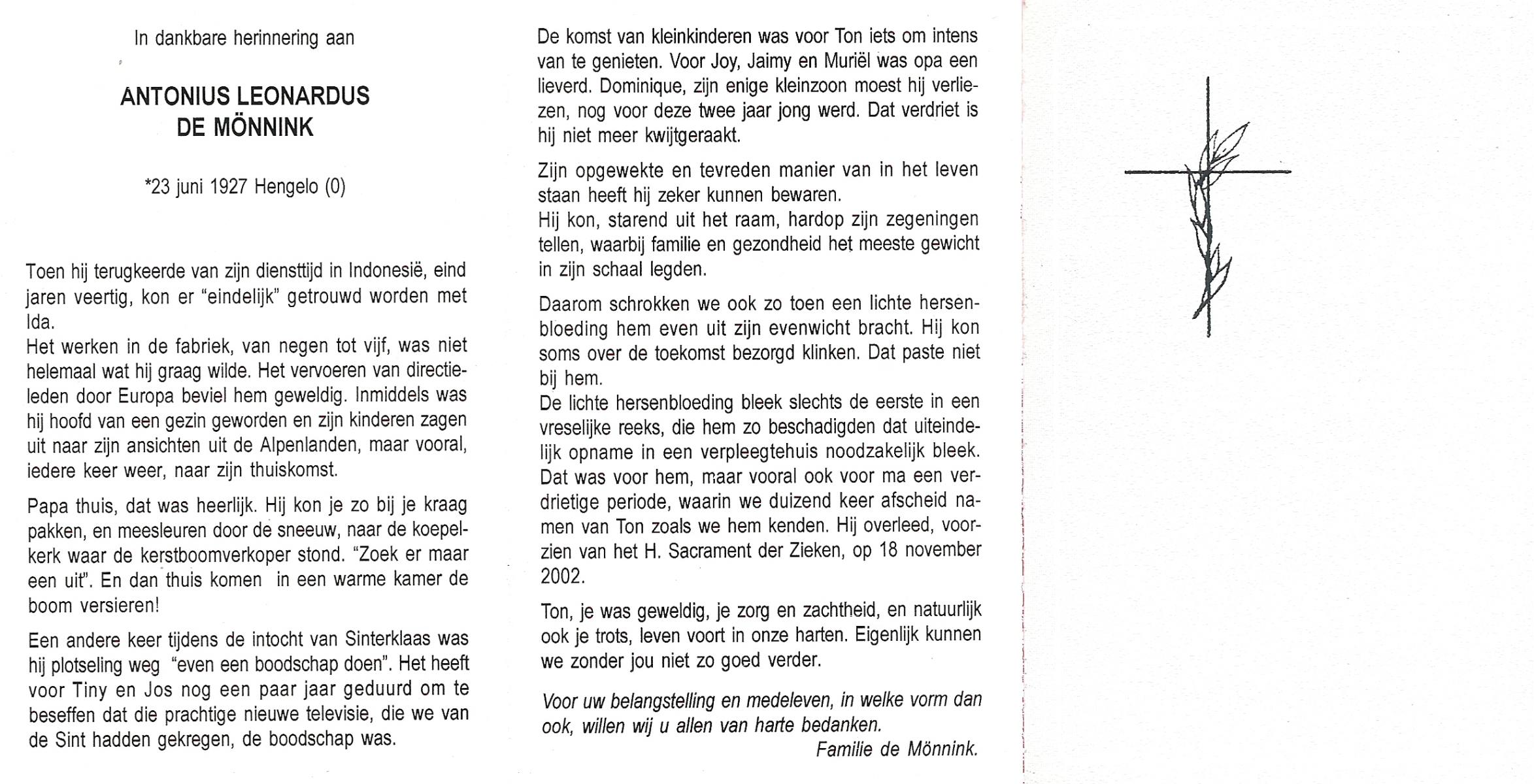MULDER, Johannes Antonius, geboren op 22-10-1924 te Rijssen, overleden op 4-6-2003 te Almelo op 78-jarige leeftijd, begraven op 7-6-2003 te Almelo.