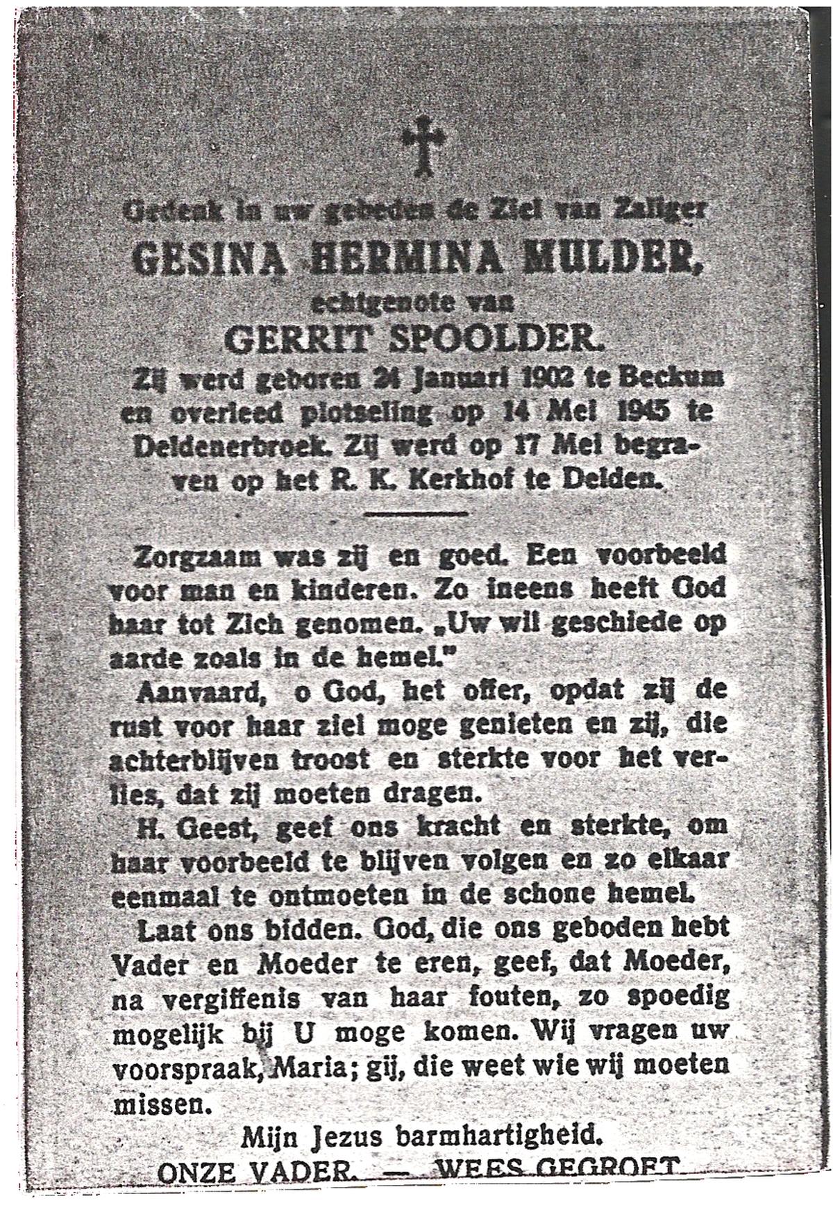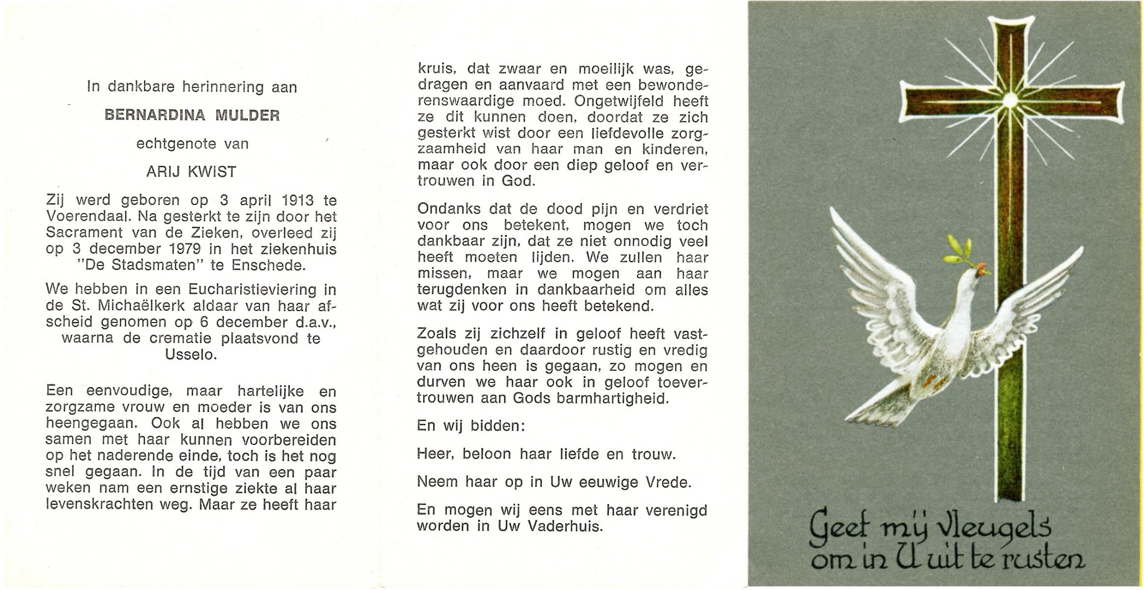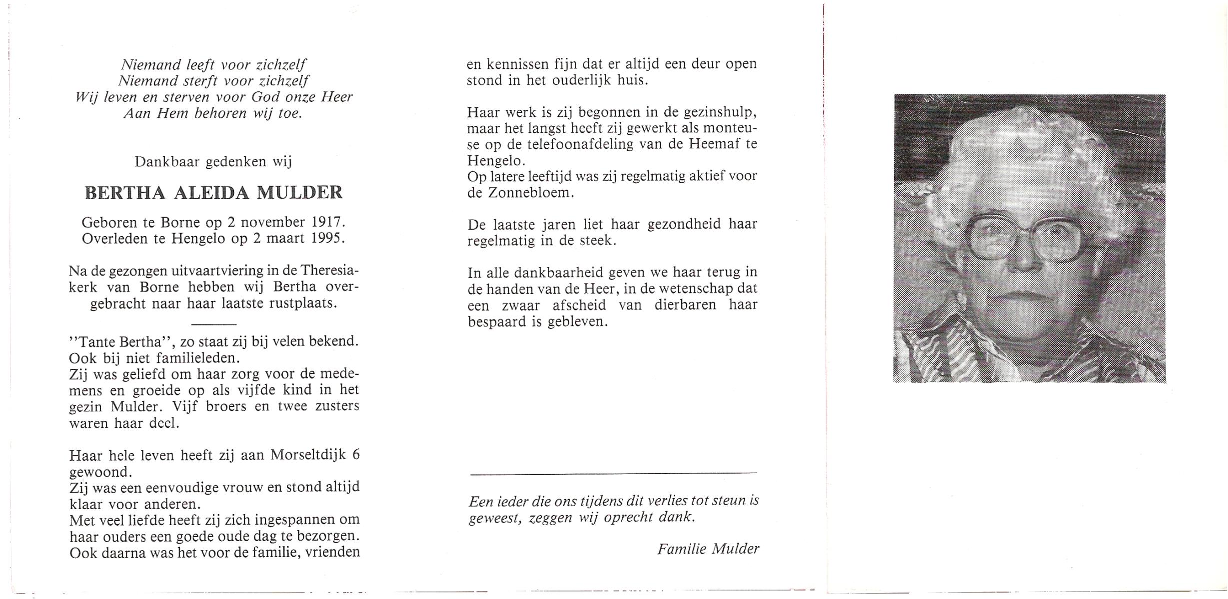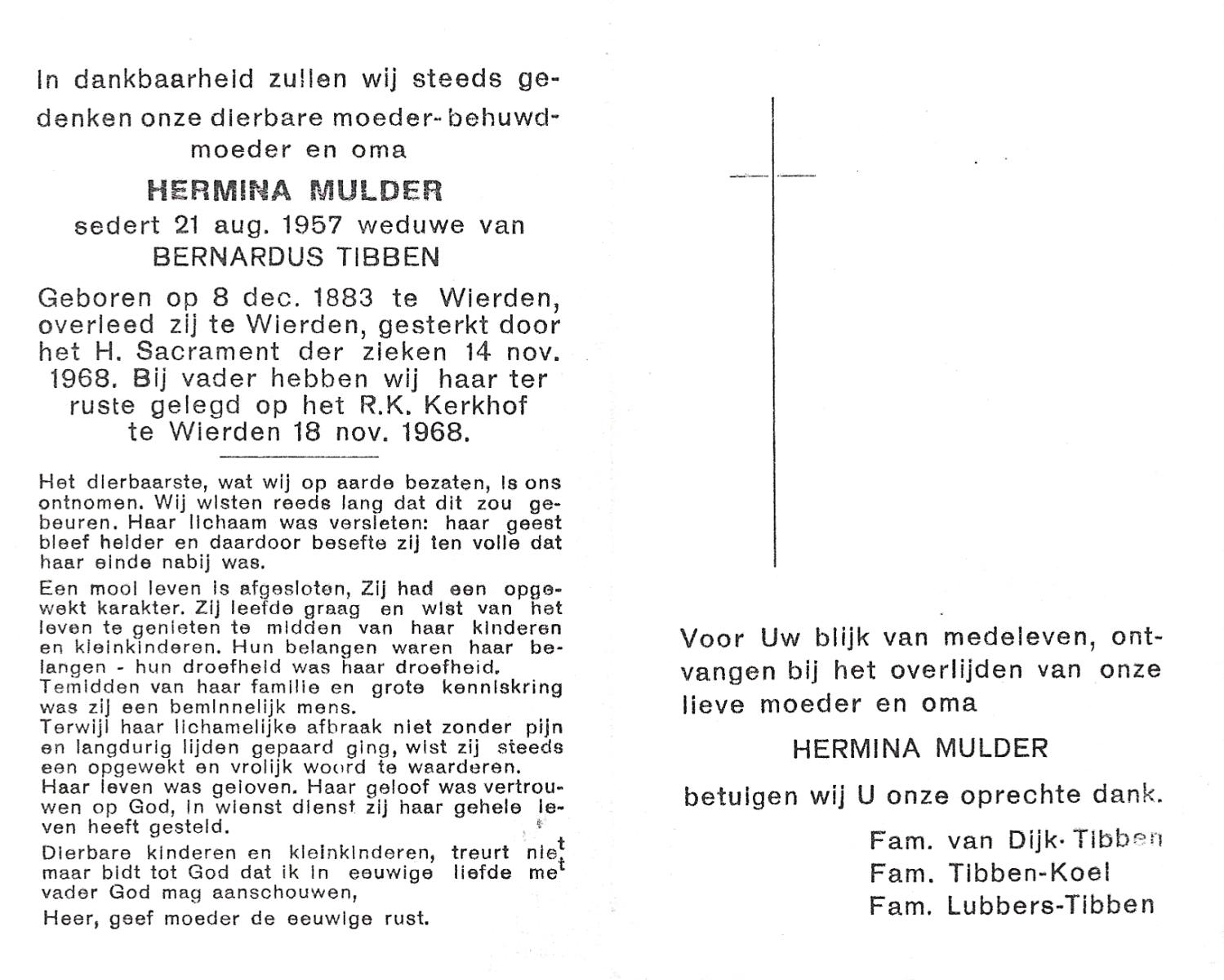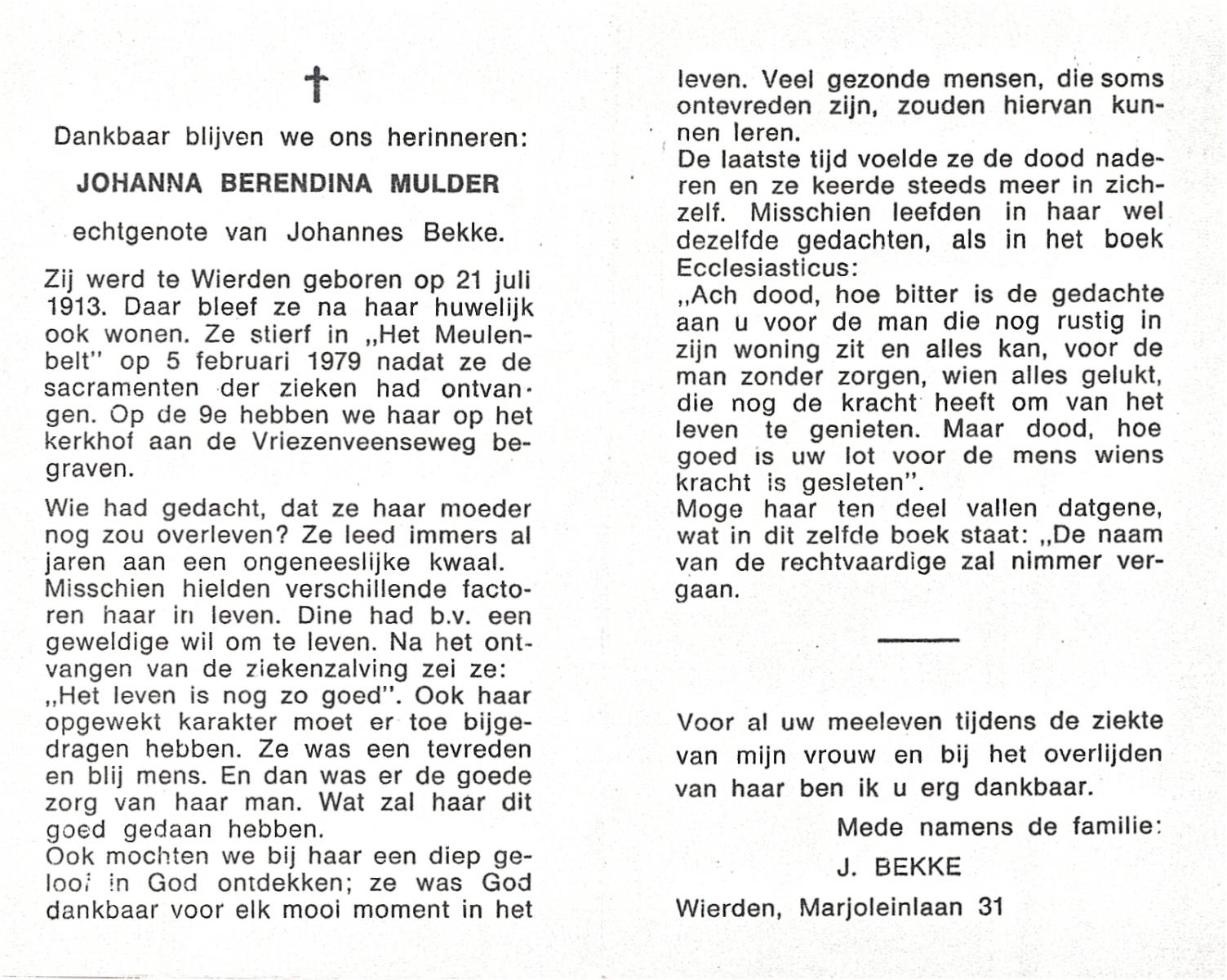 MULDER, Johanna Berendina, geboren op 21-7-1913 te Wierden, overleden op 5-2-1979 te Almelo op 65-jarige leeftijd, begraven op 9-2-1979 te Wierden.