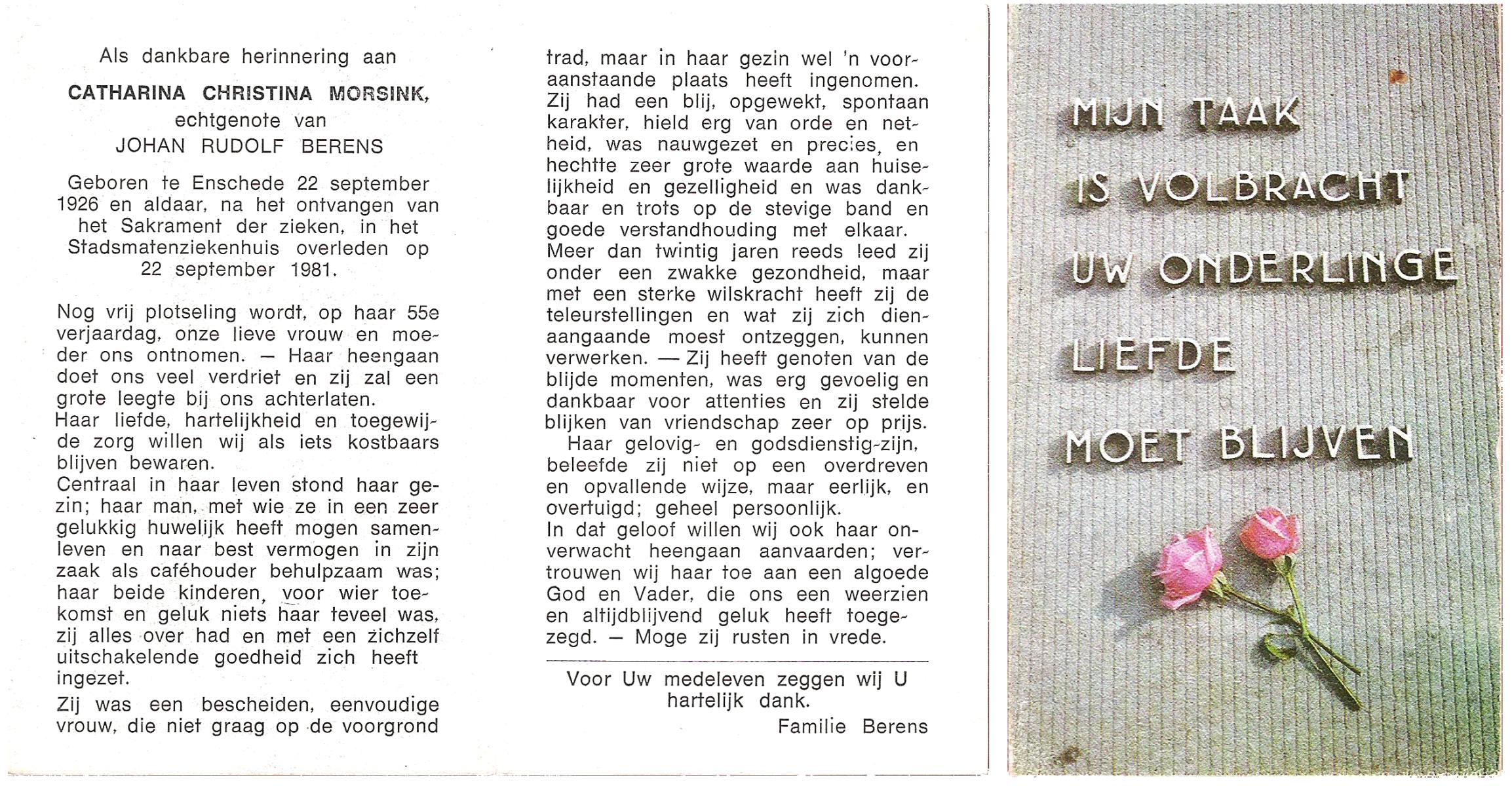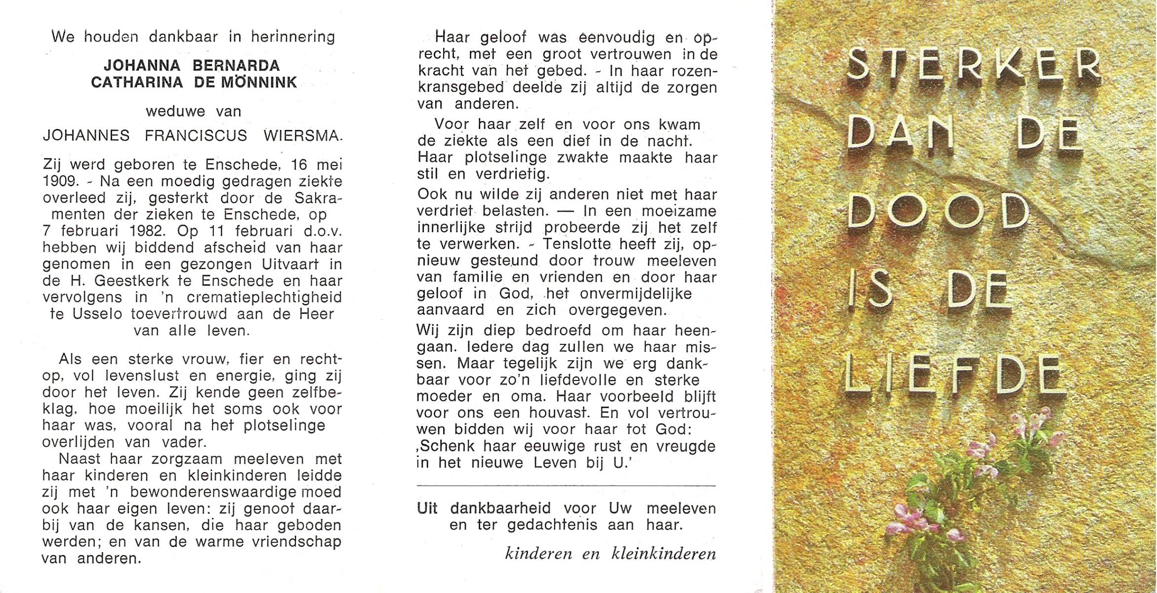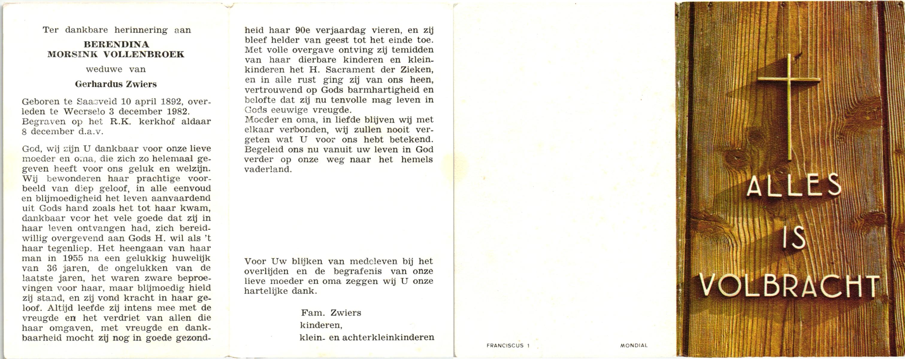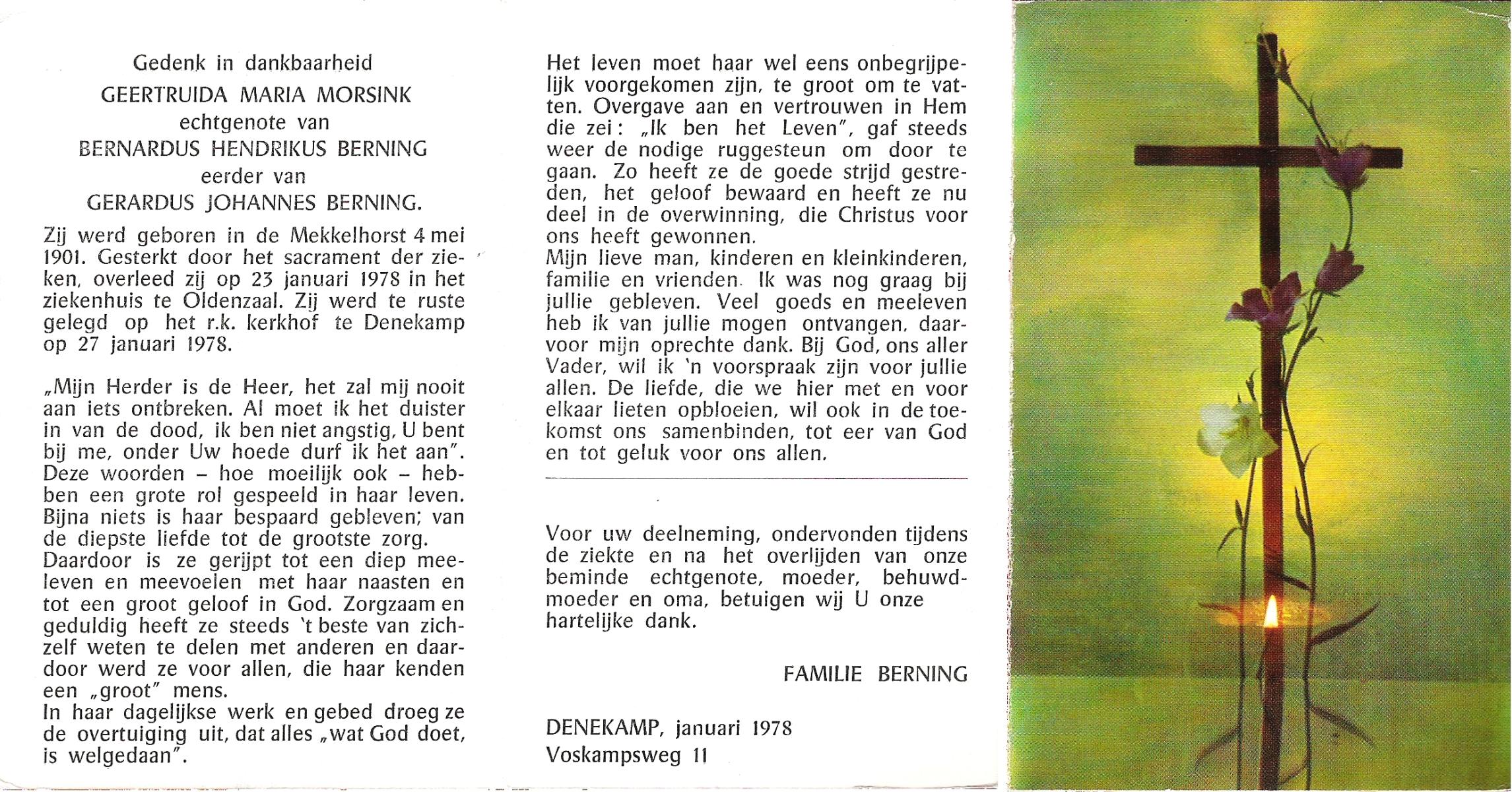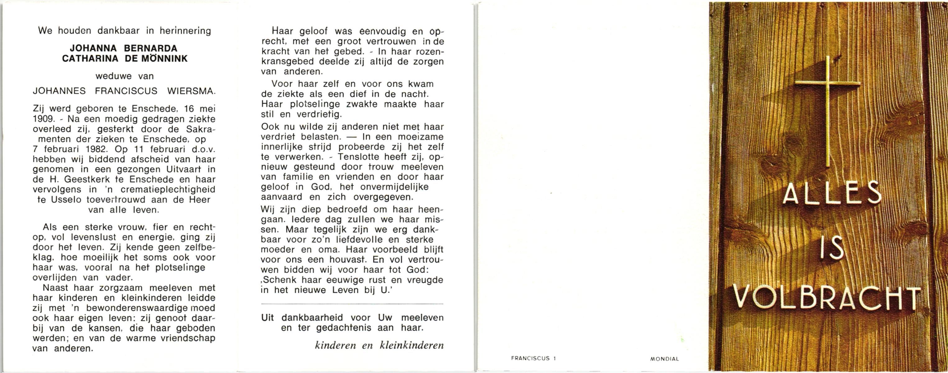 MULDER, Johanna Berendina, geboren op 21-7-1913 te Wierden, overleden op 5-2-1979 te Almelo op 65-jarige leeftijd, begraven op 9-2-1979 te Wierden.