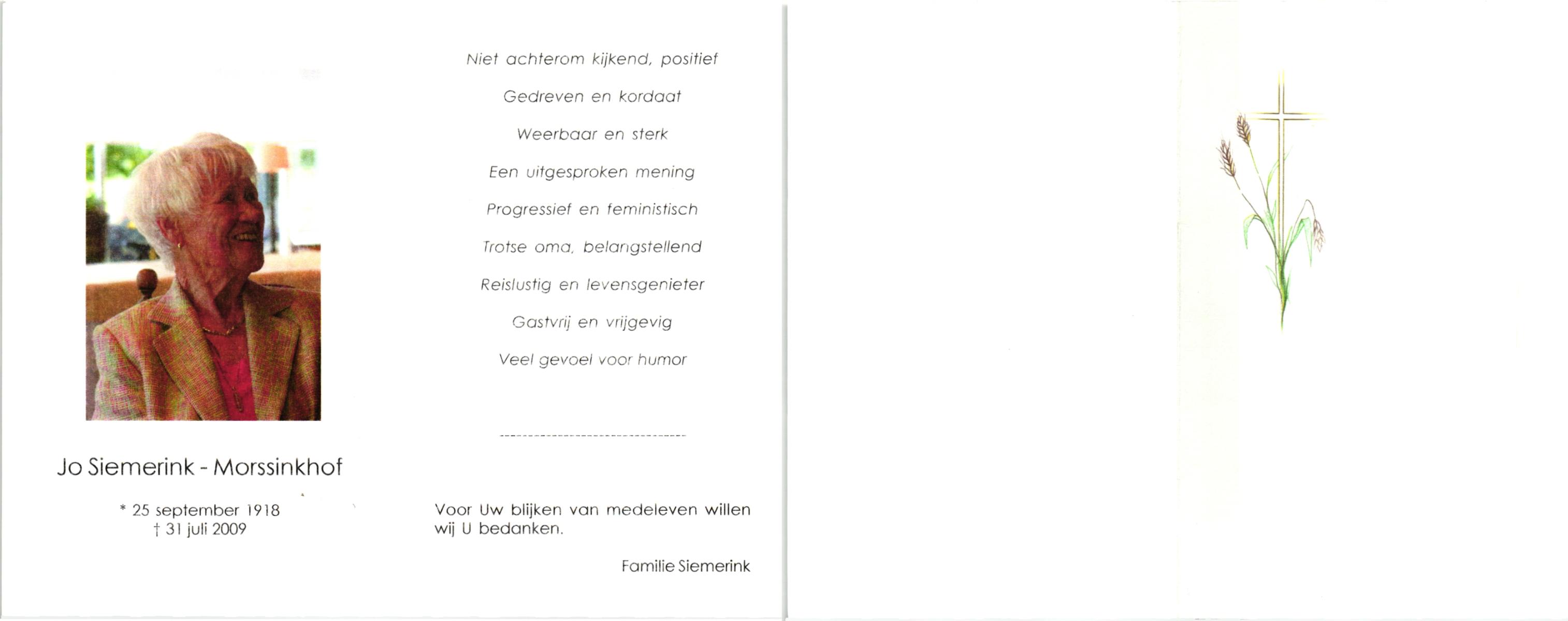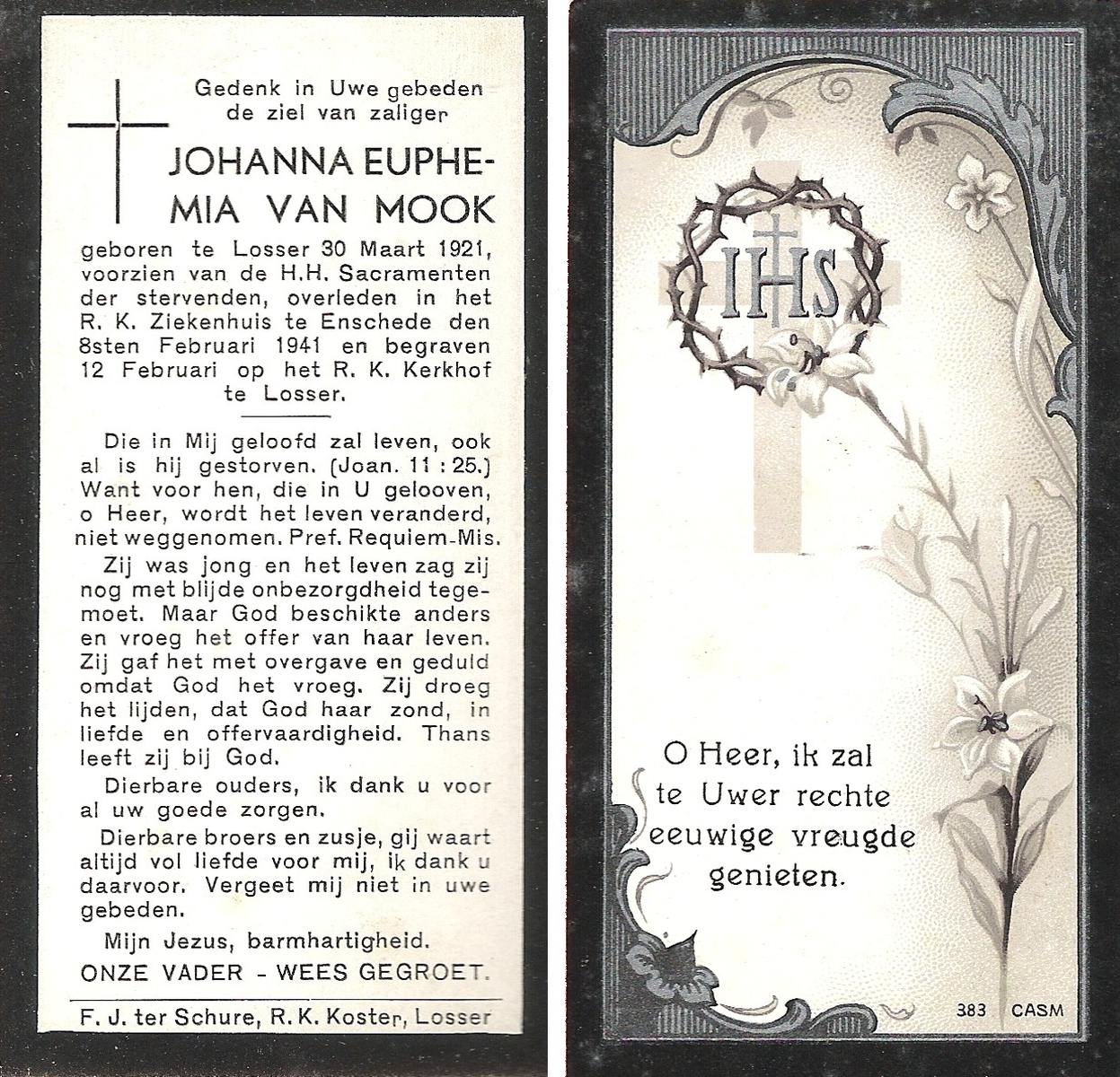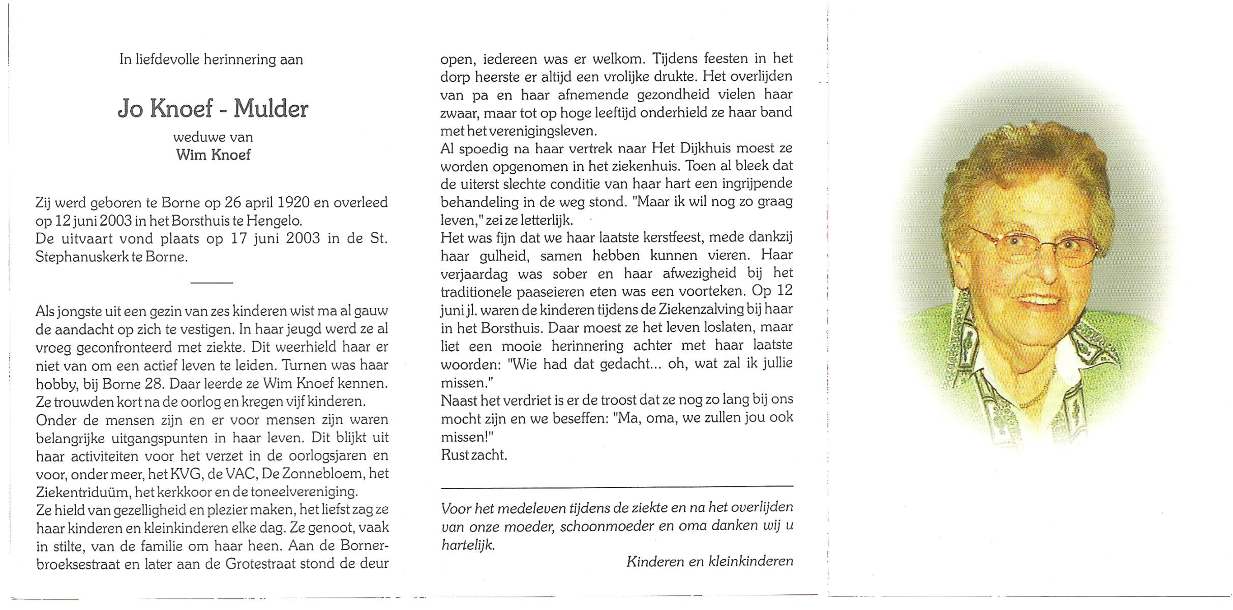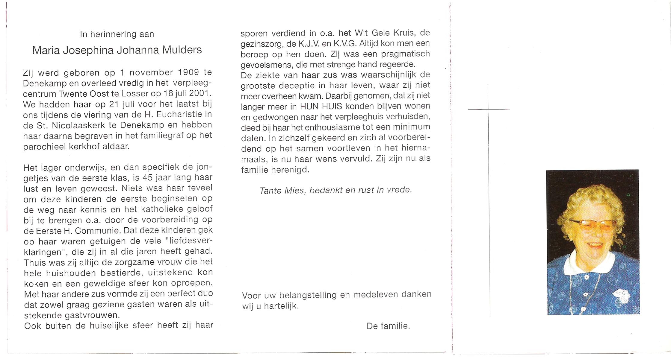 MULDERS, Maria Josephina Johanna, geboren op 1-11-1909 te Denekamp, overleden op 18-7-2001 te Losser op 90-jarige leeftijd, begraven op 21-7-2001 te Denekamp R.K.kerkhof.