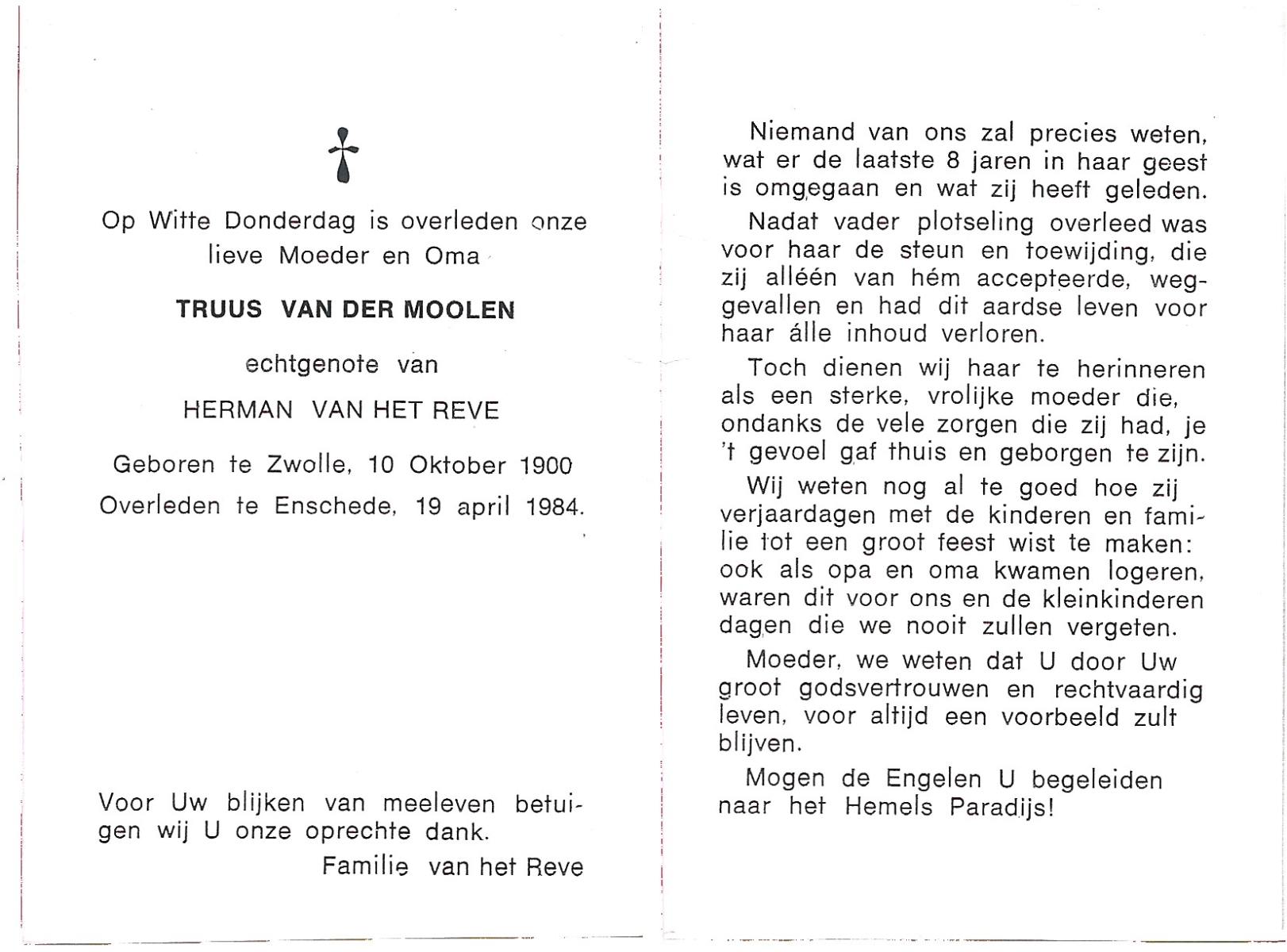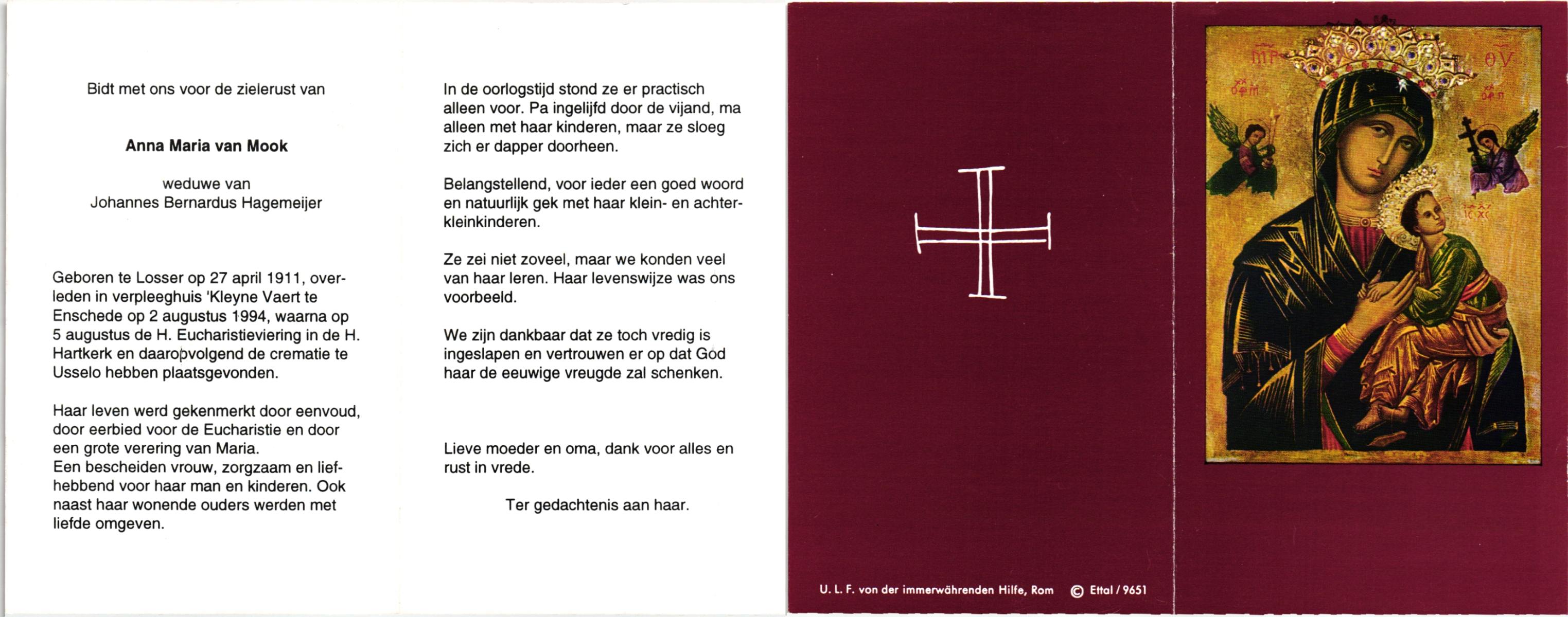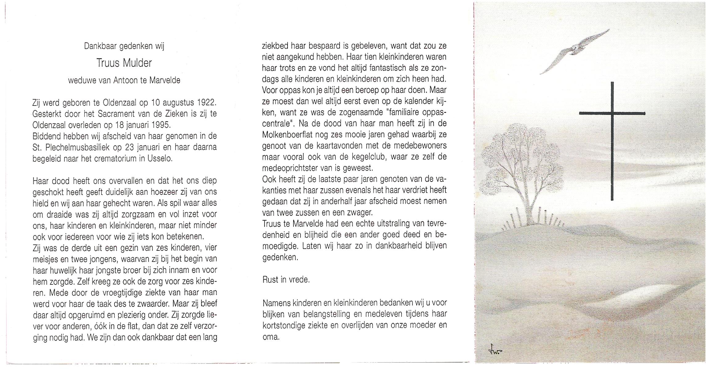 MULDER, Truus, geboren op 10-8-1922 te Oldenzaal, overleden op 18-1-1995 te Oldenzaal op 72-jarige leeftijd, gecremeerd op 23-1-1995 te Usselo.