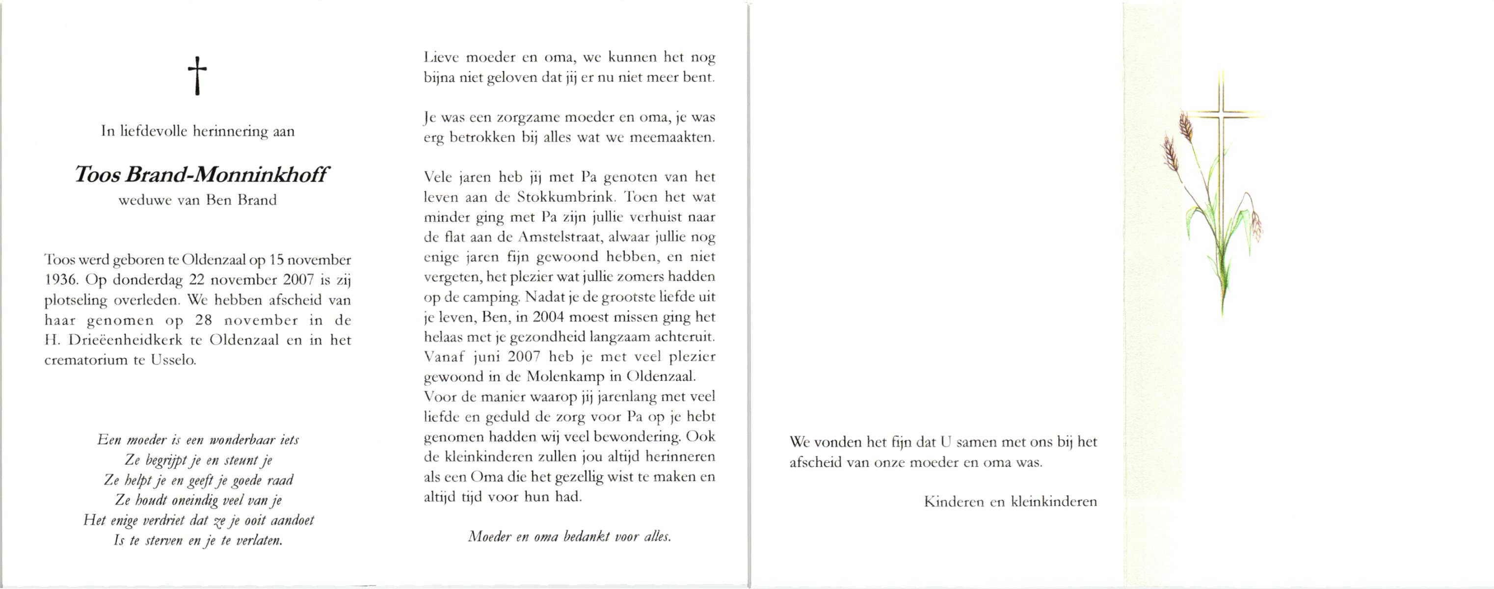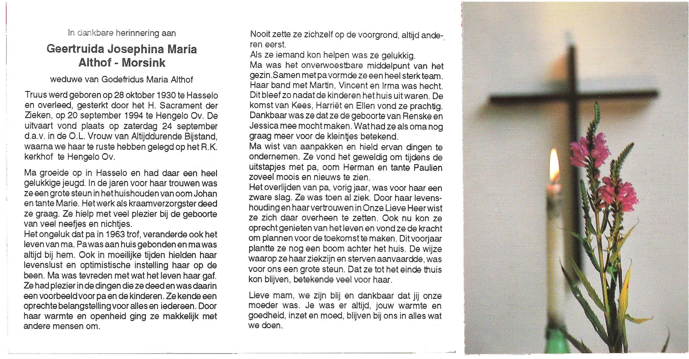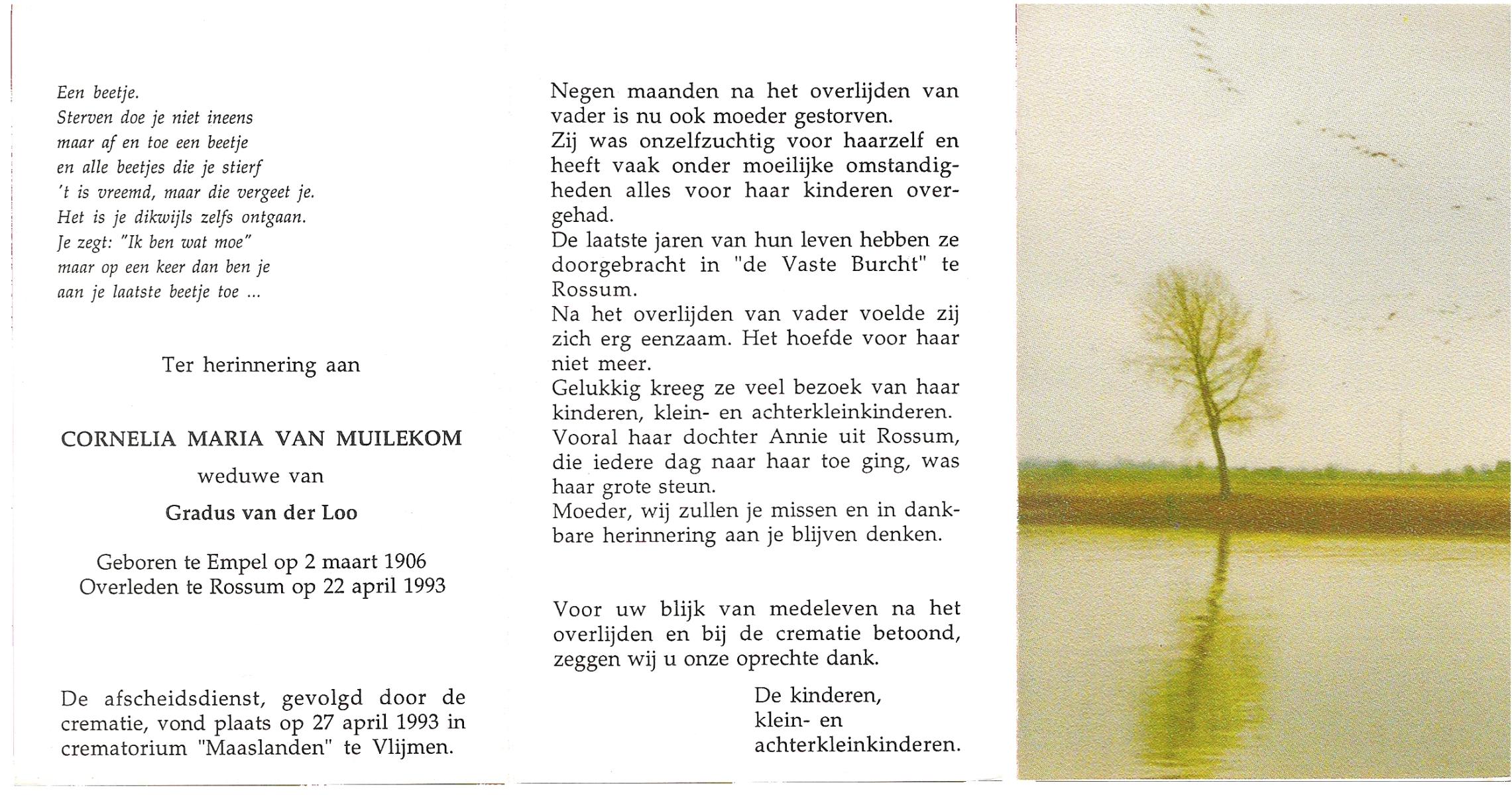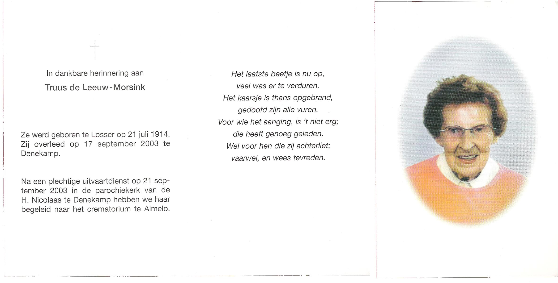 MULDER, Truus, geboren op 10-8-1922 te Oldenzaal, overleden op 18-1-1995 te Oldenzaal op 72-jarige leeftijd, gecremeerd op 23-1-1995 te Usselo.