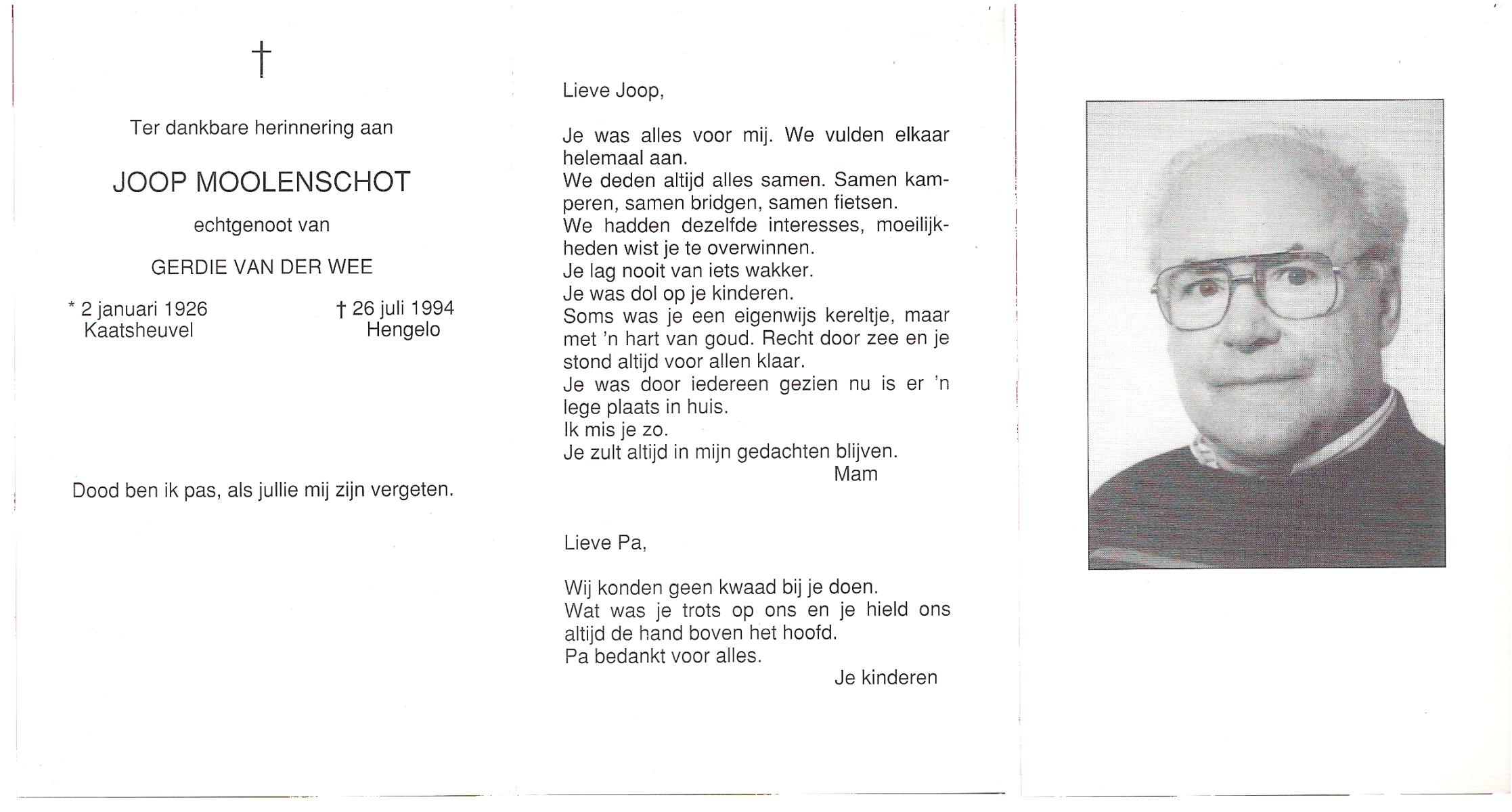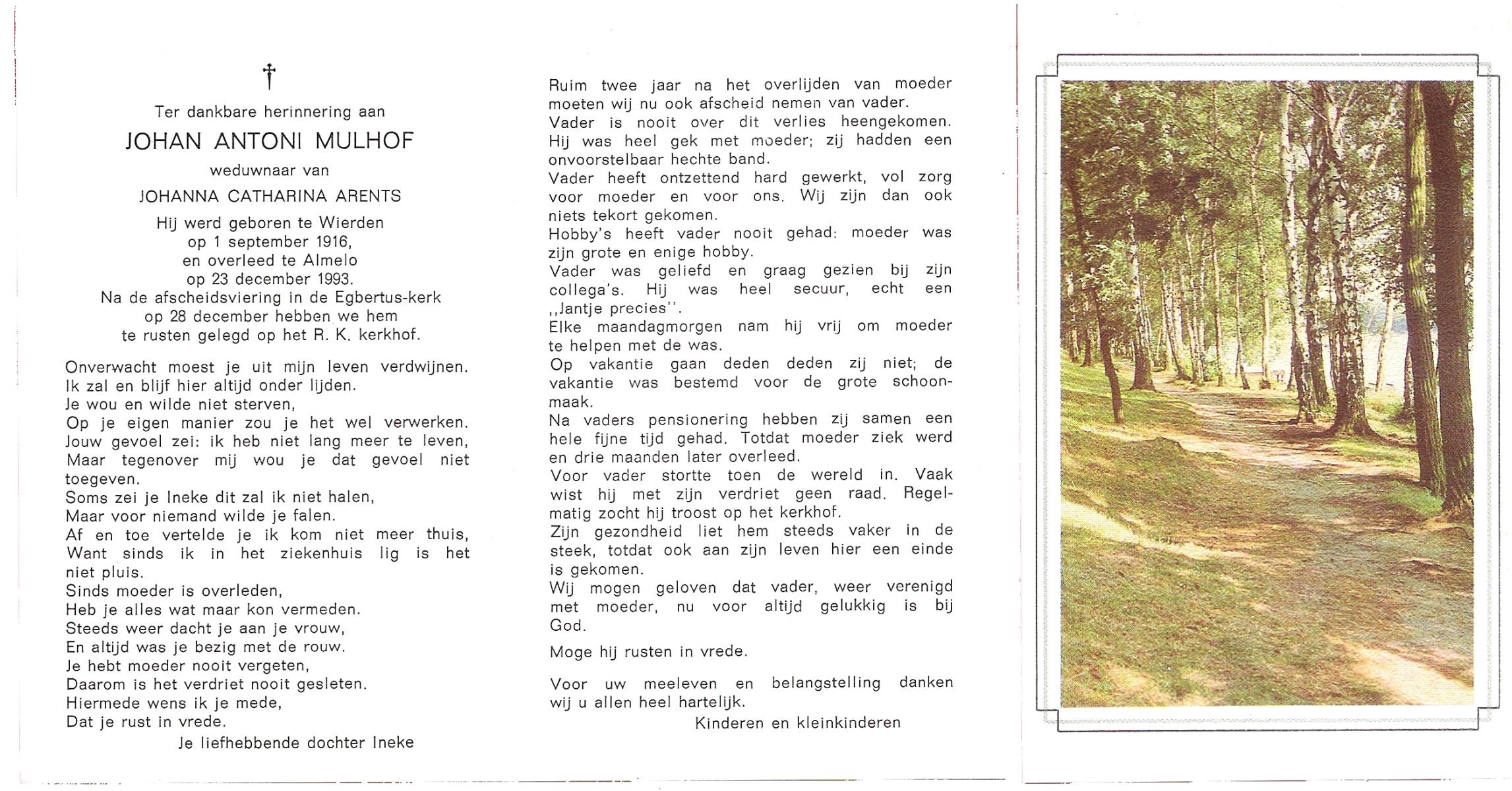 MULHOF, Johan Antoni, geboren op 1-9-1916 te Wierden, overleden op 23-12-1993 te Almelo op 77-jarige leeftijd, begraven op 28-12-1993 te Almelo.