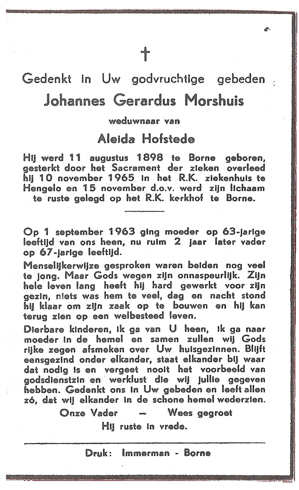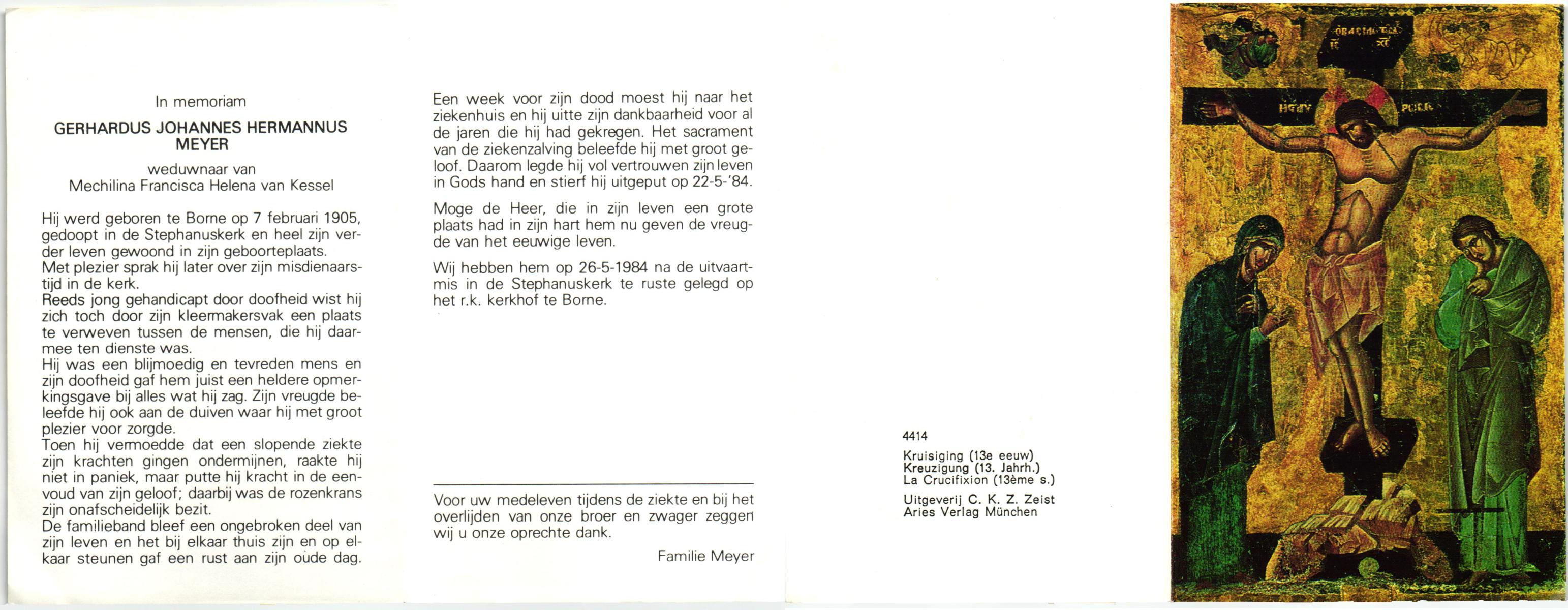 MEYER, Gerhardus Johannes Hermannus, geboren op 7-2-1905 te Borne, overleden op 22-5-1984 op 79-jarige leeftijd, begraven op 26-5-1984 te Borne.