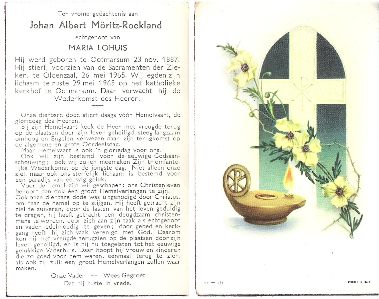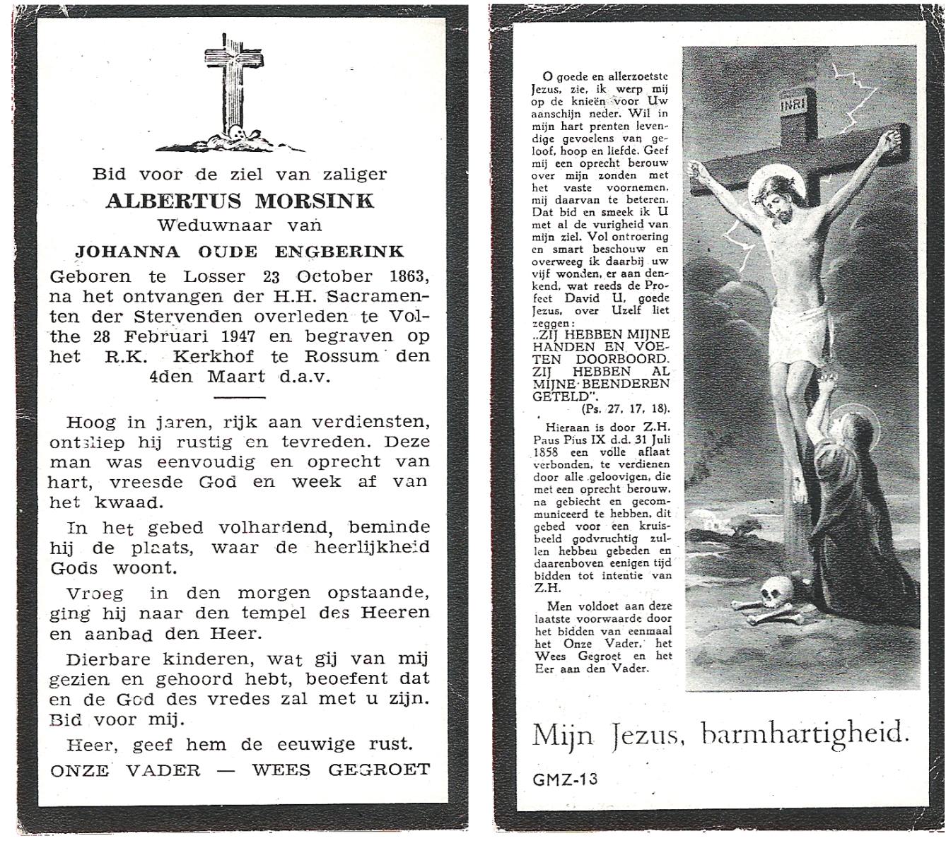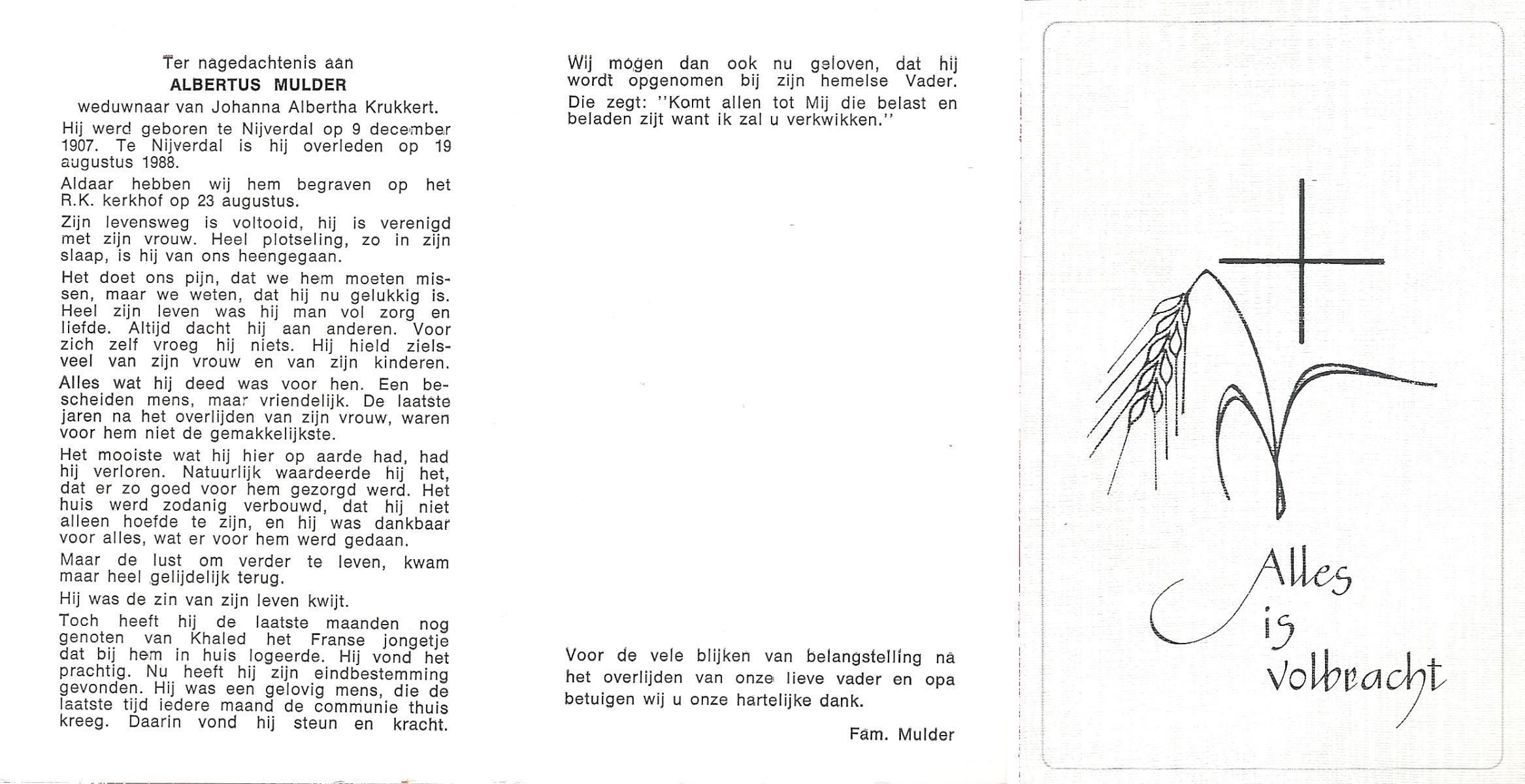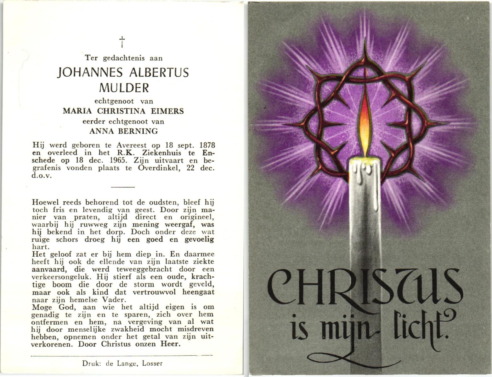 MULDER, Johannes Albertus, geboren op 18-09-1878 te Avereest, overleden op 18-12-1965 te Enschede, ziekenhuis op 87-jarige leeftijd, begraven op 22-12-1965 te Overdinkel.
