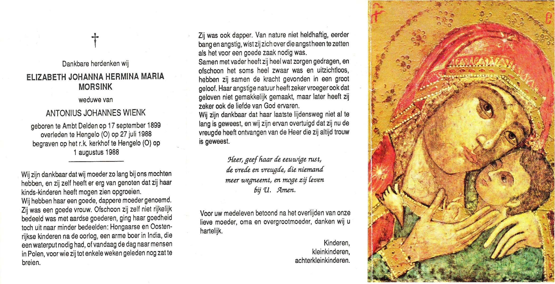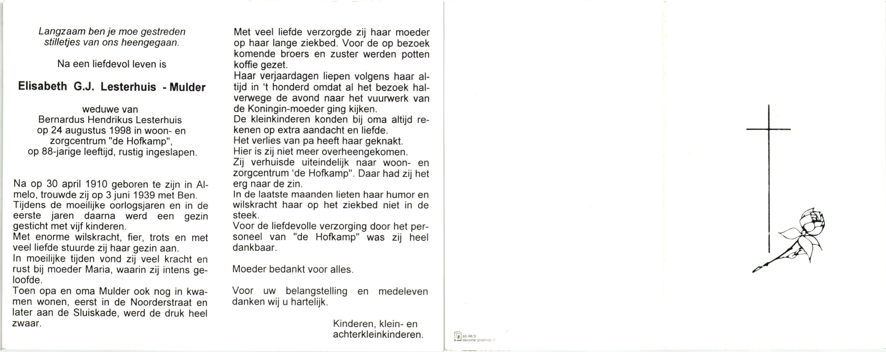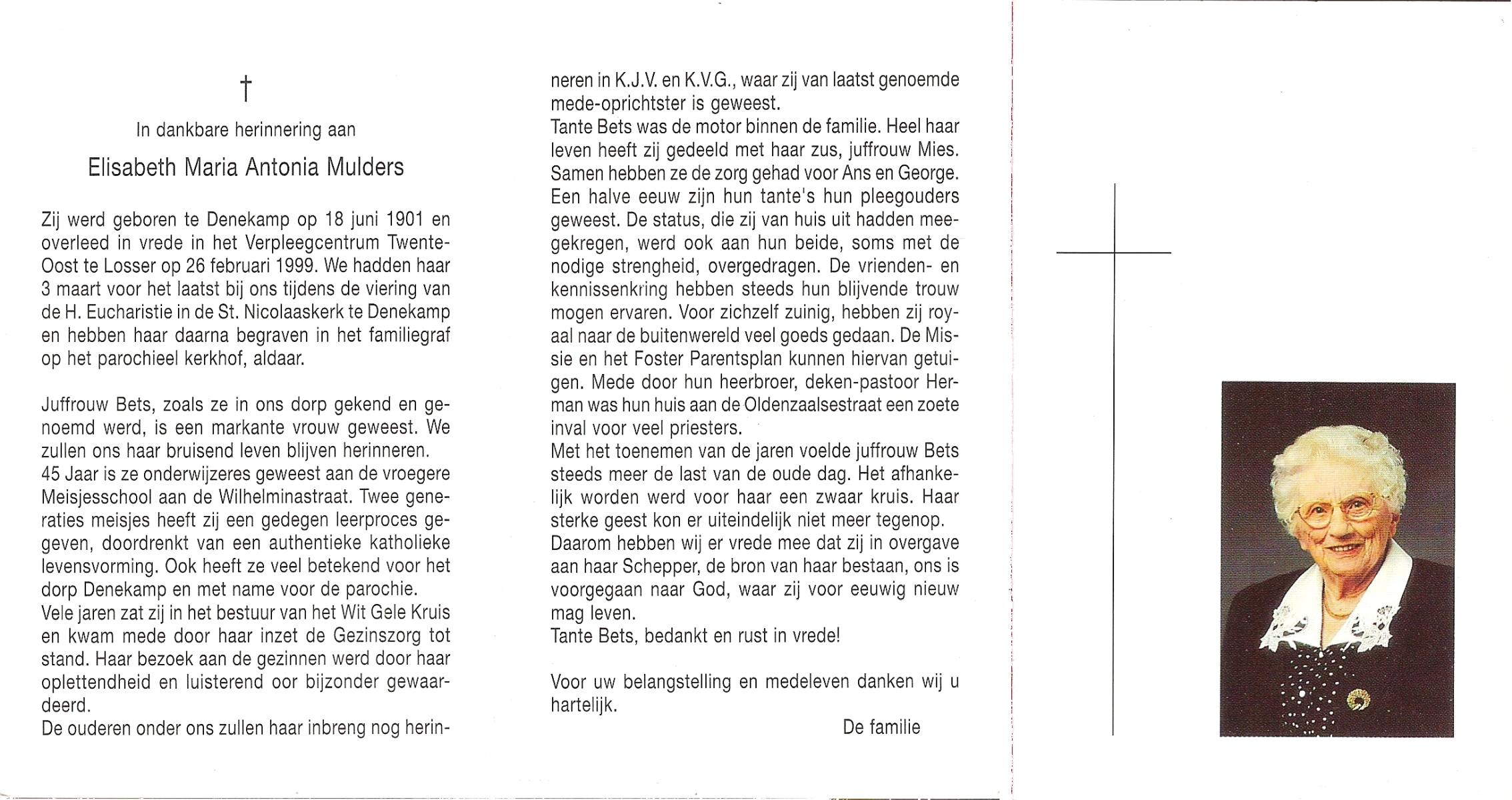 MULDERS, Elisabeth Maria Antonia, geboren op 18-6-1901 te Denekamp, overleden op 26-2-1999 te Losser op 97-jarige leeftijd, begraven op 3-3-1999 te Denekamp.