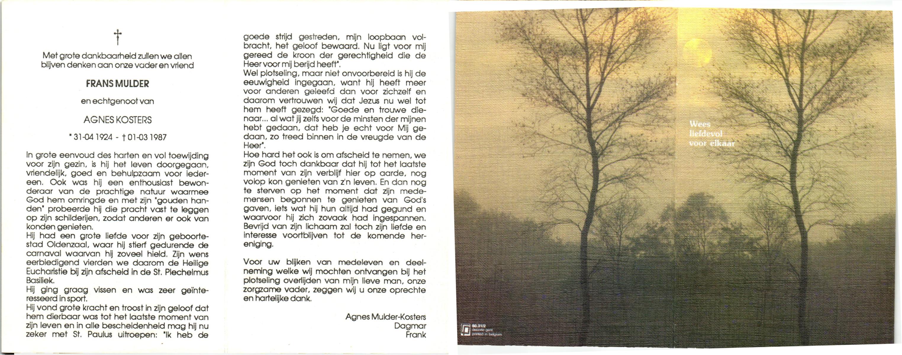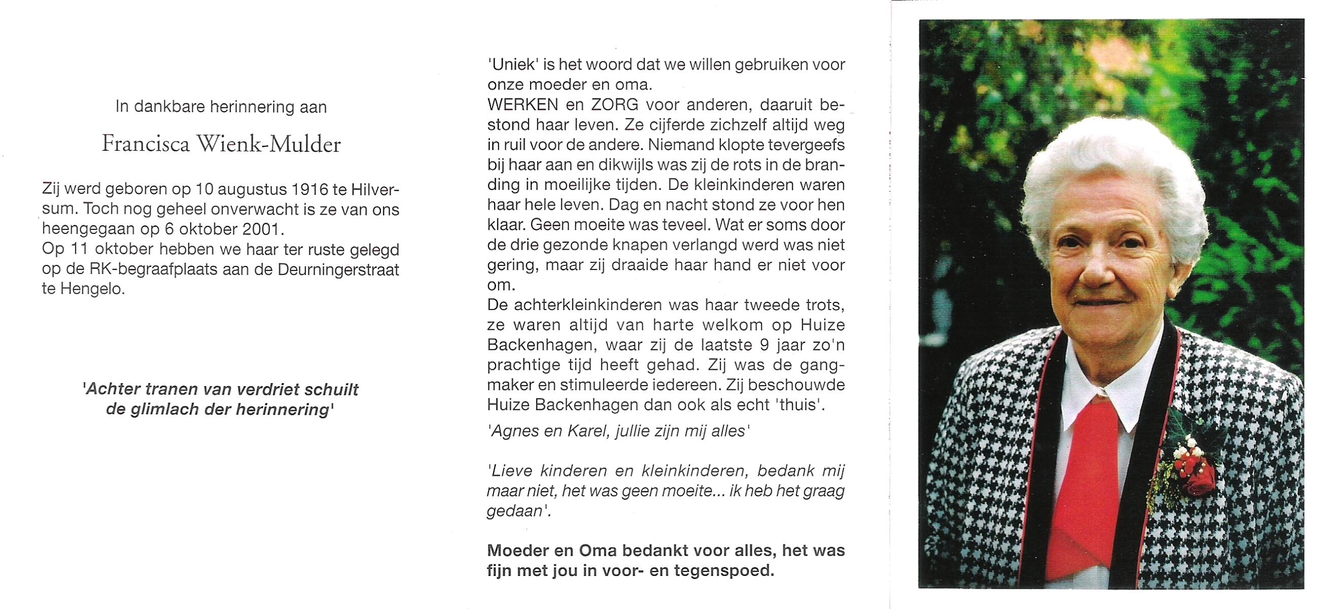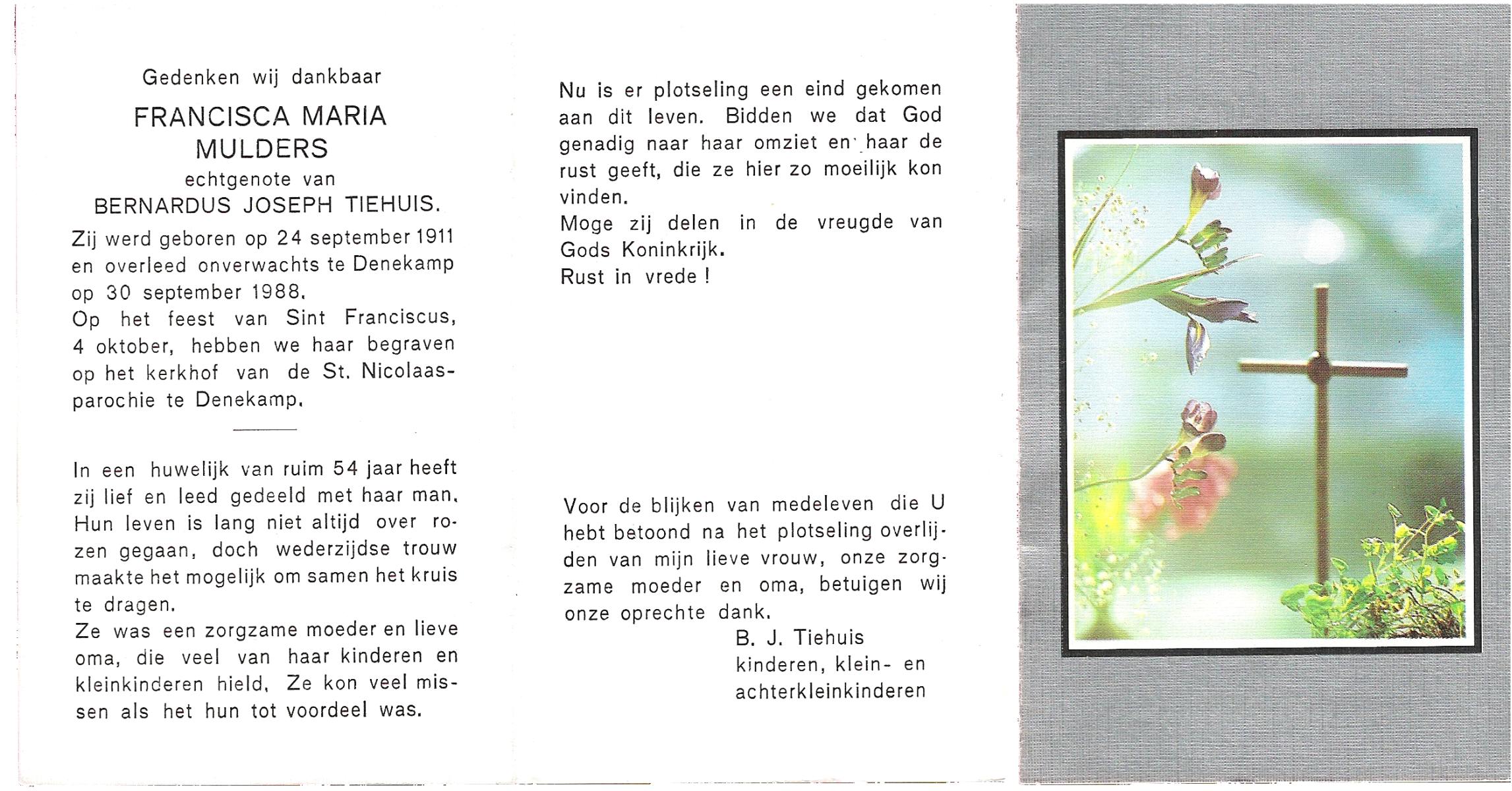 MULDERS, Francisca Maria, geboren op 24-9-1911, overleden op 30-9-1988 te Denekamp op 77-jarige leeftijd, begraven op 4-10-1988 te Denekamp.