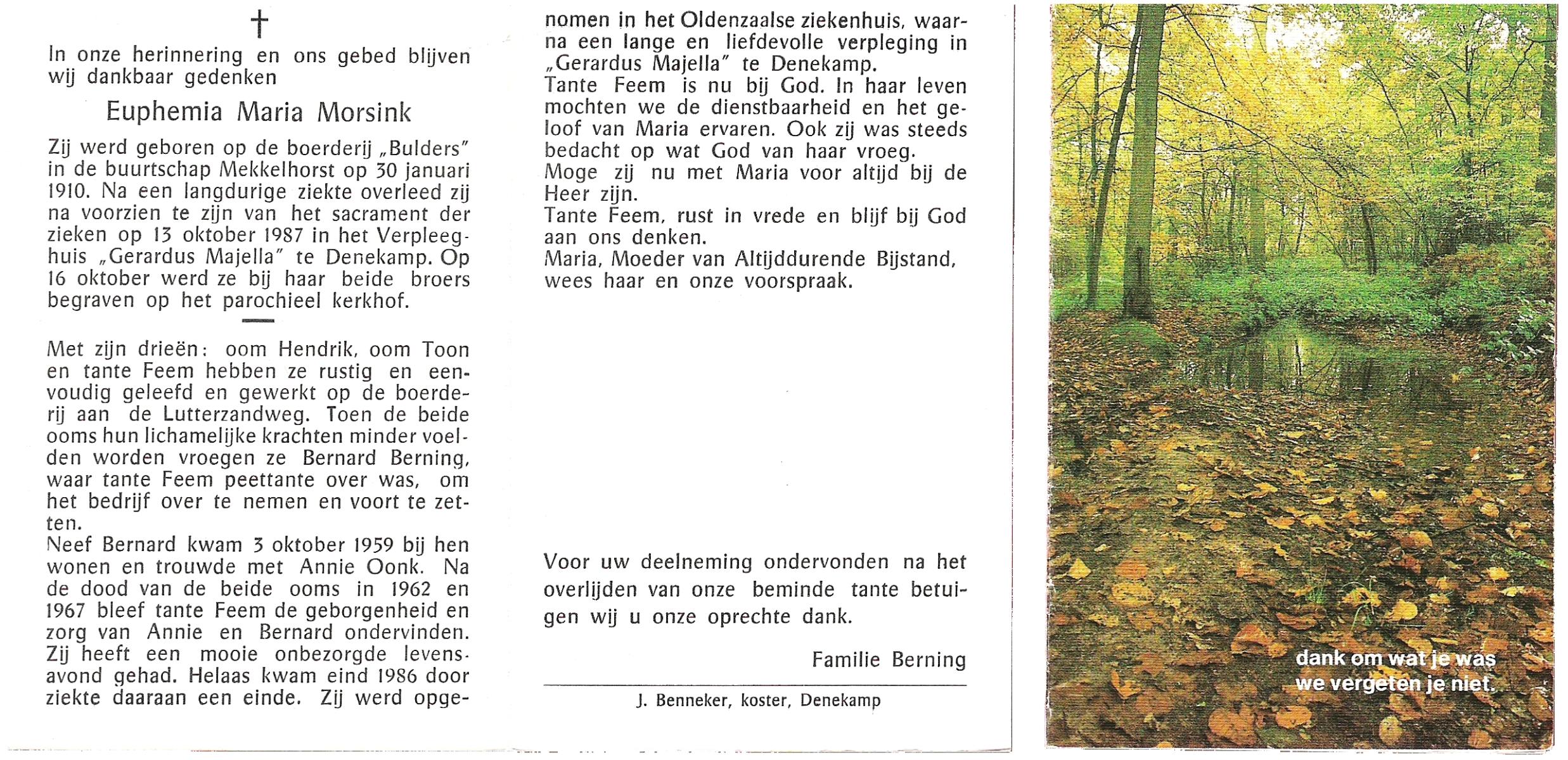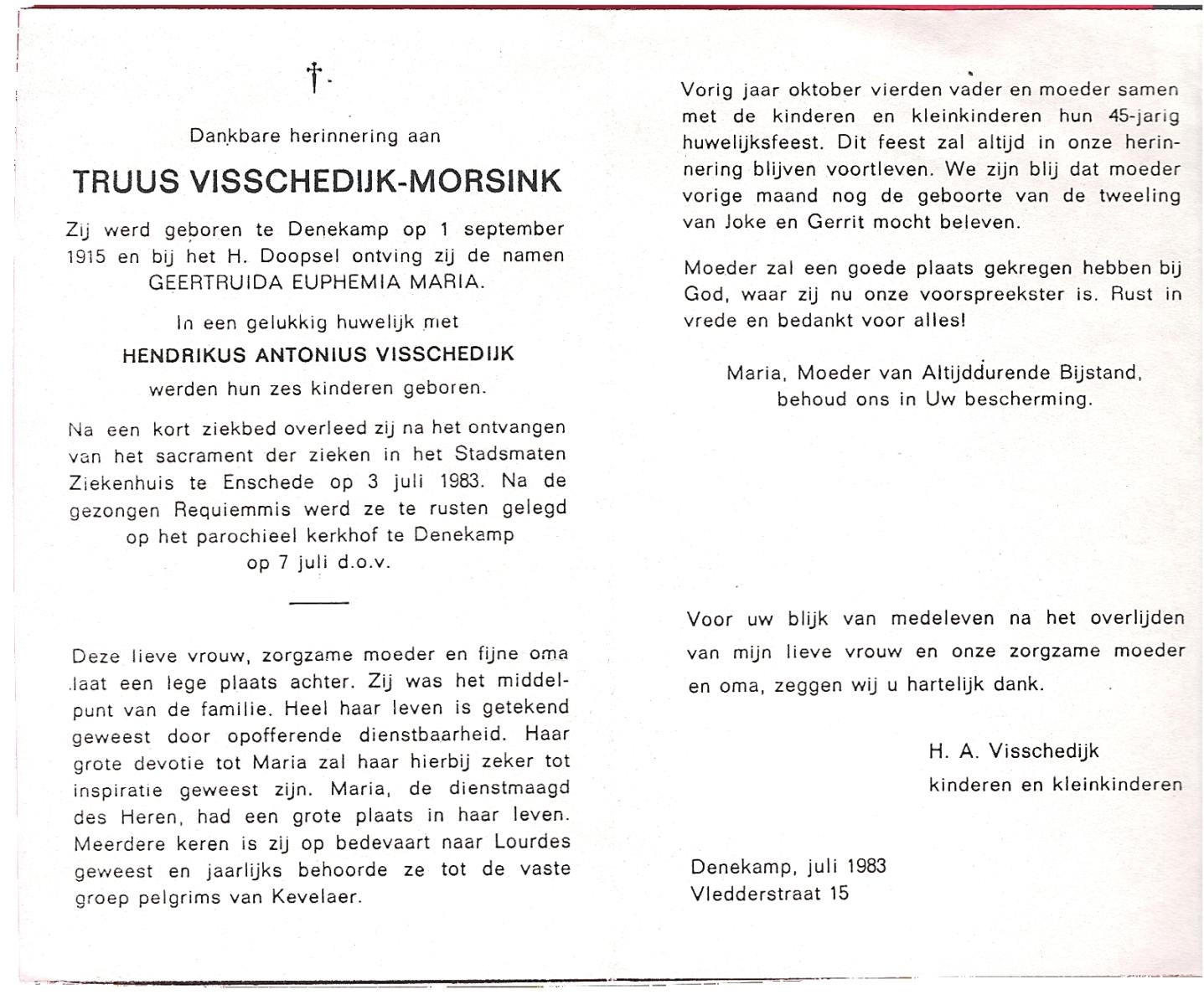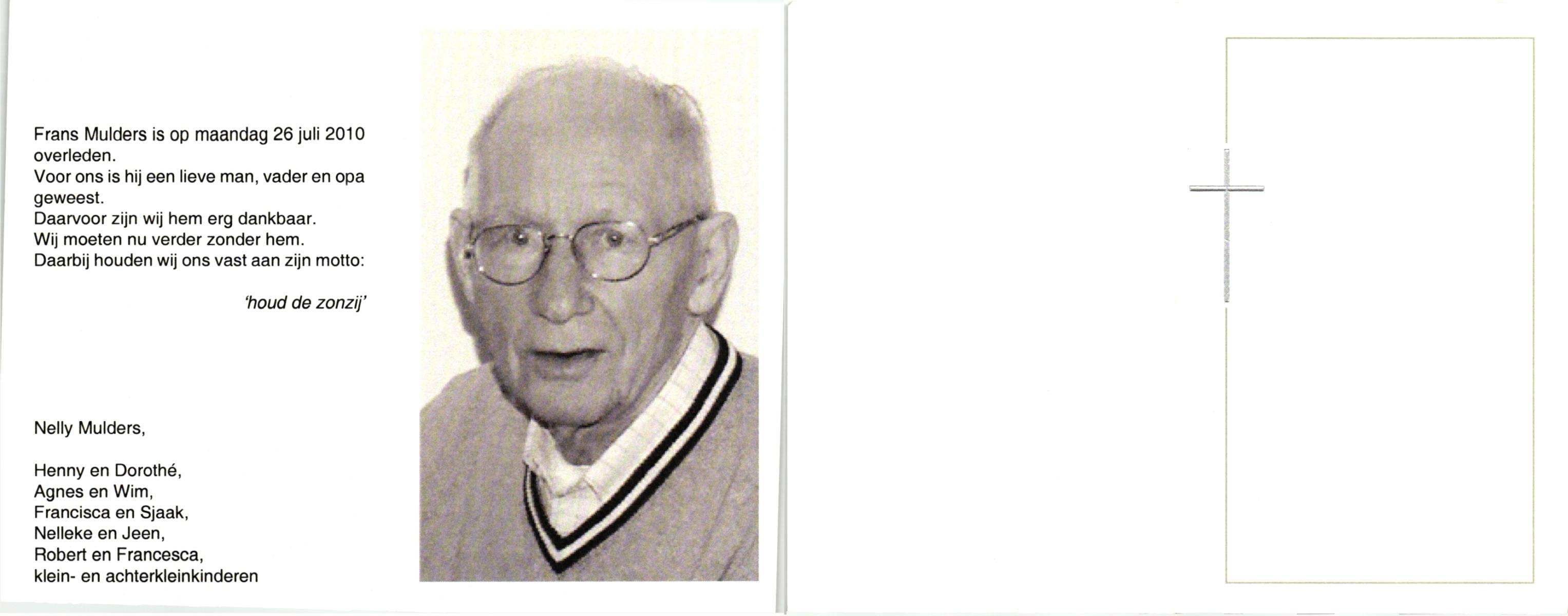 MULDERS, Francisca Maria, geboren op 24-9-1911, overleden op 30-9-1988 te Denekamp op 77-jarige leeftijd, begraven op 4-10-1988 te Denekamp.