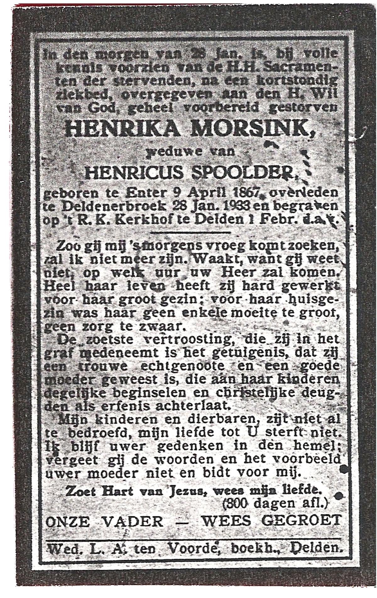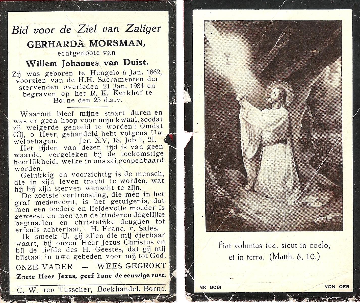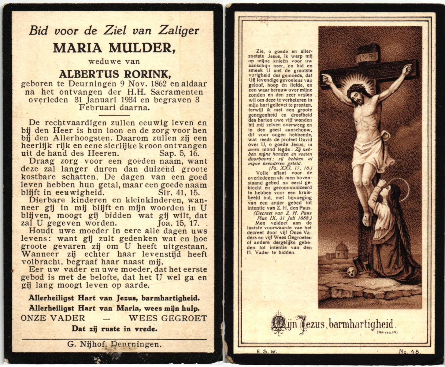 MULDER, Maria, geboren op 09-11-1862 te Deurningen, overleden op 31-1-1934 te Deurningen op 71-jarige leeftijd, begraven op 3-2-1934 te Deurningen.