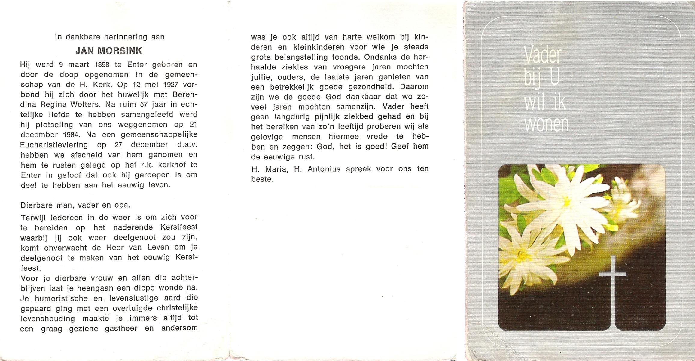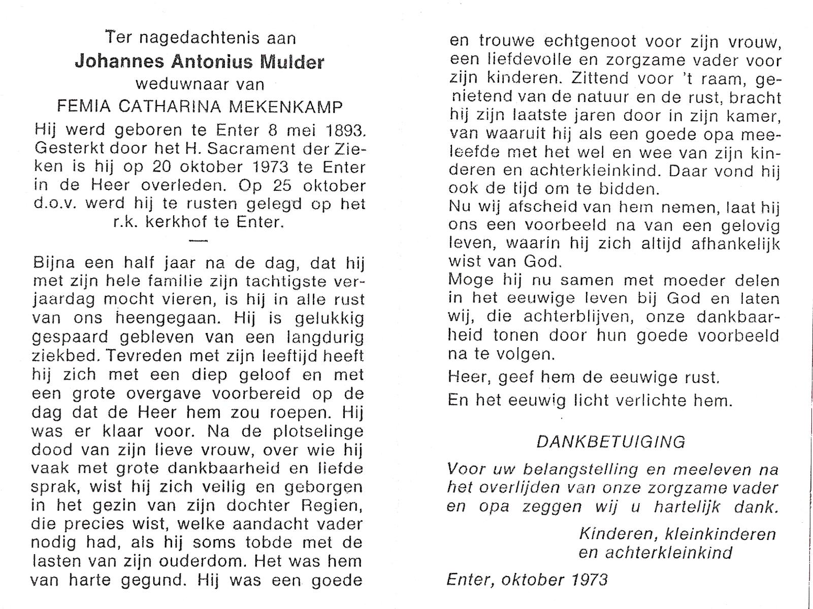 MULDER, Johannes Antonius, geboren op 08-05-1893 te Enter, overleden op 20-10-1973 te Enter op 80-jarige leeftijd, begraven op 25-10-1973 te Enter.