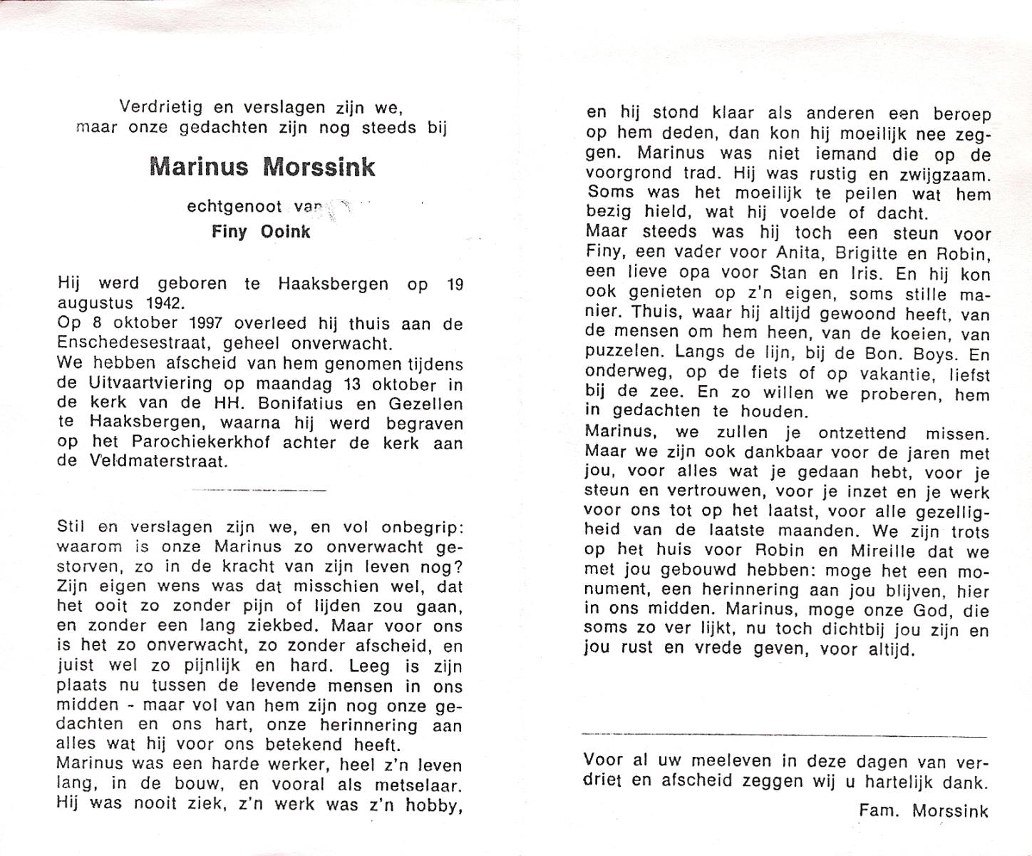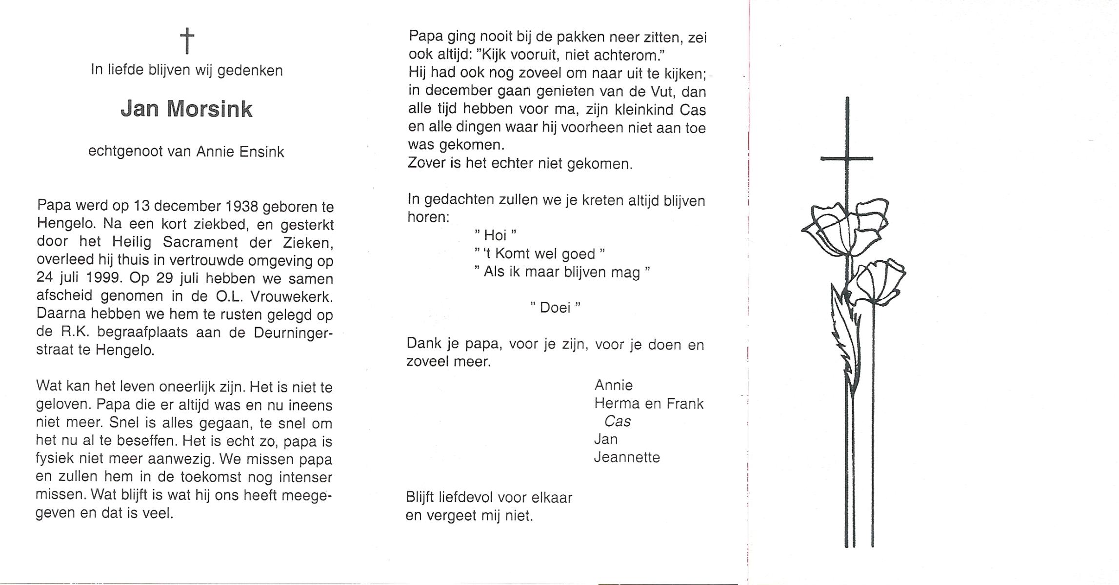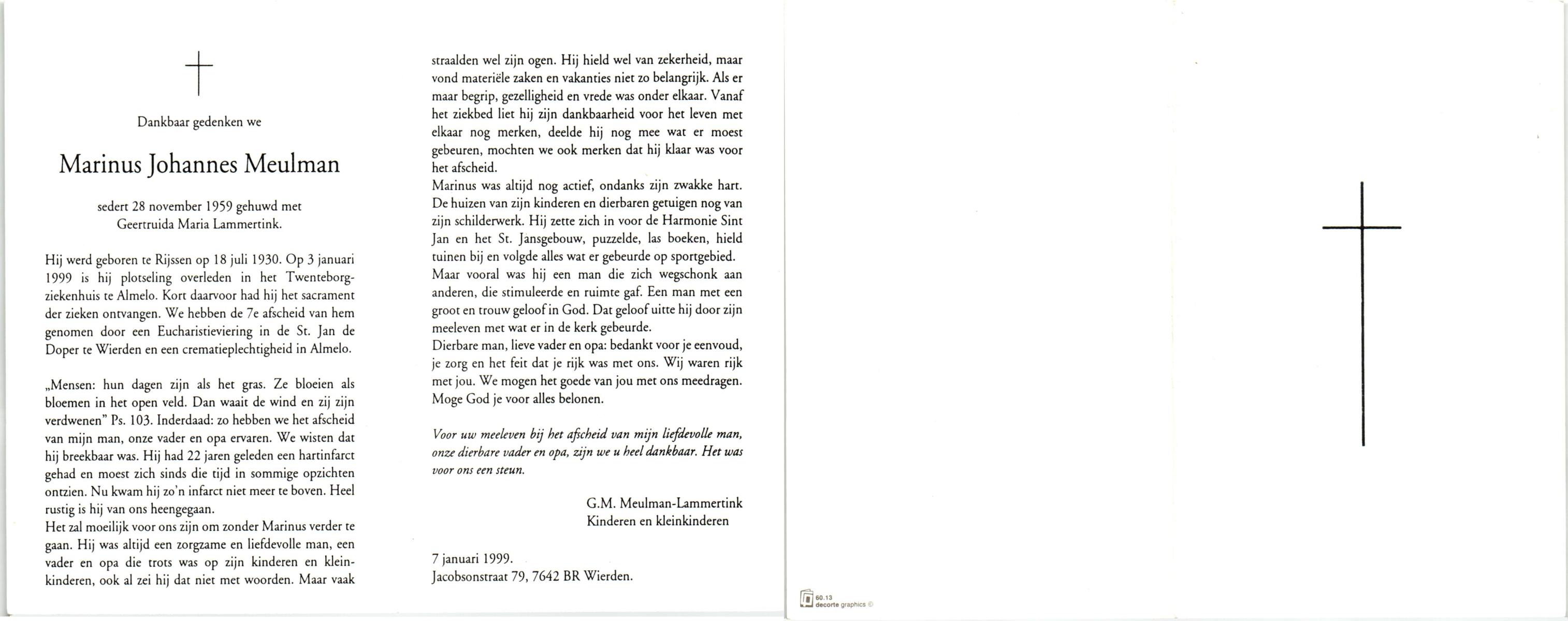 MEULMAN, Marinus Johannes, geboren op 18-7-1930 te Rijssen, overleden op 3-1-1999 te Almelo, ziekenhuis op 68-jarige leeftijd, gecremeerd op 7-1-1999 te Almelo.