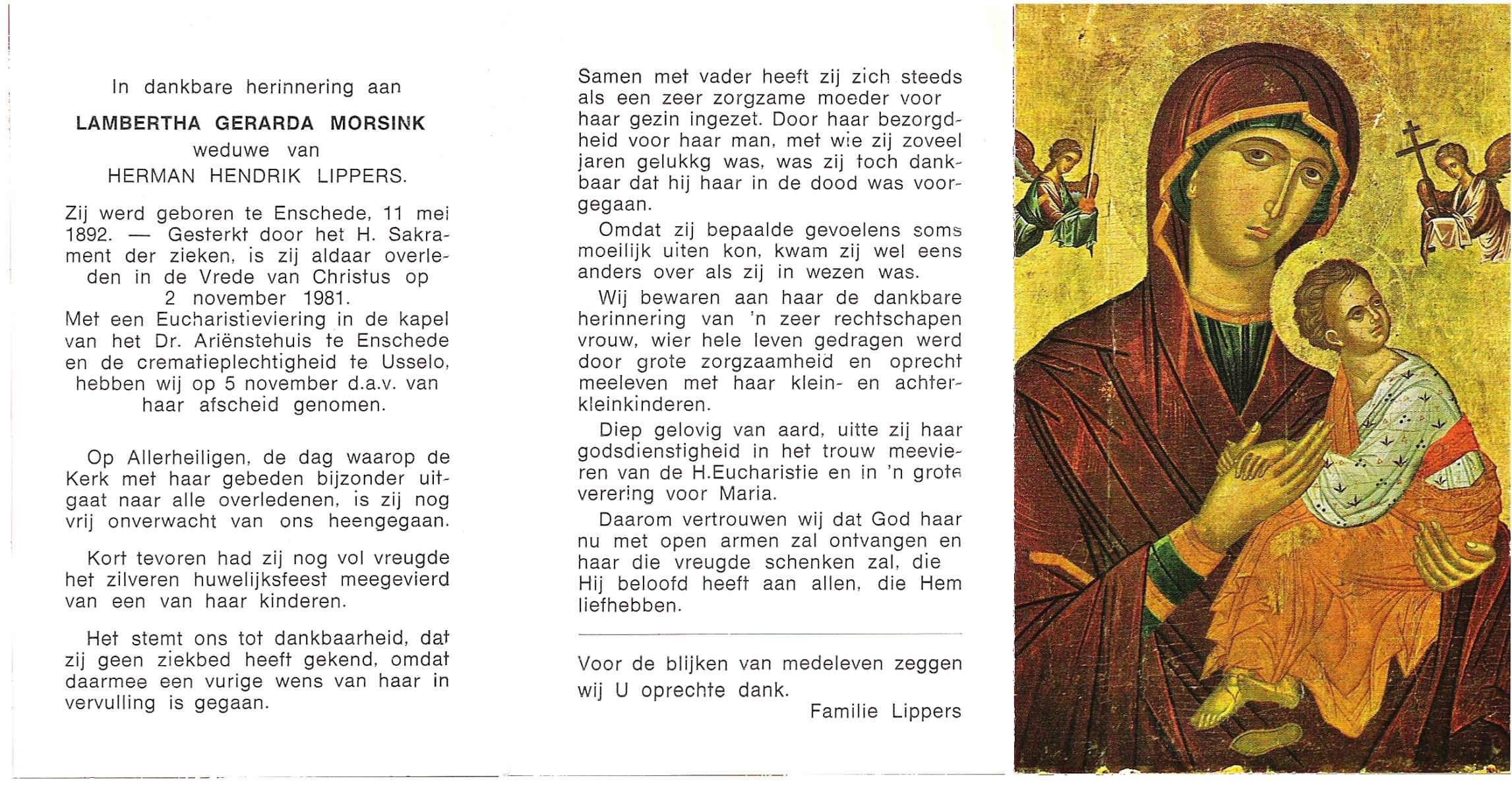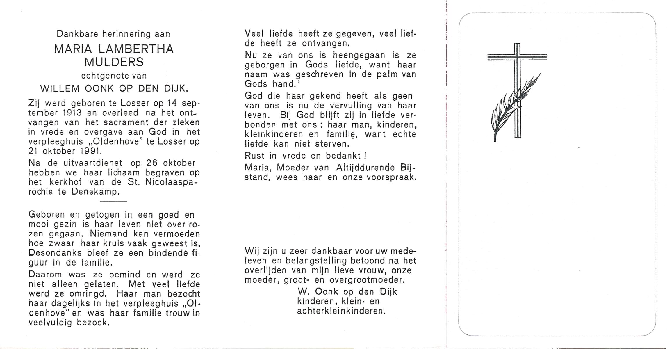 MULDERS, Maria Lambertha, geboren op 14-9-1913 te Losser, overleden op 21-10-1991 te Losser op 78-jarige leeftijd, begraven op 26-10-1991 te Denekamp.