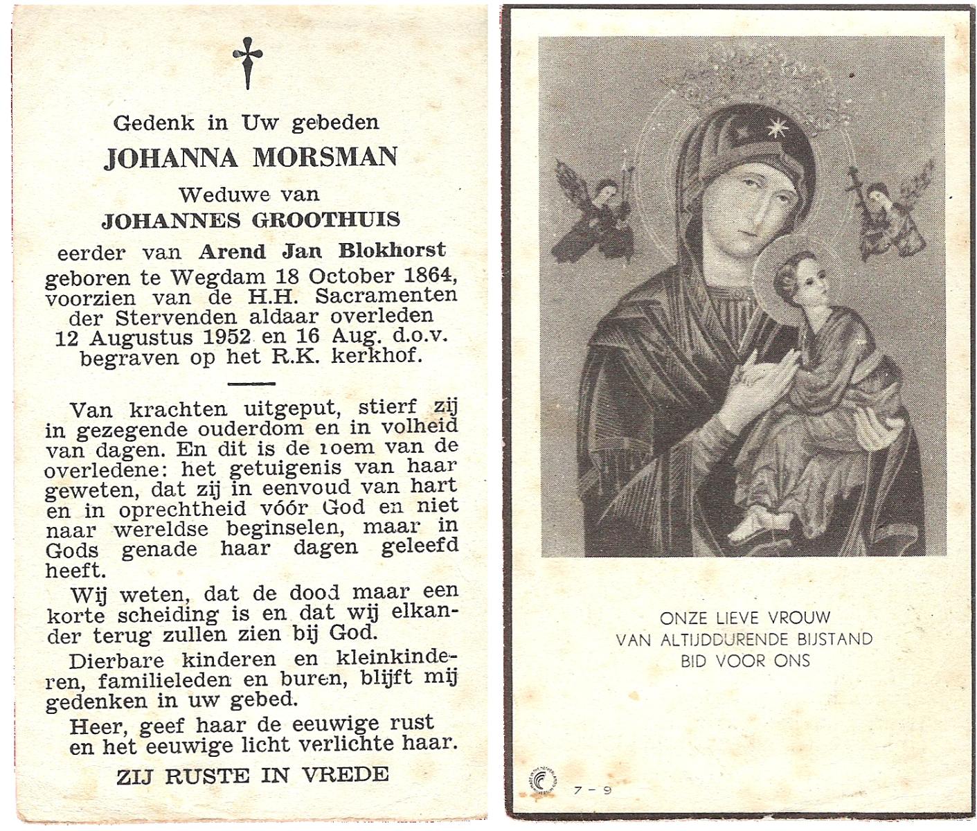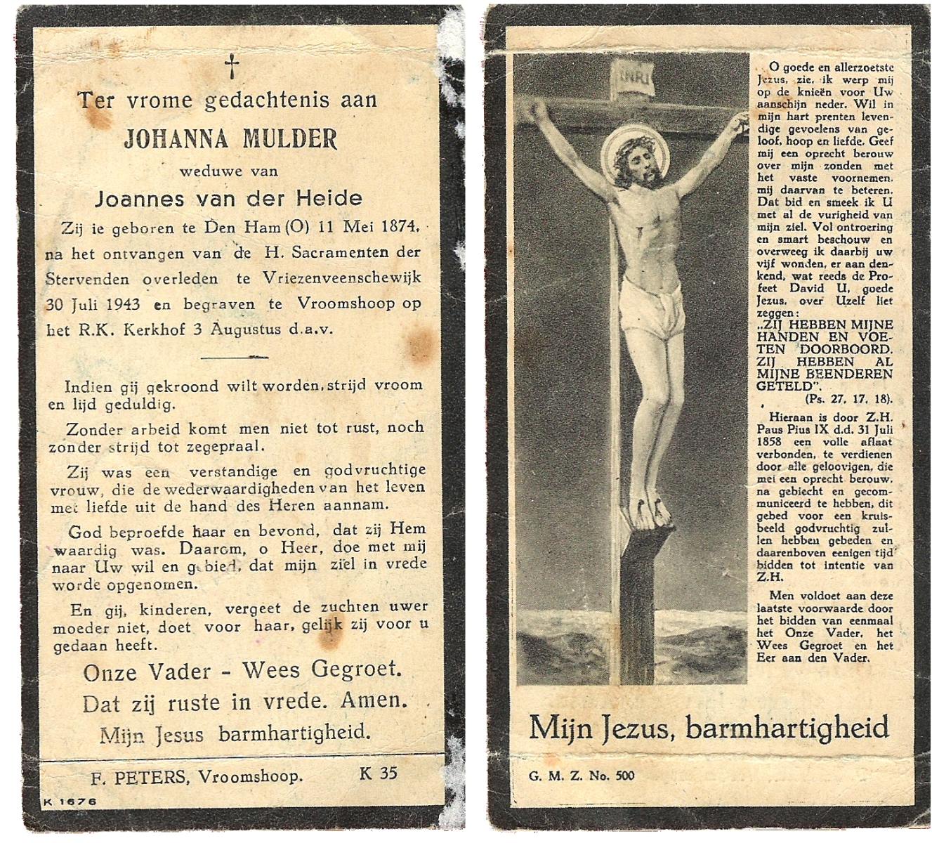 MULDER, Johanna, geboren op 11-05-1874 te Den Ham, overleden op 30-7-1943 te Vriezenveensewijk op 69-jarige leeftijd, begraven op 3-8-1943 te Vroomshoop.
