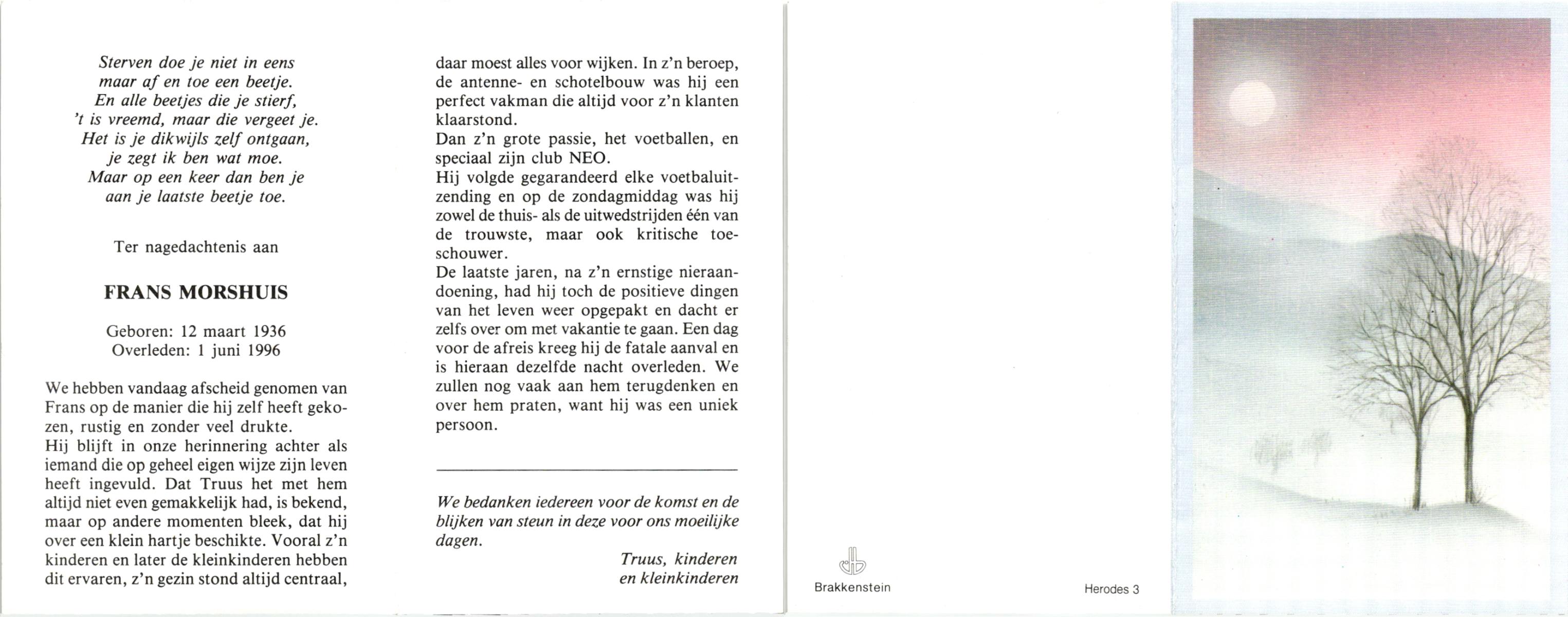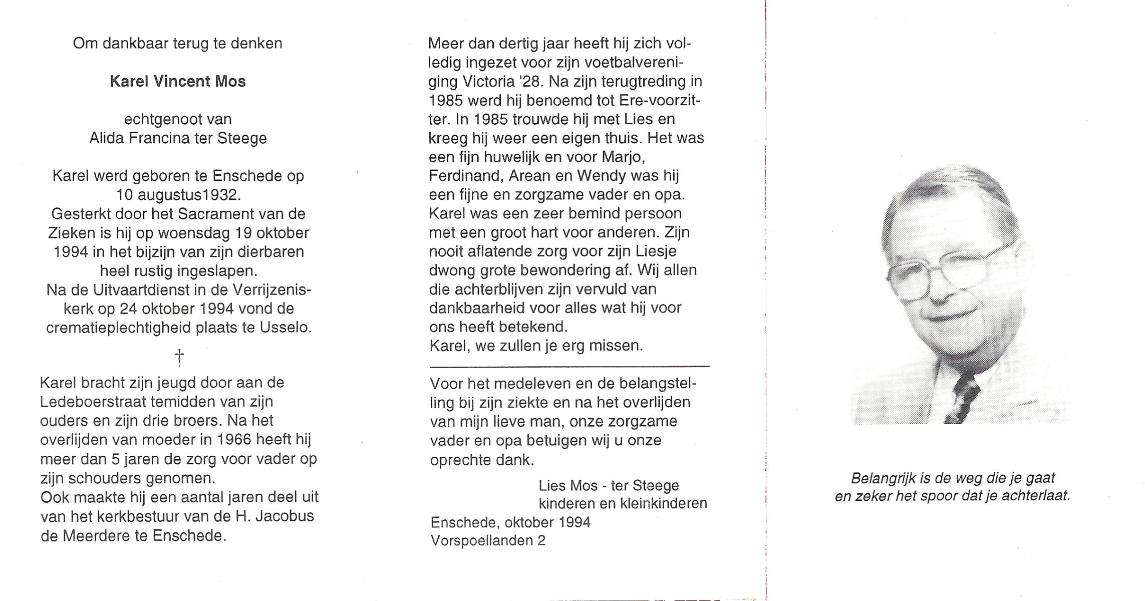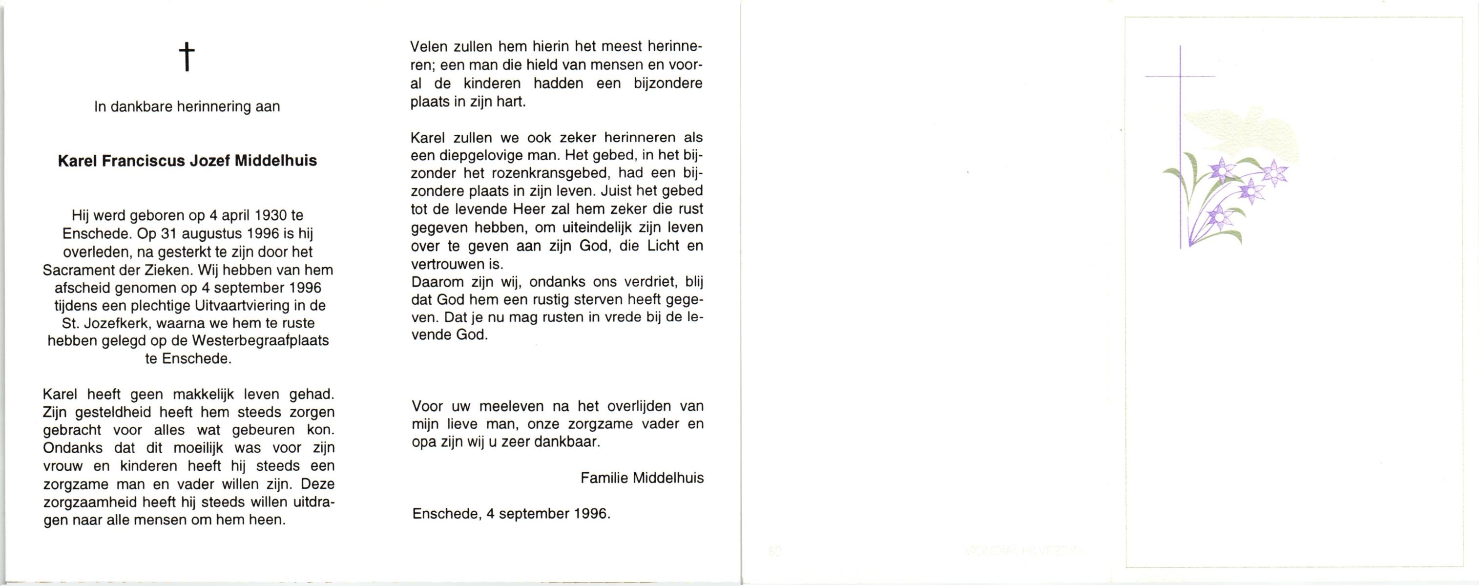 MIDDELHUIS, Karel Franciscus Jozef, geboren op 4-4-1930 te Enschede, overleden op 31-8-1996 op 66-jarige leeftijd, begraven op 4-9-1996 te Enschede.