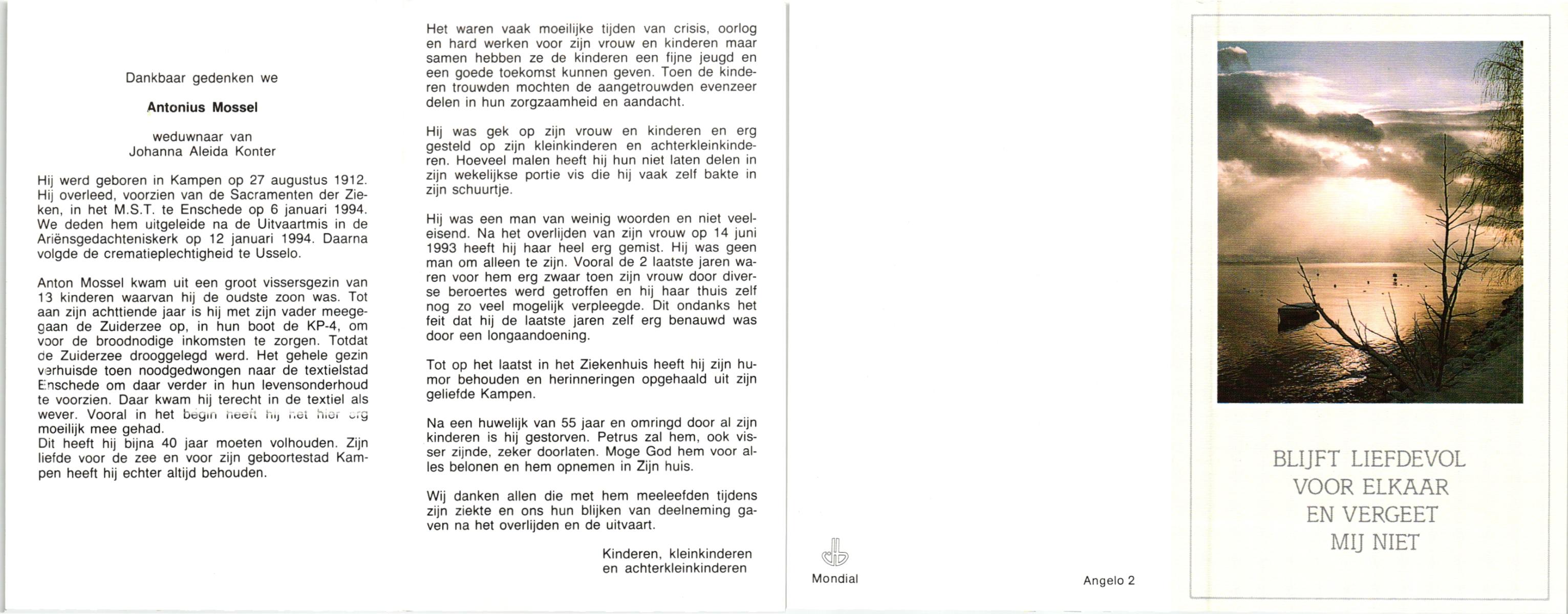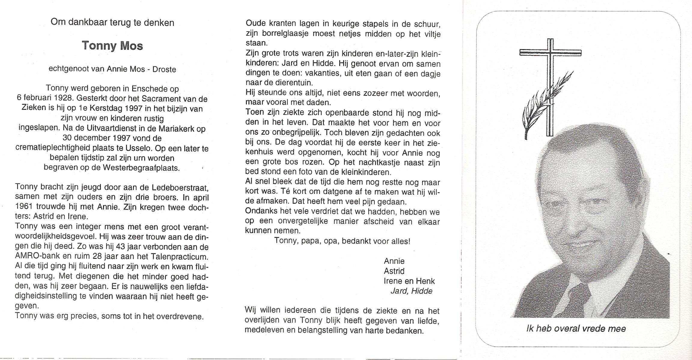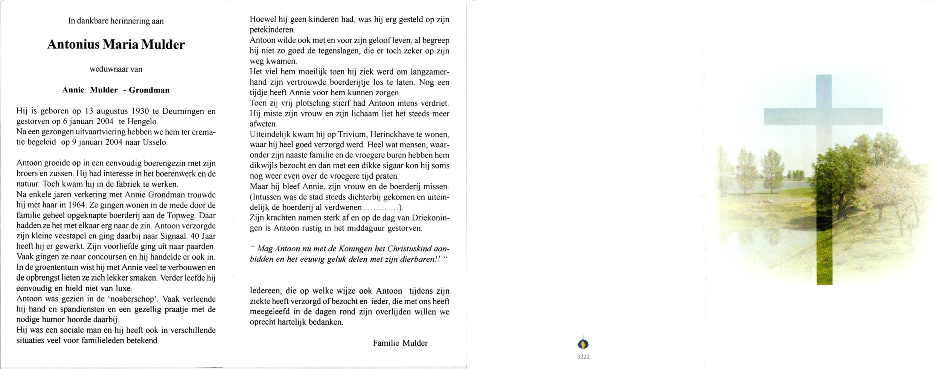 MULDER, , Antonius Maria, geboren op 13-8-1930 te Deurningen, overleden op 6-1-2004 te Hengelo (O) op 73-jarige leeftijd, gecremeerd op 9-1-2004 te Usselo.