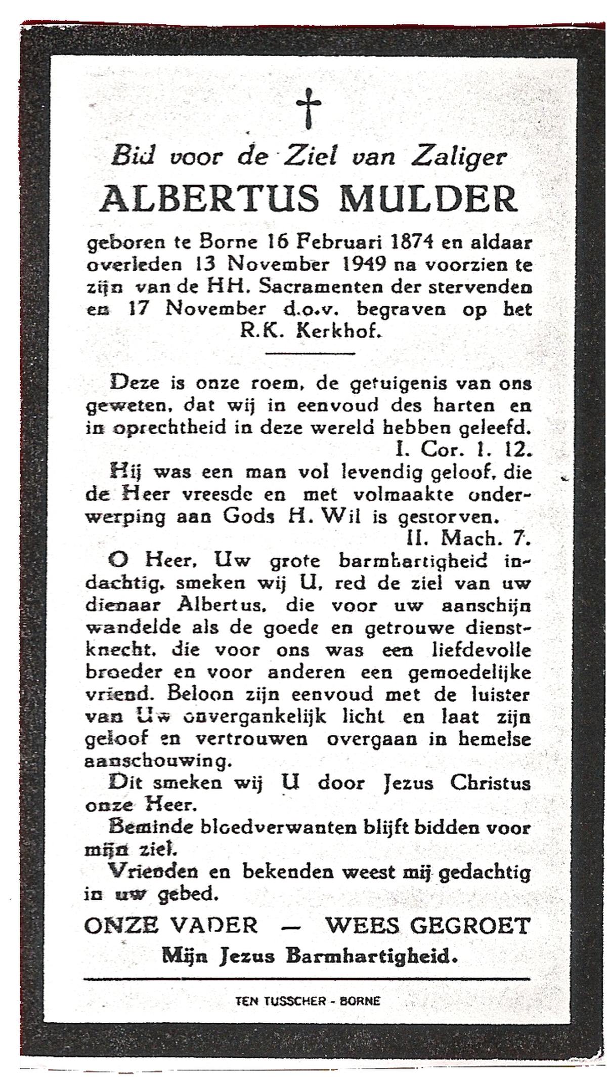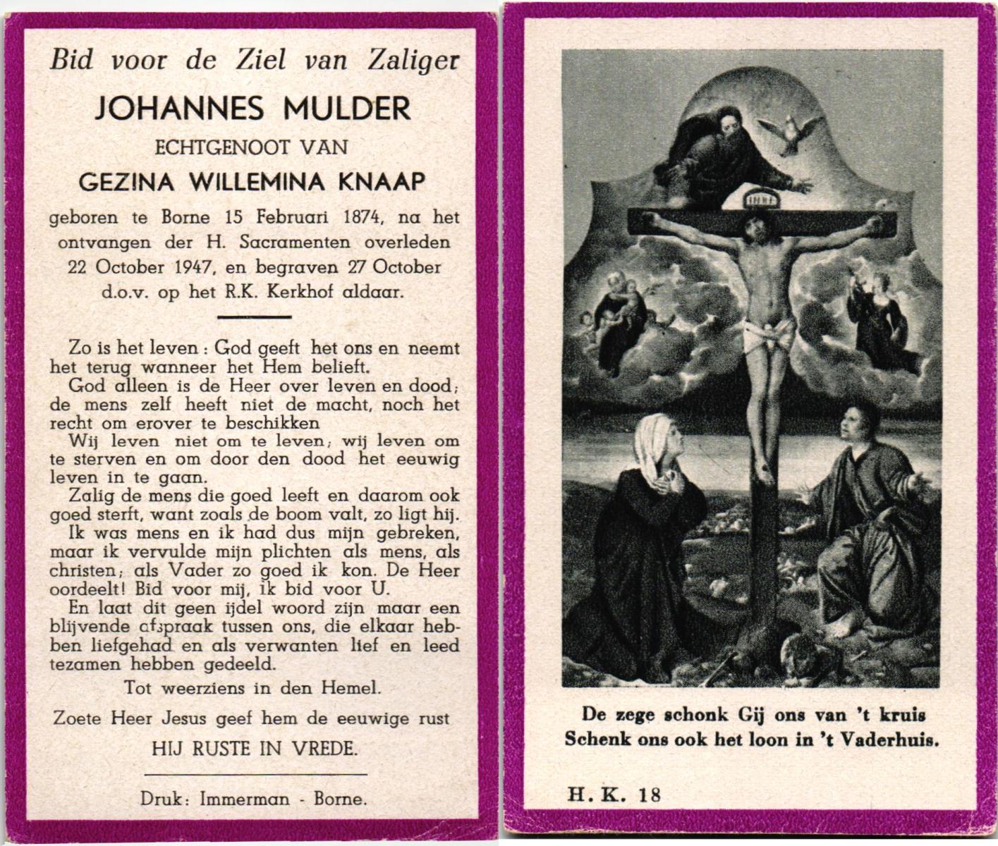 MULDER, Johannes, geboren op 15-02-1874 te Borne, overleden op 22-10-1947 te Borne op 73-jarige leeftijd, begraven op 27-10-1947 te Borne.