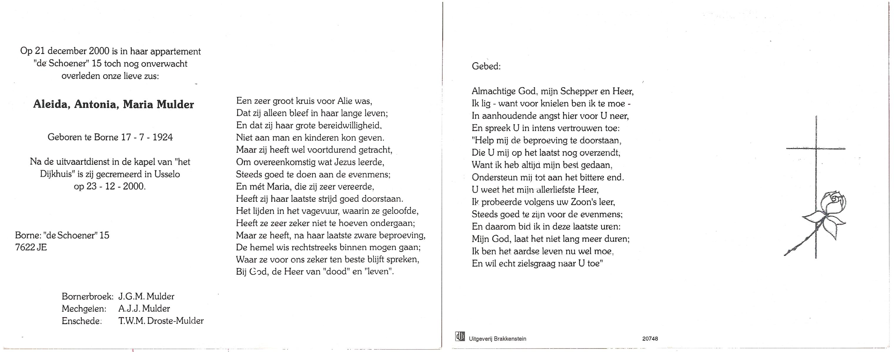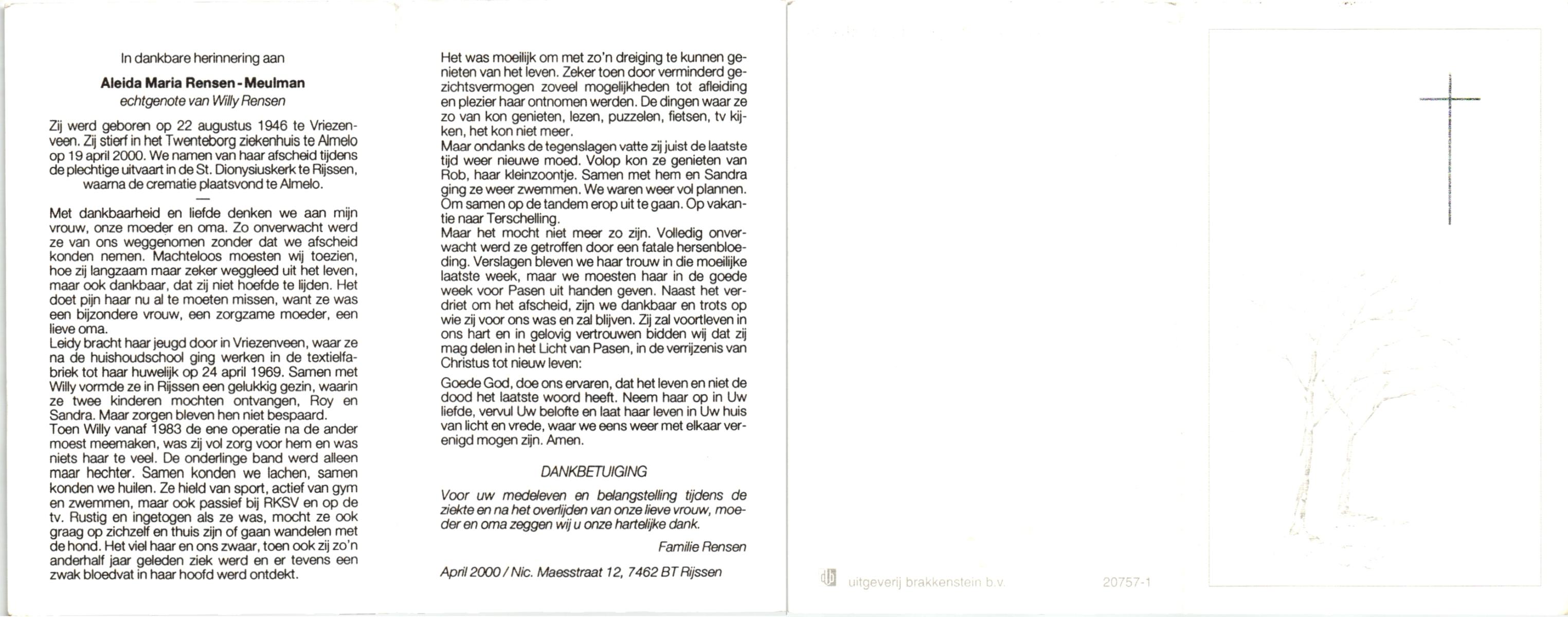 MEULMAN, , Aleida Maria, geboren op 22-8-1946 te Vriezenveen, overleden op 19-4-2000 te Almelo op 53-jarige leeftijd, gecremeerd te Almelo.