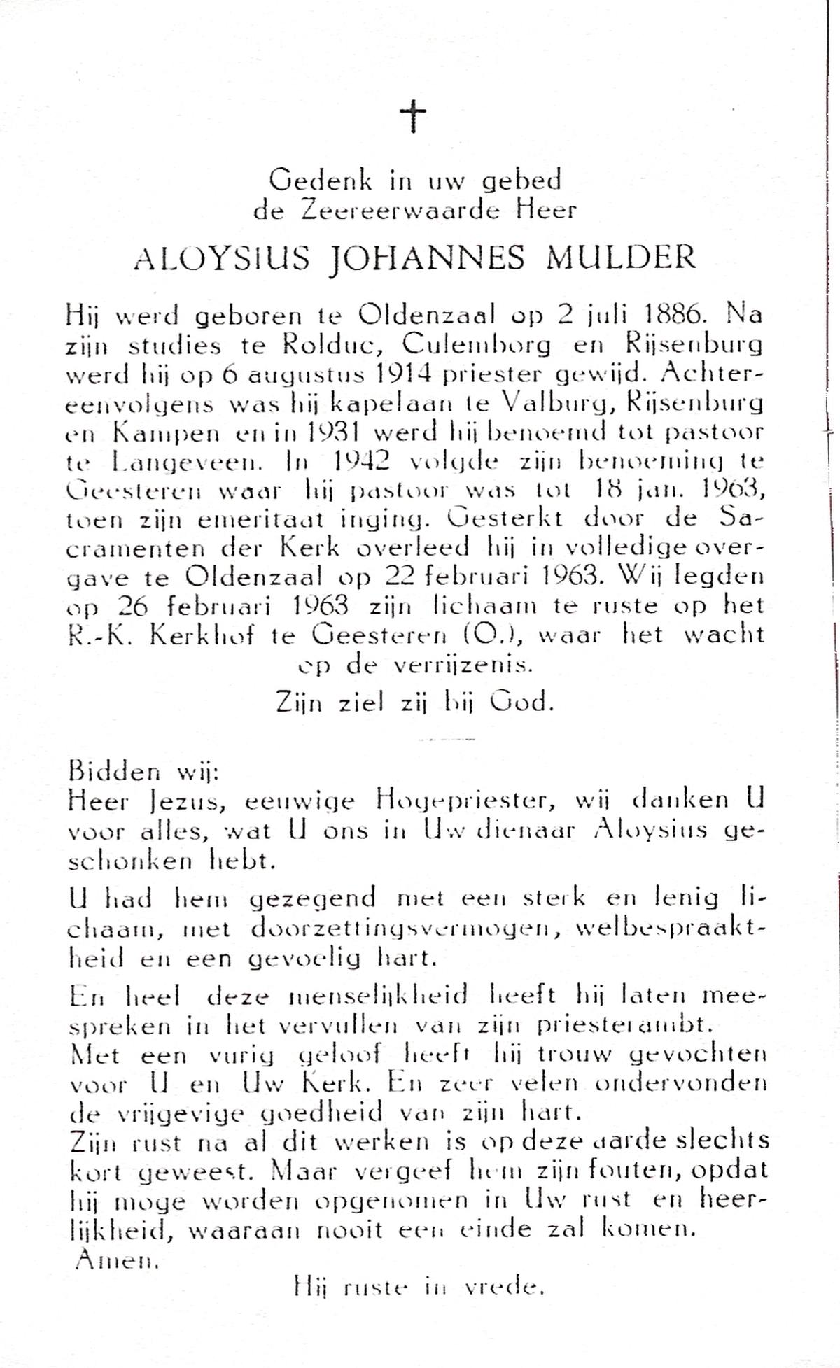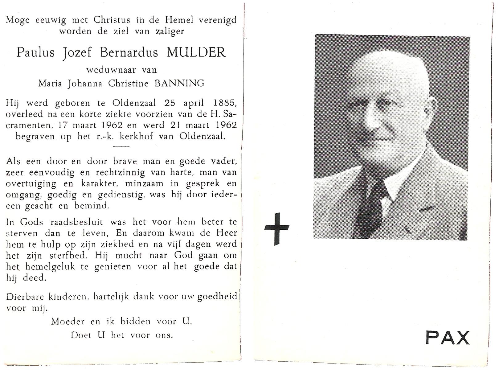 MULDER, Paulus Jozef Bernardus, geboren op 25-04-1885 te Oldenzaal, overleden op 17-3-1962 op 66-jarige leeftijd, begraven op 21-3-1962 te Oldenzaal R.K.kekrhof.