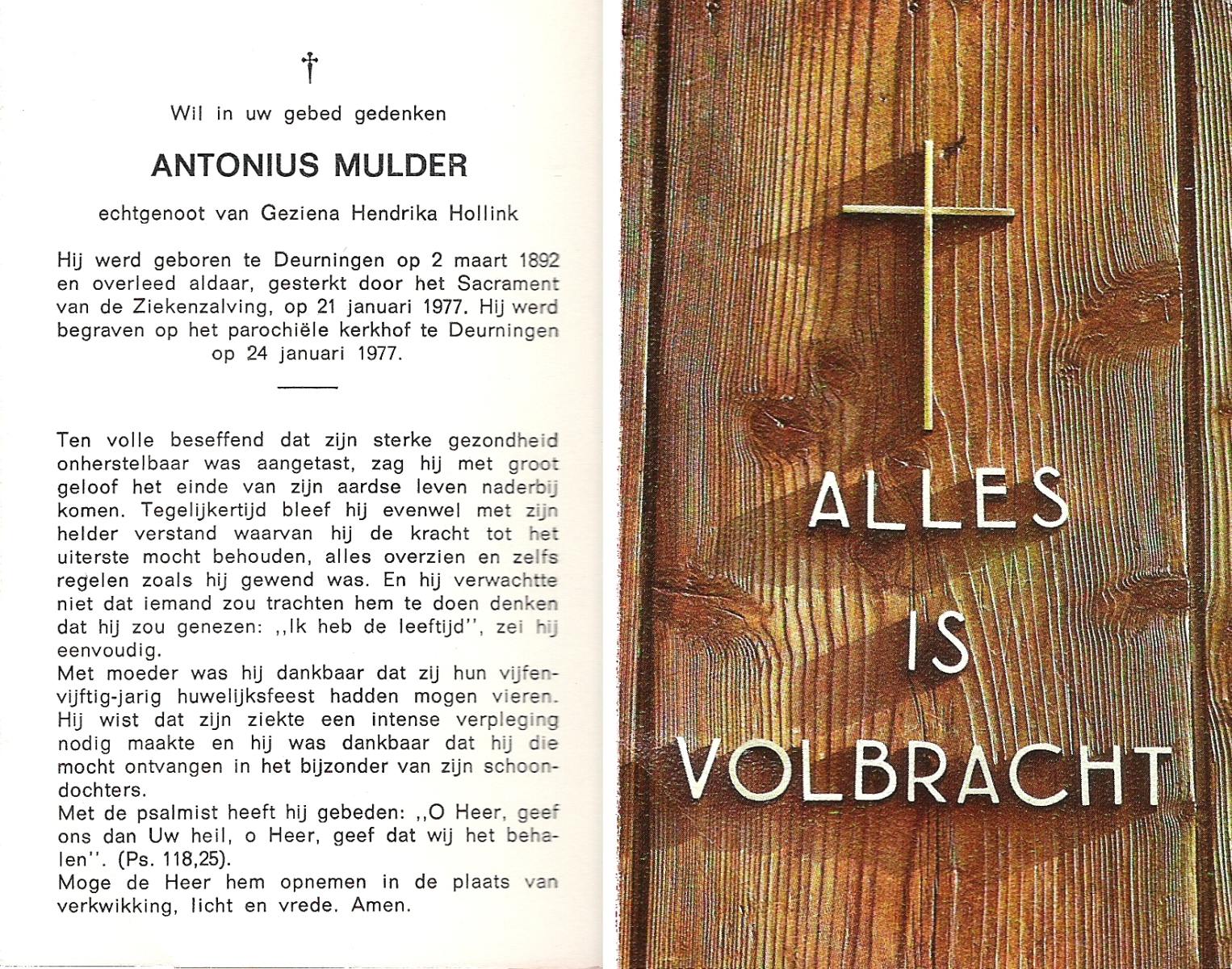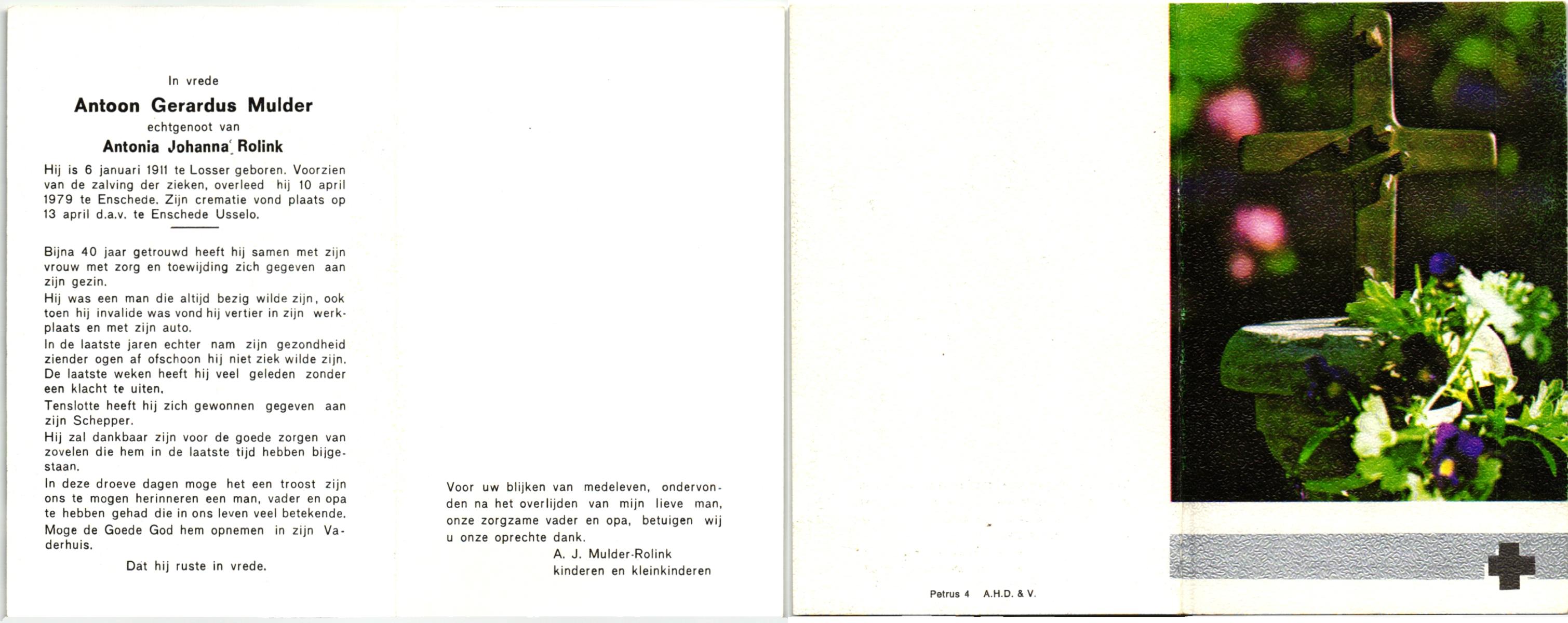 MULDER, , Antoon Gerardus, geboren op 6-1-1911 te Losser, overleden op 10-4-1979 te Enschede op 68-jarige leeftijd, gecremeerd op 13-4-1979 te Usselo.