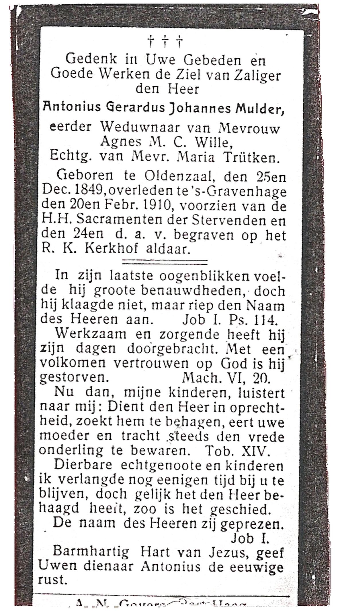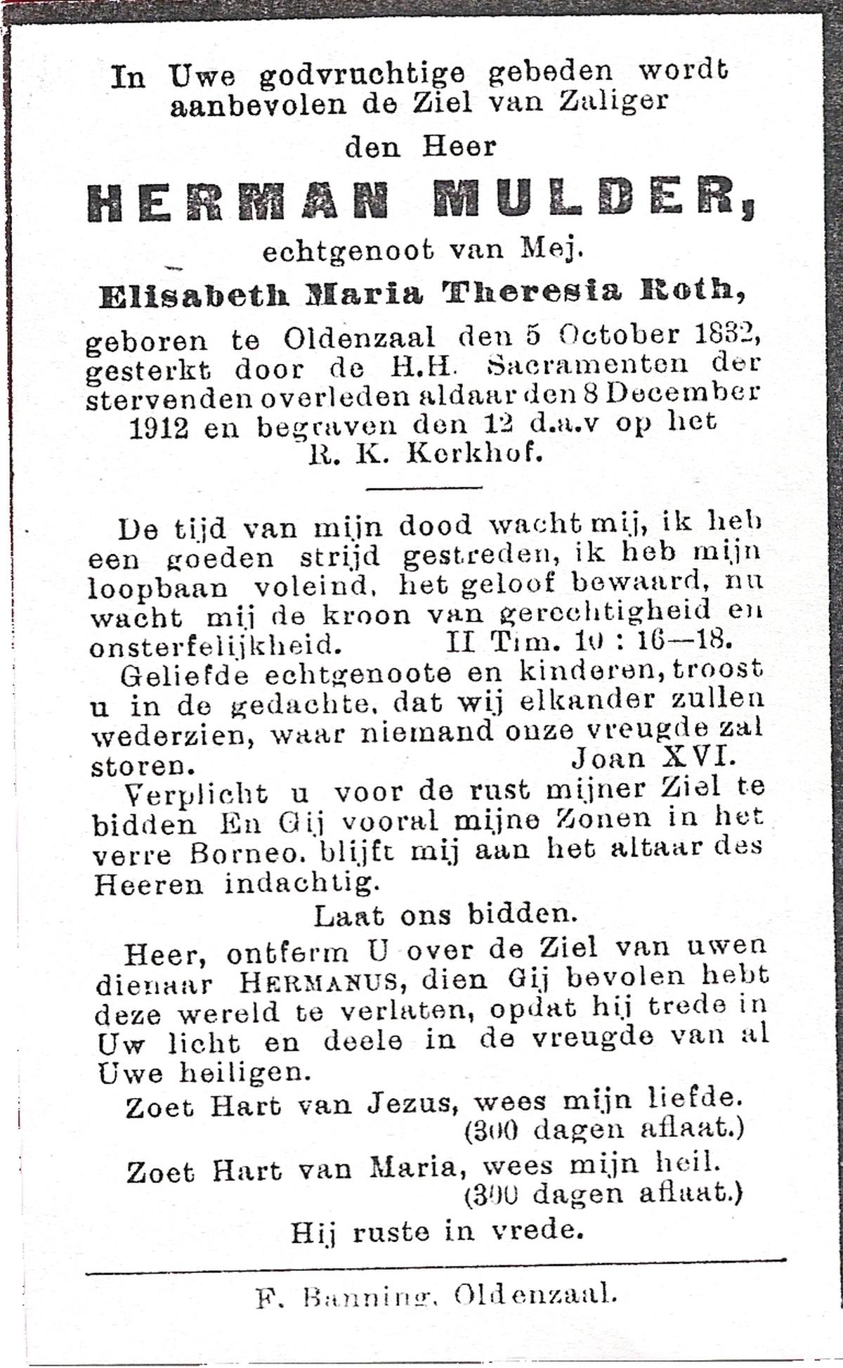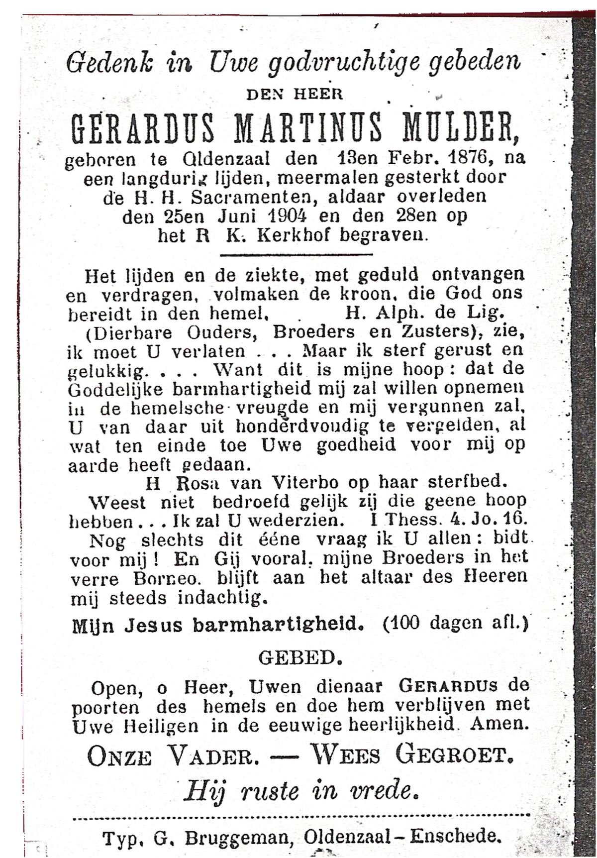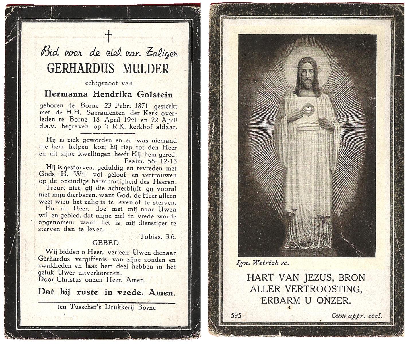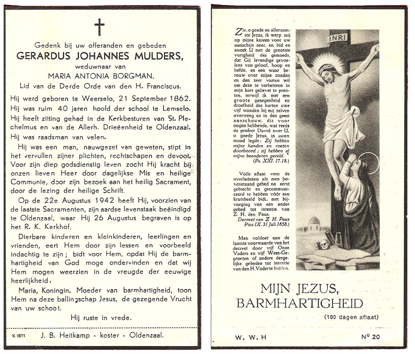 MULDERS, Gerardus Johannes, geboren op 21-09-1862 te Weerselo, overleden op 22-8-1942 te Oldenzaal op 79-jarige leeftijd, begraven op 26-8-1942 te Oldenzaal.
