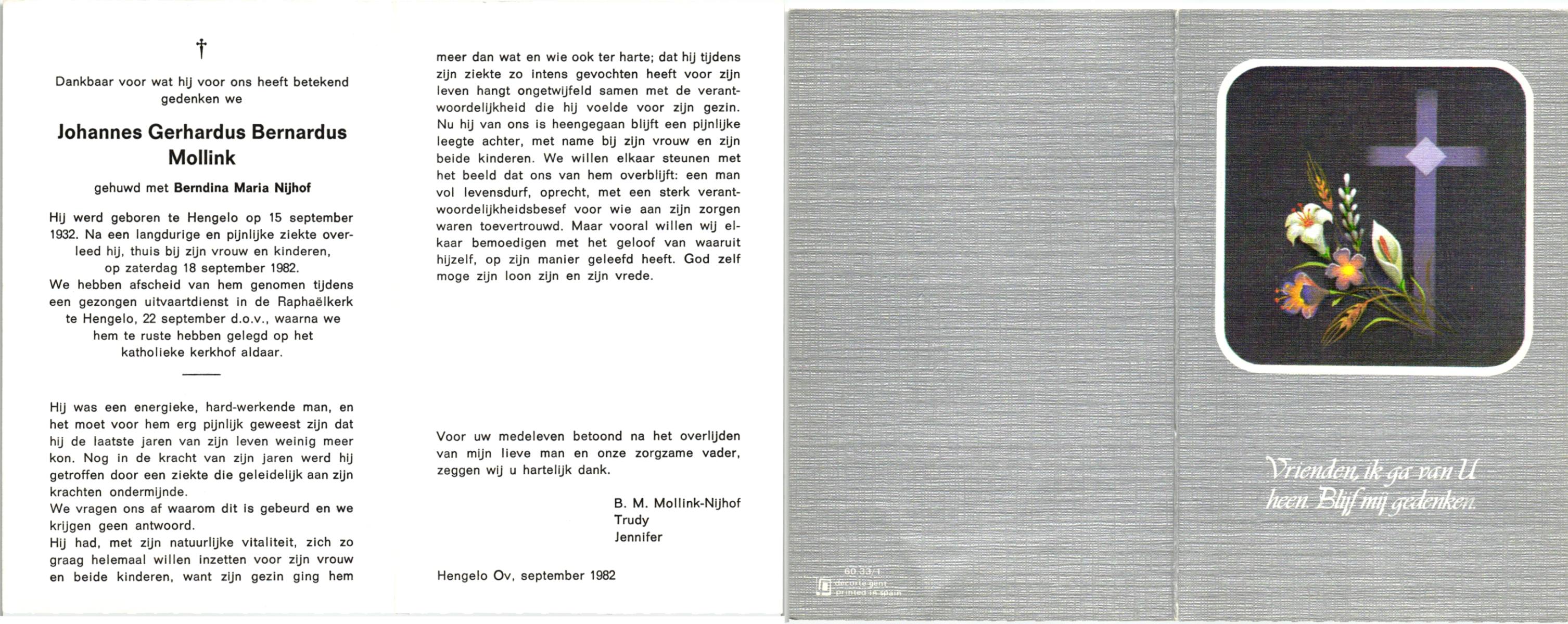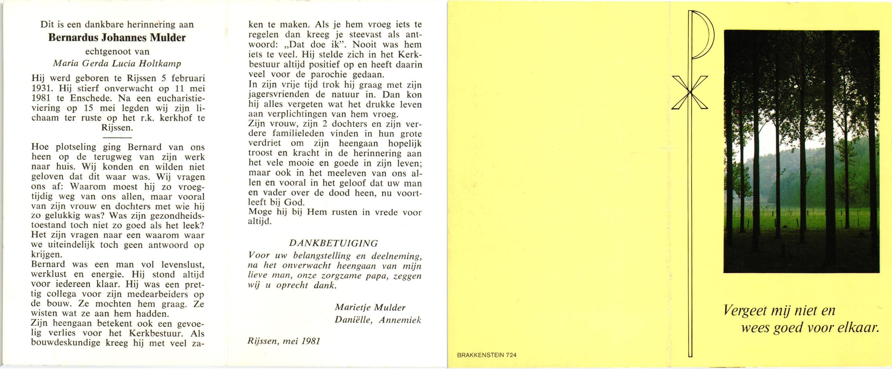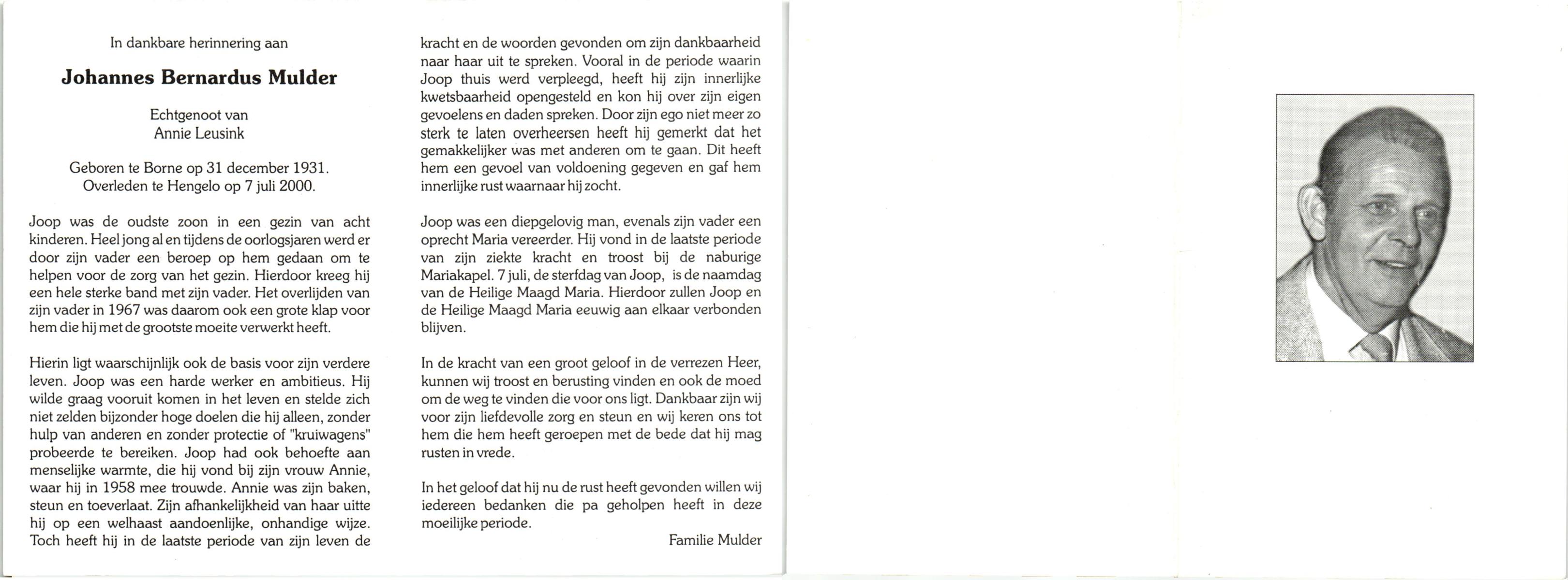 MULDER, Johannes Bernardus, geboren op 31-12-1931 te Borne, overleden op 7-7-2000 te Hengelo op 68-jarige leeftijd.
