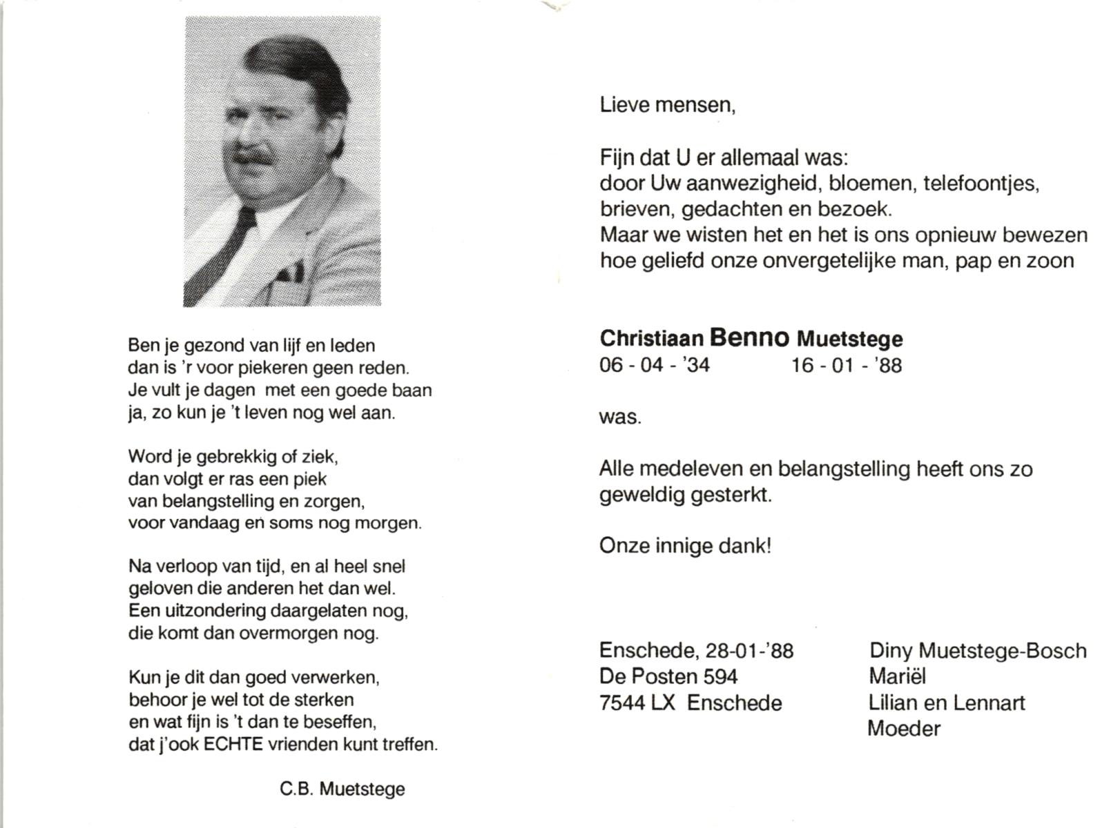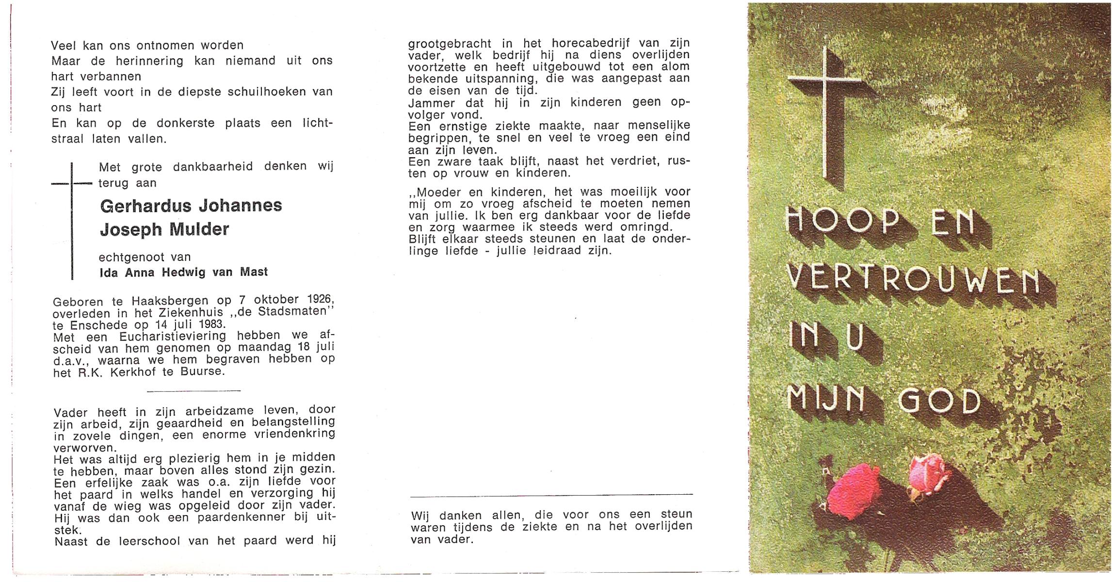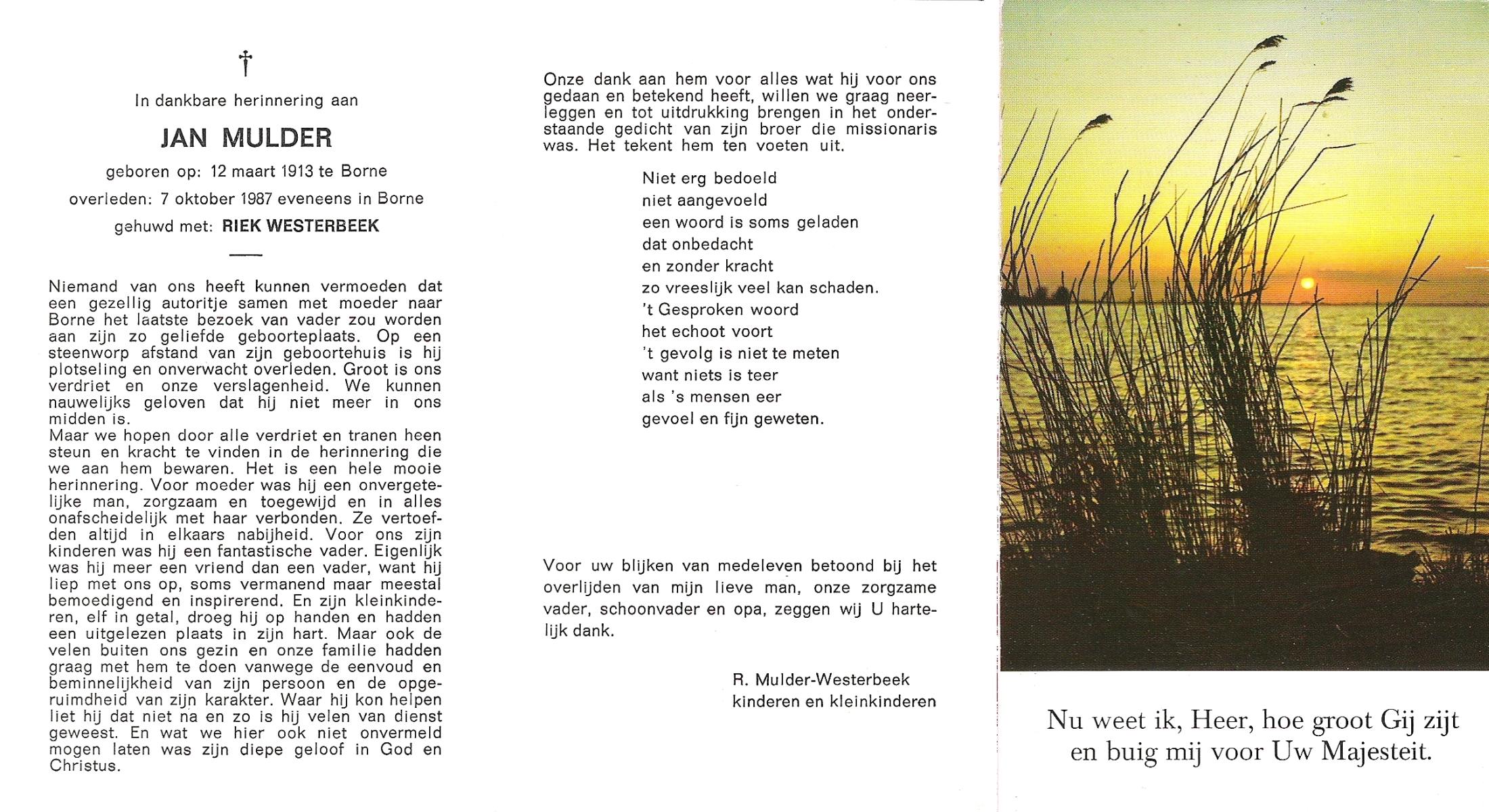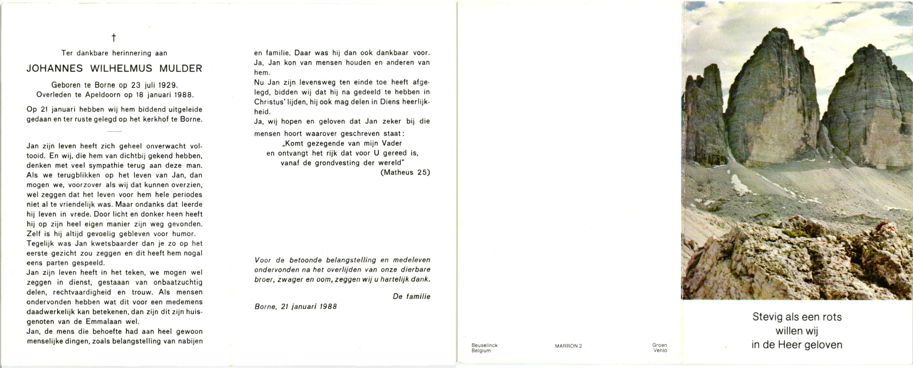 MULDER, , Johannes Wilhelmus, geboren op 23-7-1929 te Borne, overleden op 18-1-1988 te Apeldoorn op 58-jarige leeftijd, begraven op 21-1-1988 te Borne.