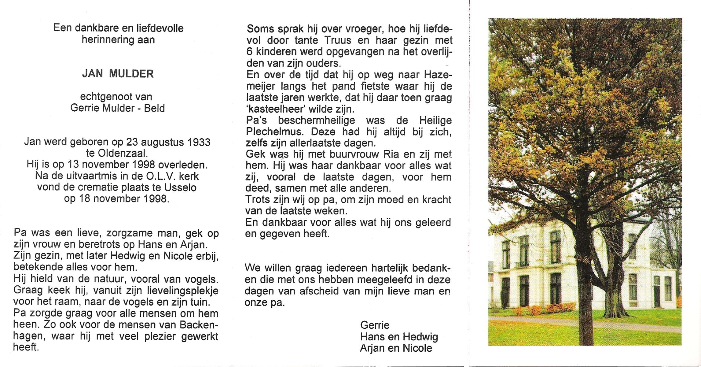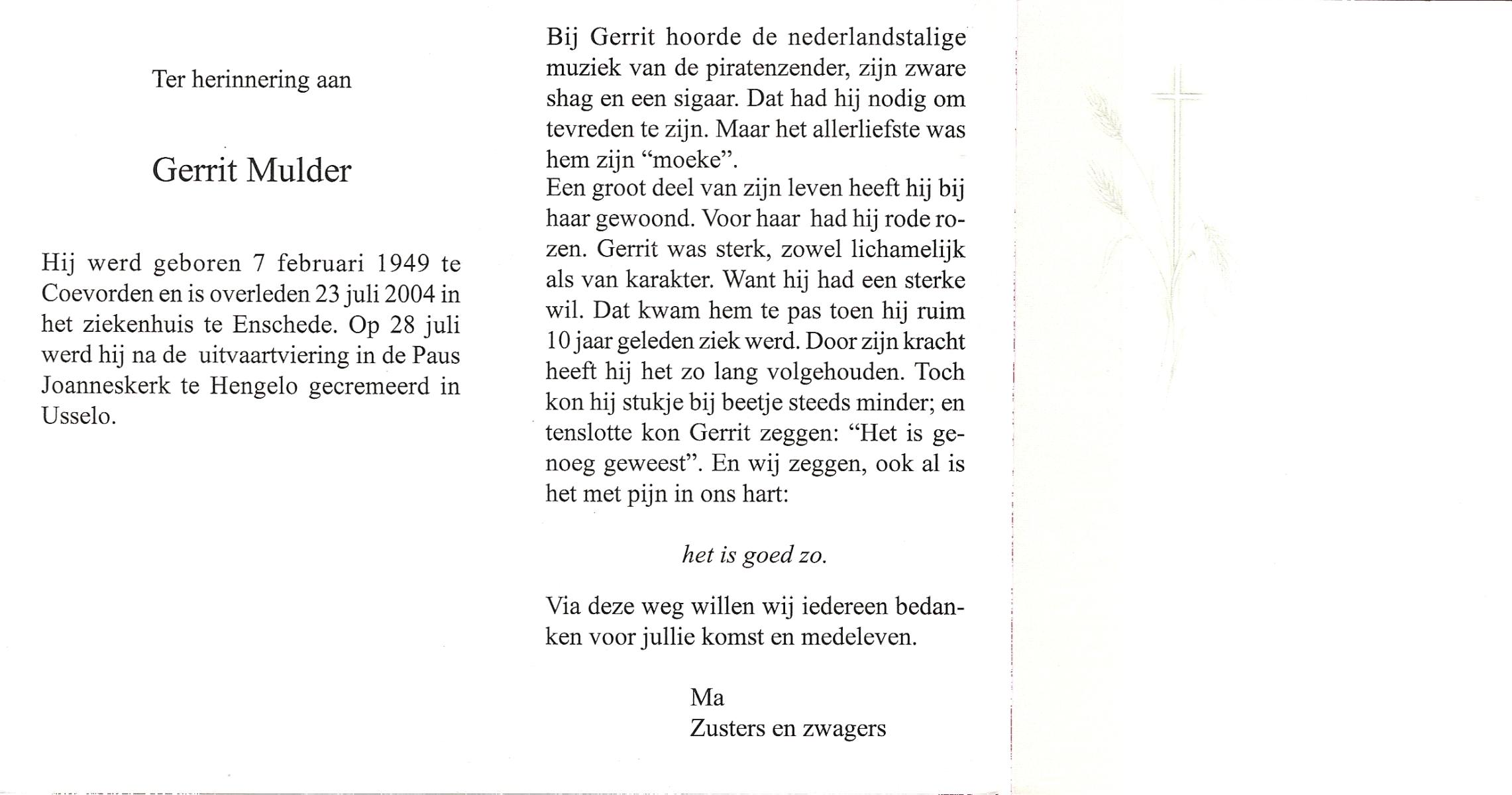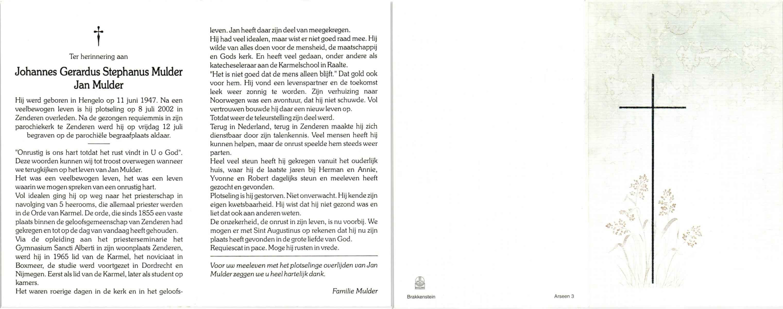 MULDER, Johannes Gerardus Stephanus (Jan), geboren op 11-6-1947 te Hengelo, overleden op 8-7-2002 te Zenderen op 55-jarige leeftijd, begraven op 12-7-2002 te Zenderen.