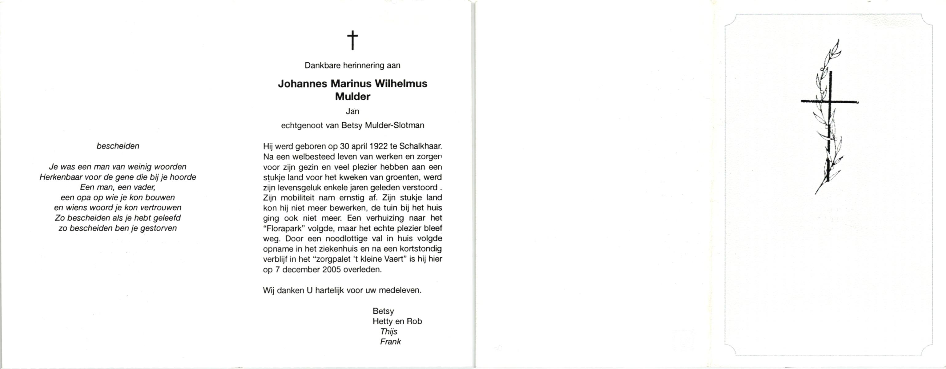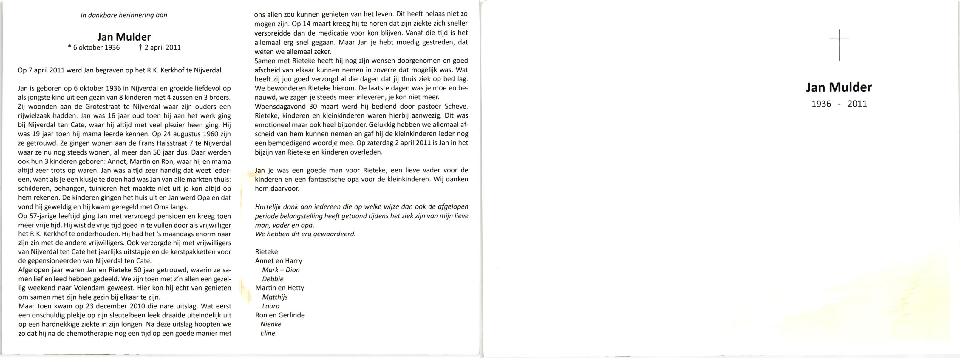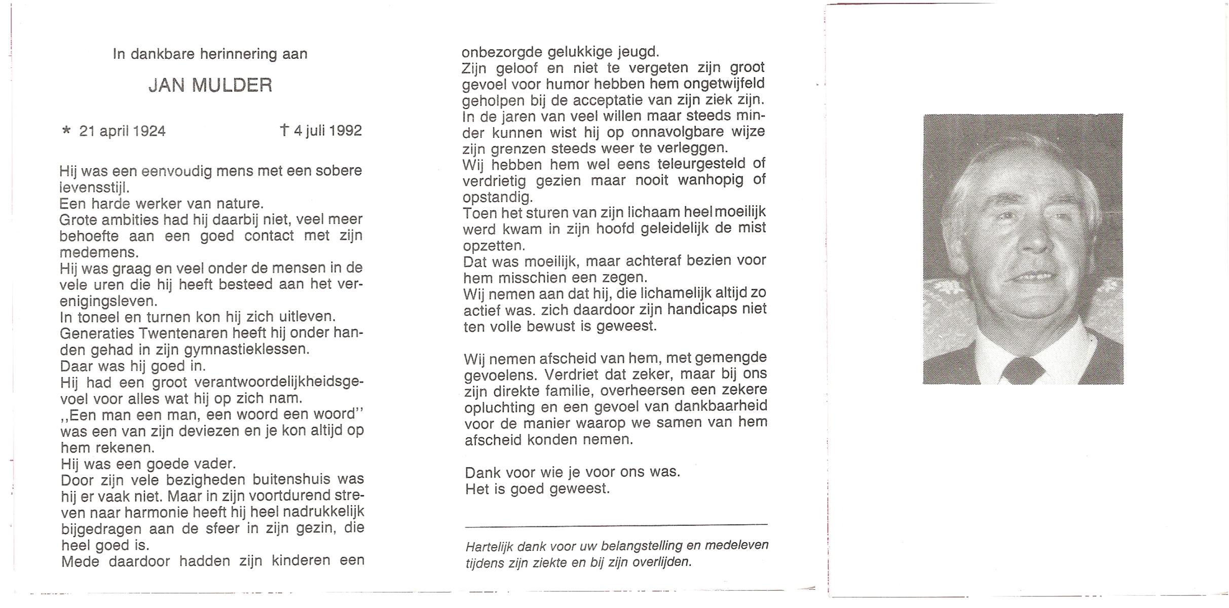 MULDER, Johannes Gerardus Stephanus (Jan), geboren op 11-6-1947 te Hengelo, overleden op 8-7-2002 te Zenderen op 55-jarige leeftijd, begraven op 12-7-2002 te Zenderen.