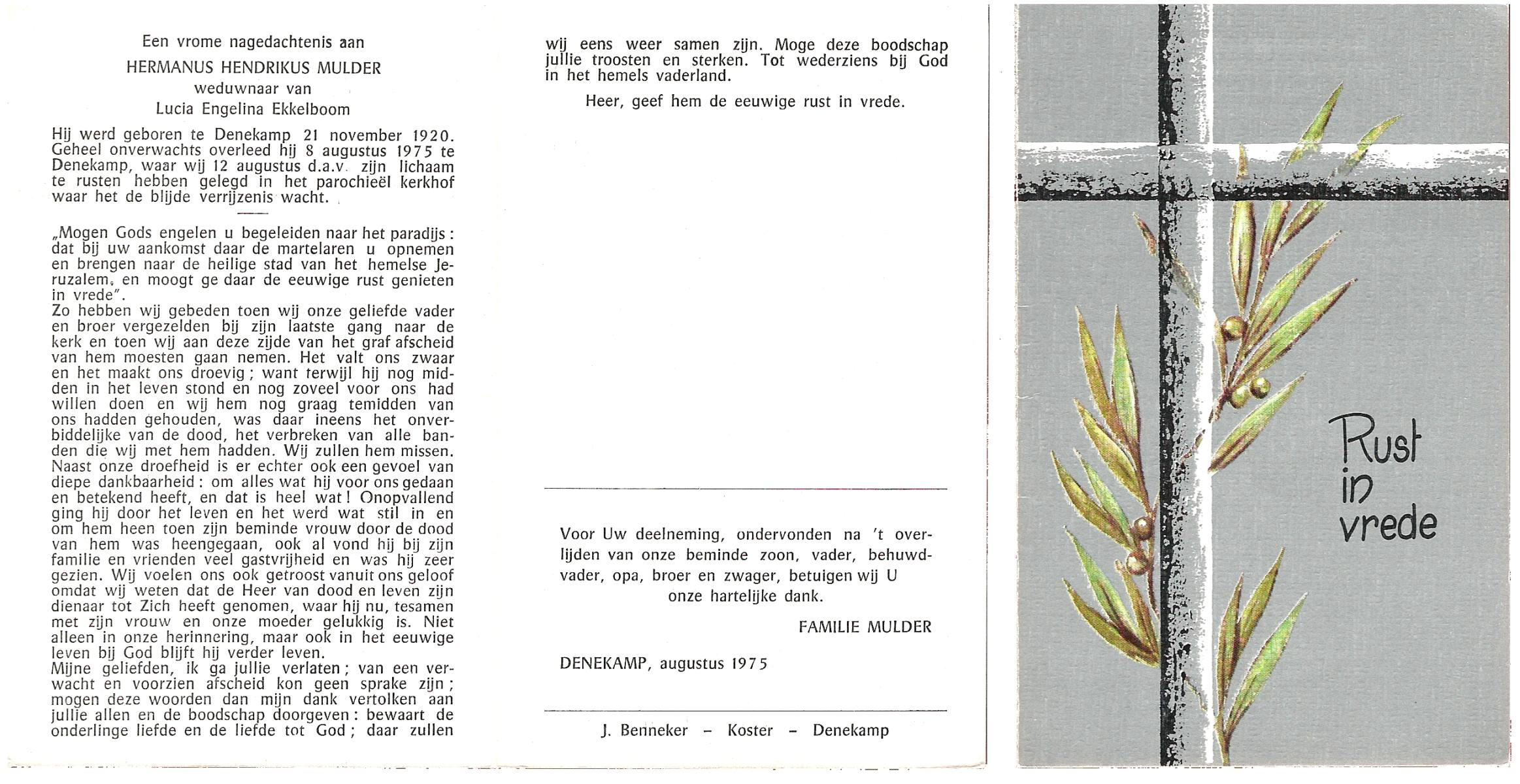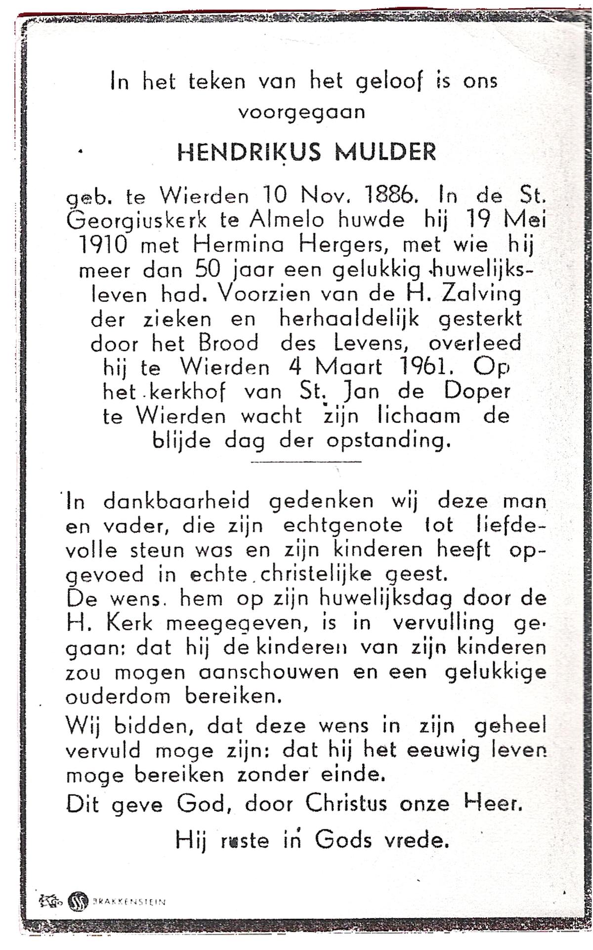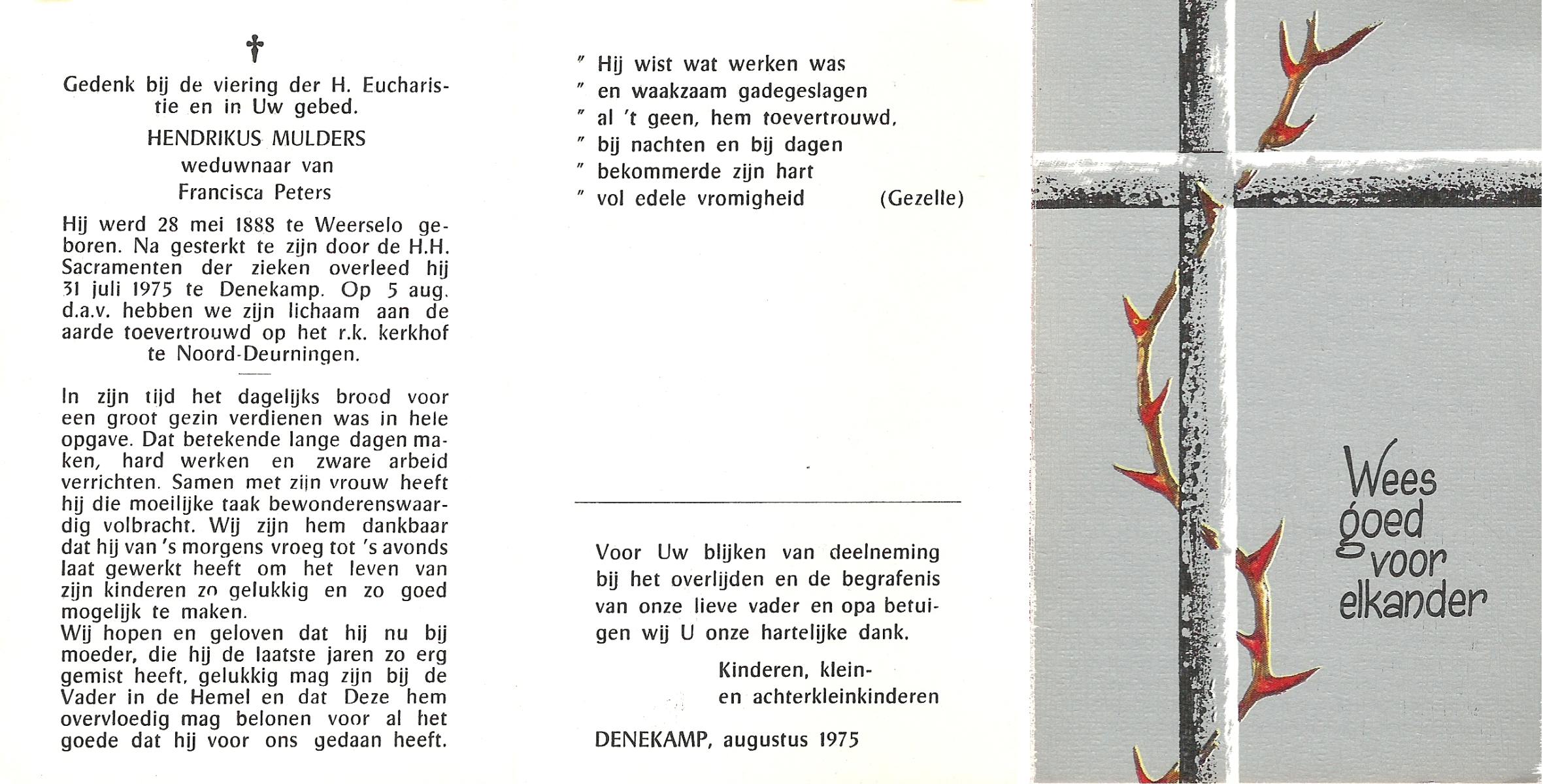 MULDERS, Hendrikus, geboren op 28-05-1888 te Weerselo, overleden op 31-7-1975 te Denekamp op 87-jarige leeftijd, begraven op 5-8-1975 te Noord Deurningen.