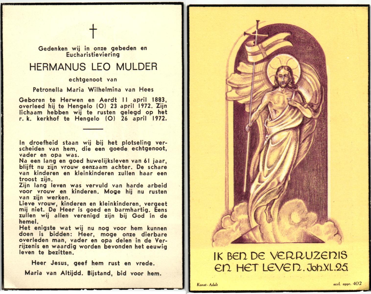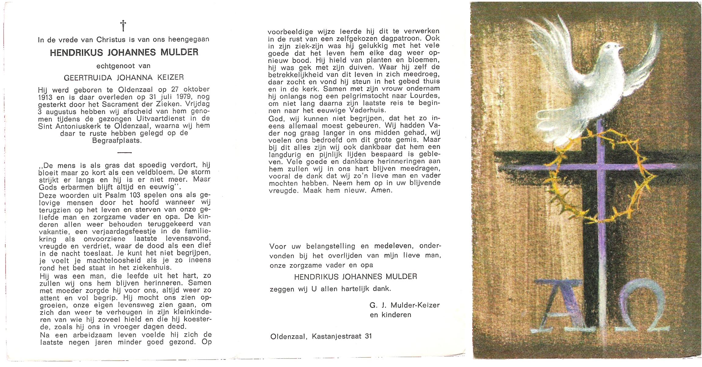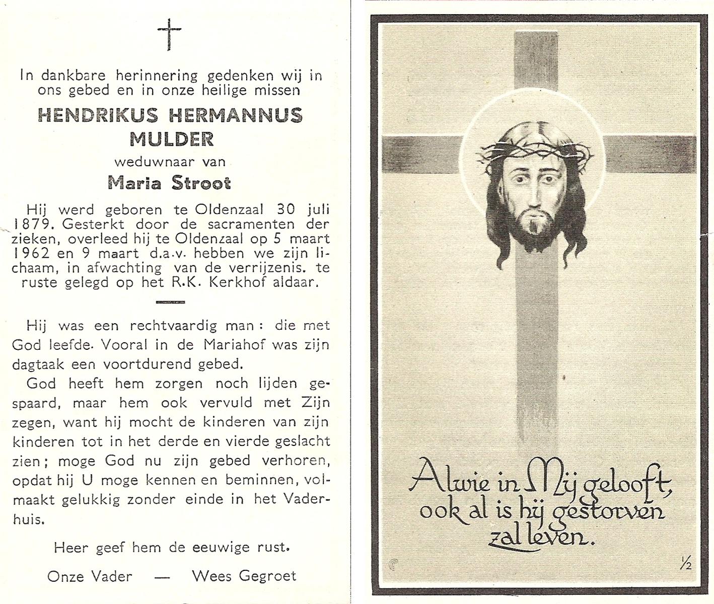 MULDERS, Hendrikus, geboren op 28-05-1888 te Weerselo, overleden op 31-7-1975 te Denekamp op 87-jarige leeftijd, begraven op 5-8-1975 te Noord Deurningen.