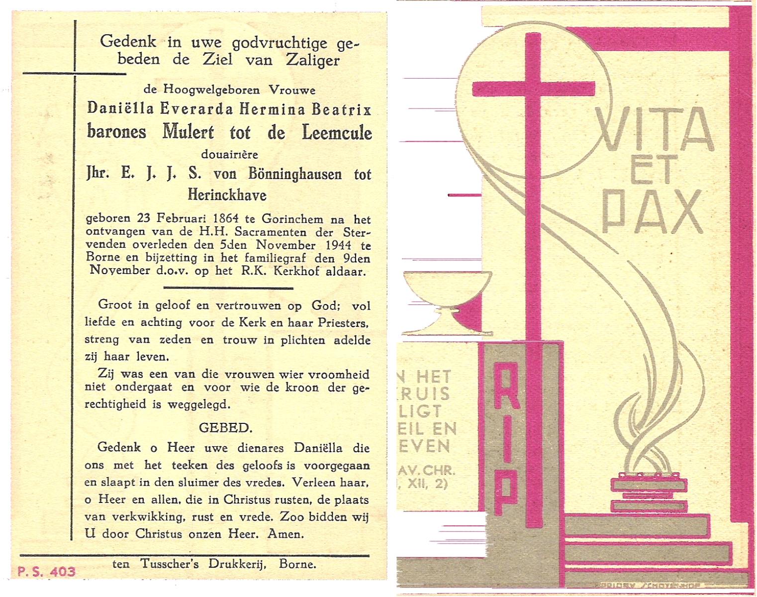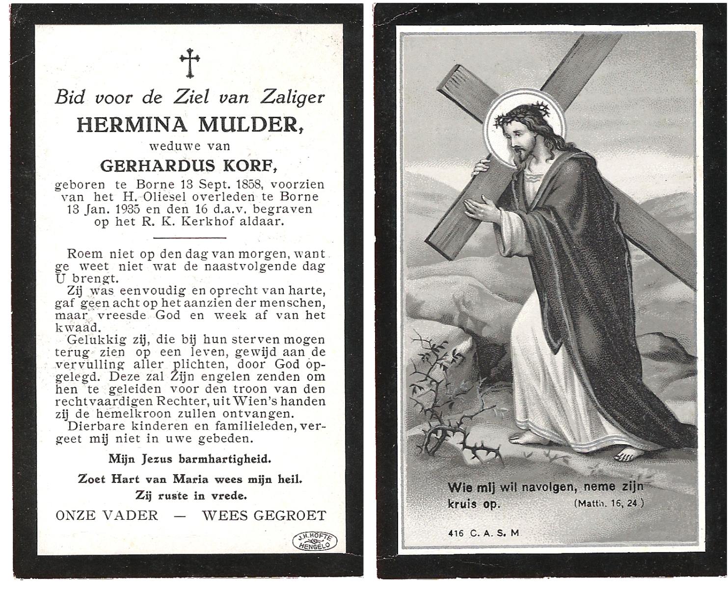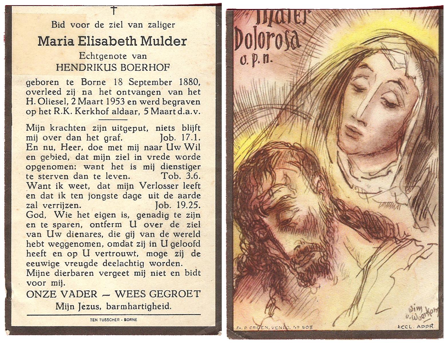 MULDER, Maria Elisabeth, geboren op 18-09-1880 te Borne, overleden op 2-3-1953 op 72-jarige leeftijd, begraven op 5-3-1953.