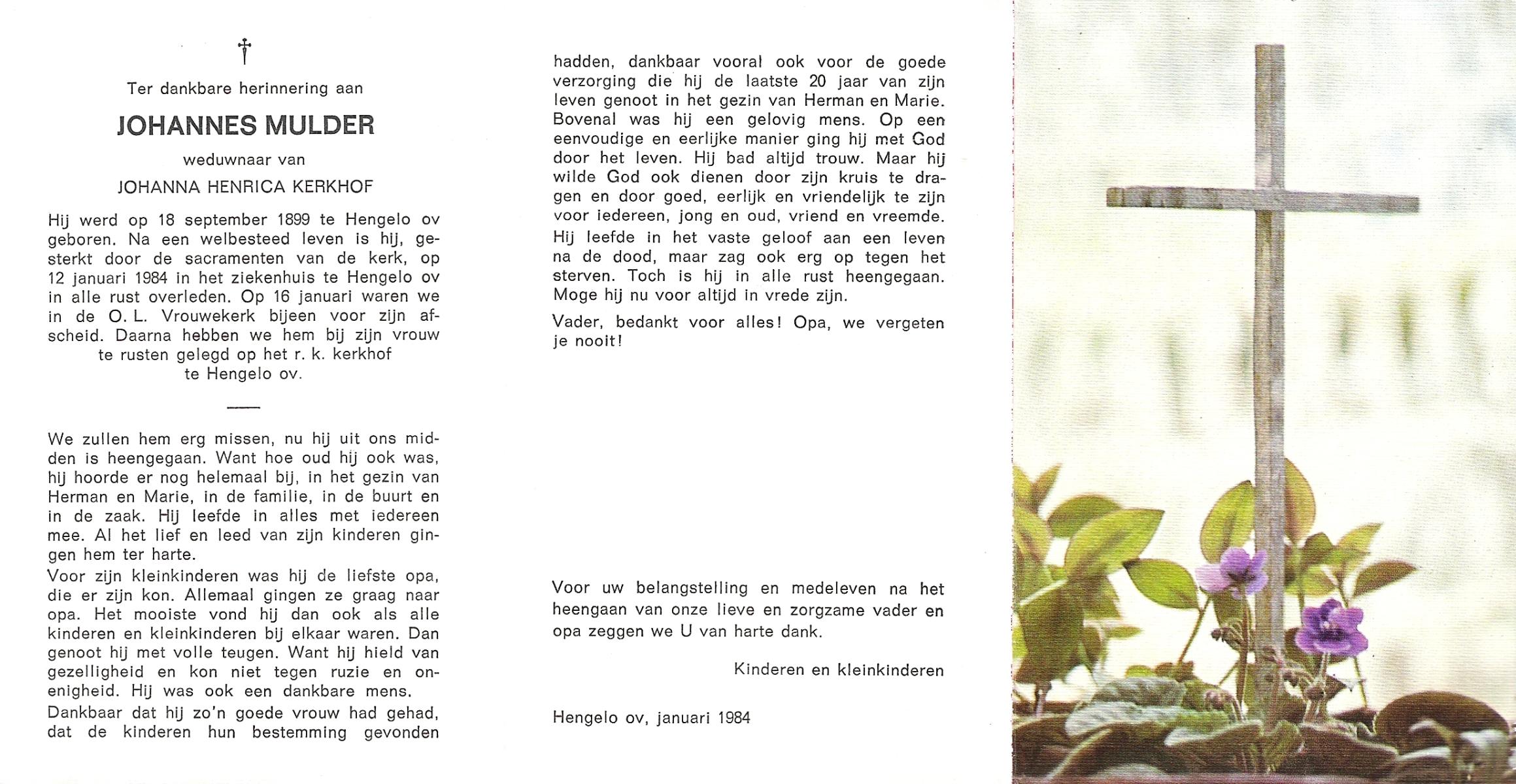 MULDER, Johannes, geboren op 18-09-1899 te Hengelo (O), overleden op 12-1-1984 te Hengelo (Ov.) op 84-jarige leeftijd, begraven op 16-1-1984 te Hengelo (Ov.).