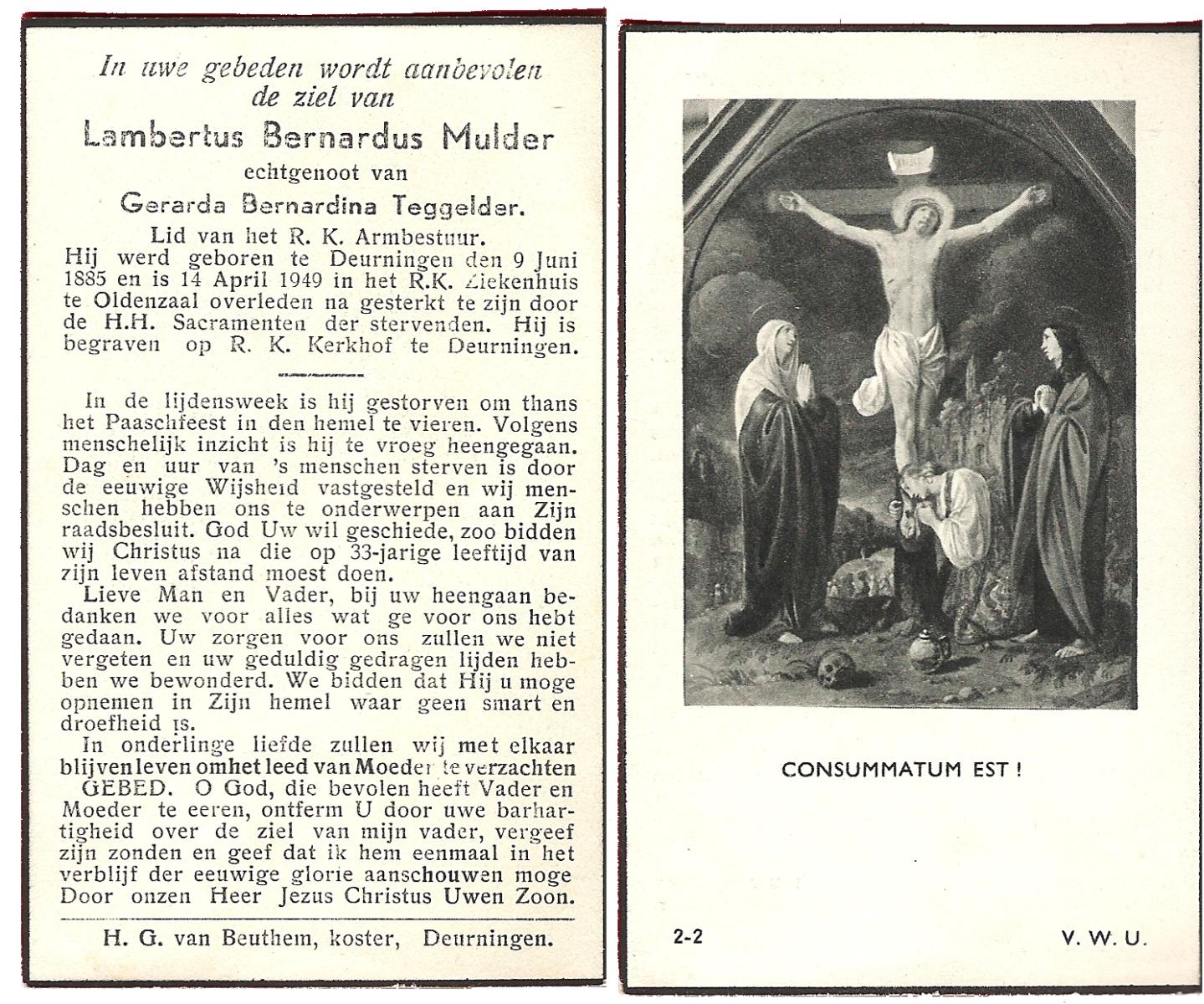 MULDER, Lambertus Bernardus, geboren op 09-06-1885 te Deurningen, overleden op 14-4-1949 te Oldenzaal op 63-jarige leeftijd, begraven te Deurningen.