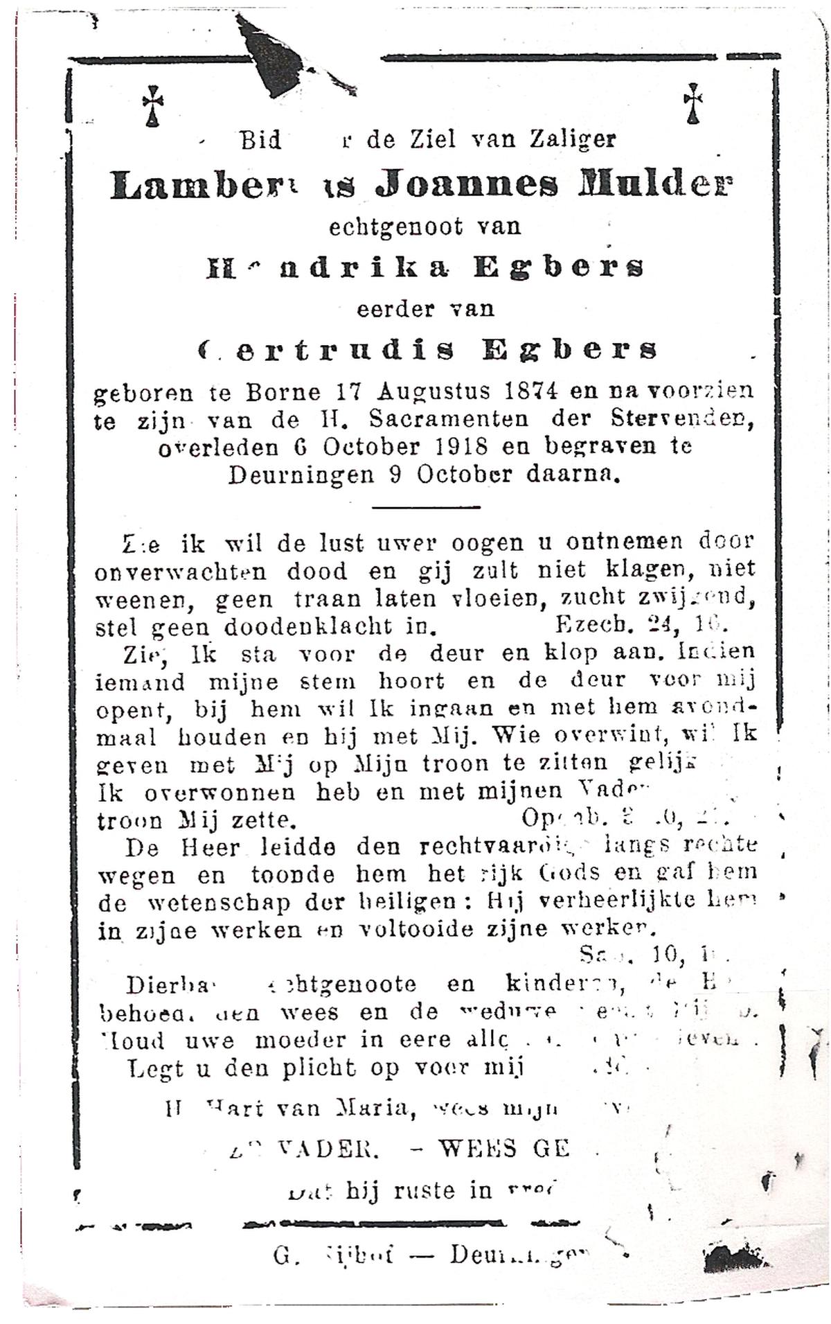 MULDER, Lambertus Joannes, geboren op 17-08-1874 te Borne, overleden op 6-10-1918 op 44-jarige leeftijd, begraven op 9-10-1918 te Deurningen.