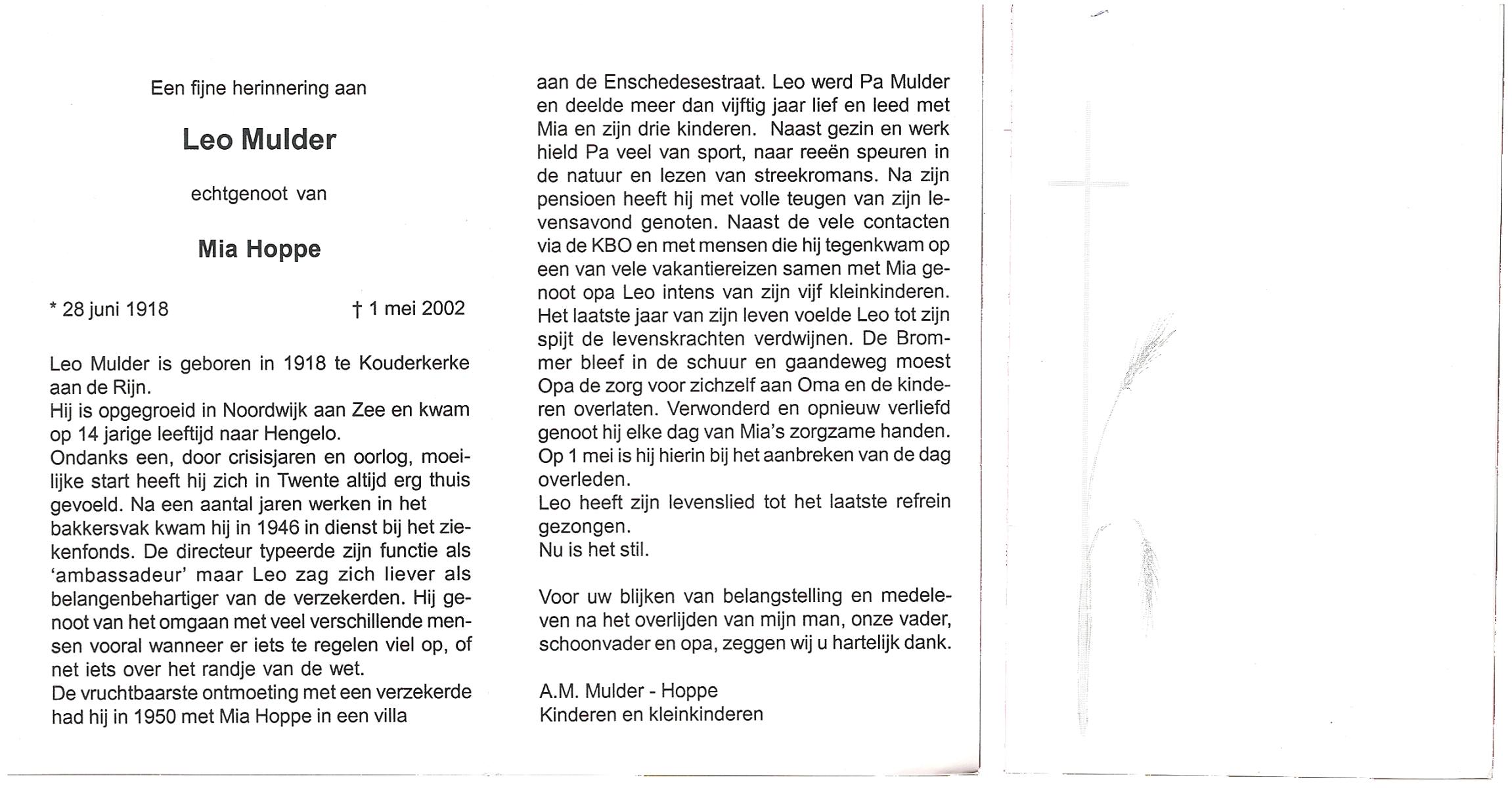 MULDER, Leo, geboren op 28-6-1918 te Kouderkerke, overleden op 1-5-2002 te Hengelo (Ov.) op 83-jarige leeftijd.