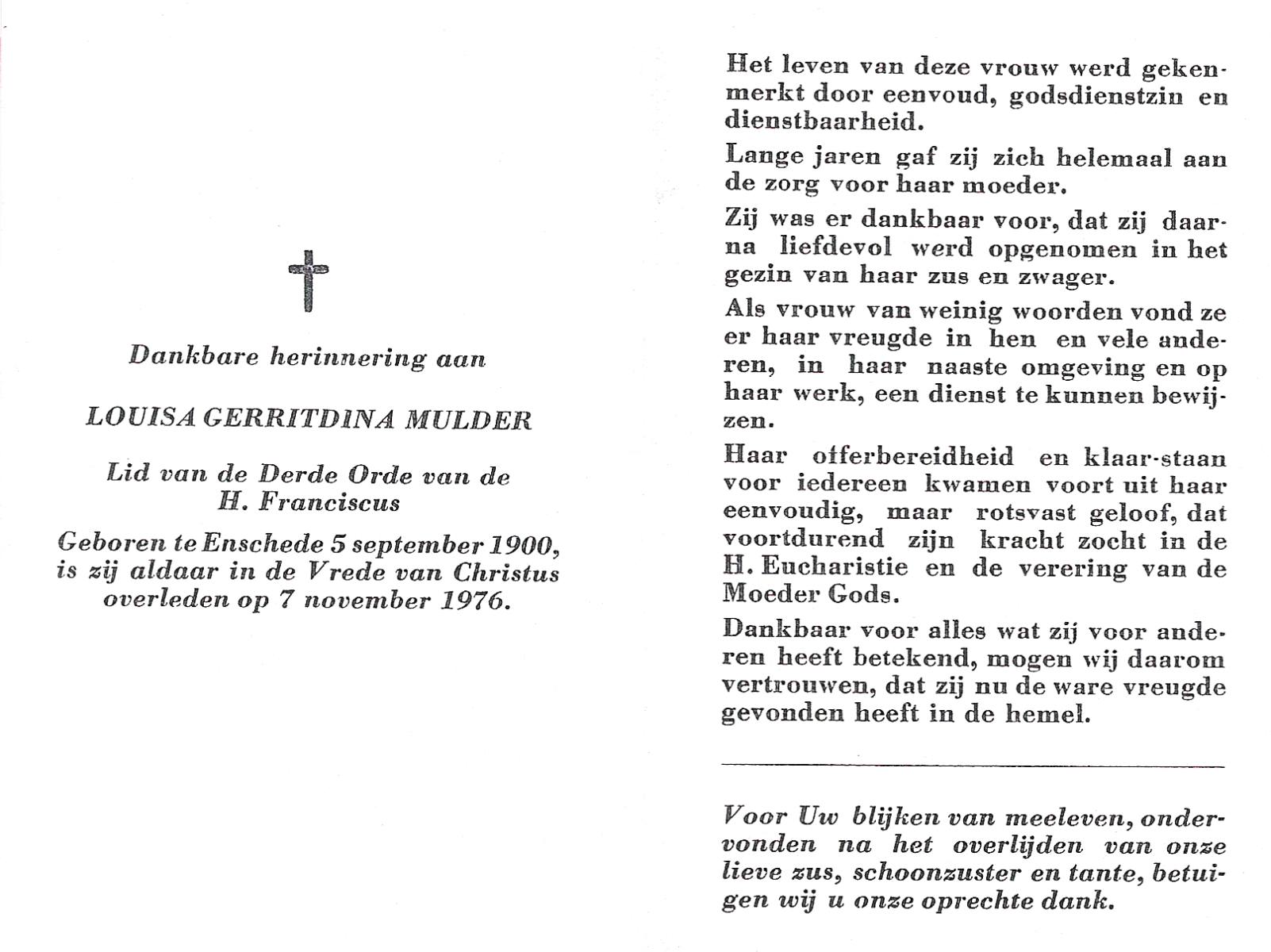 MULDER, Louisa Gerritdina, geboren op 5-9-1900 te Enschede, overleden op 7-11-1976 te Enschede op 76-jarige leeftijd.