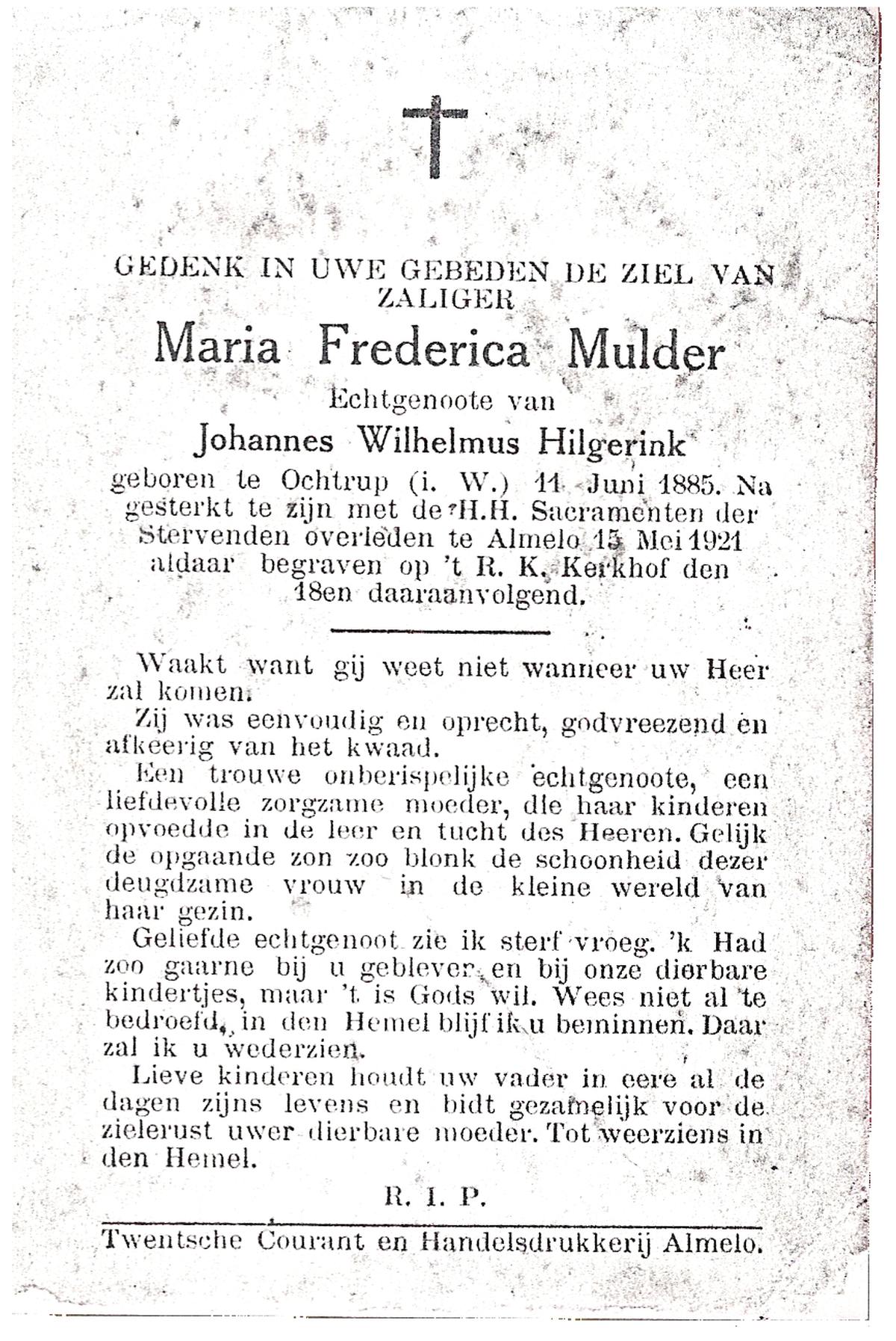 MULDER, Maria Frederica, geboren op 14-06-1885 te Ochtrup (Dld.), overleden op 15-5-1921 te Almelo op 35-jarige leeftijd, begraven op 18-5-1921 te Almelo.