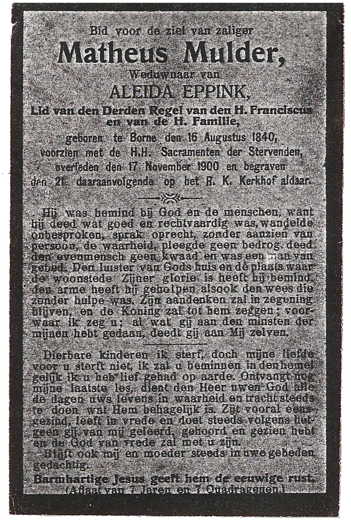 MULDER, Matheus, geboren op 16-08-1840 te Borne, overleden op 16-11-1900 op 60-jarige leeftijd, begraven op 21-11-1900 te Borne.