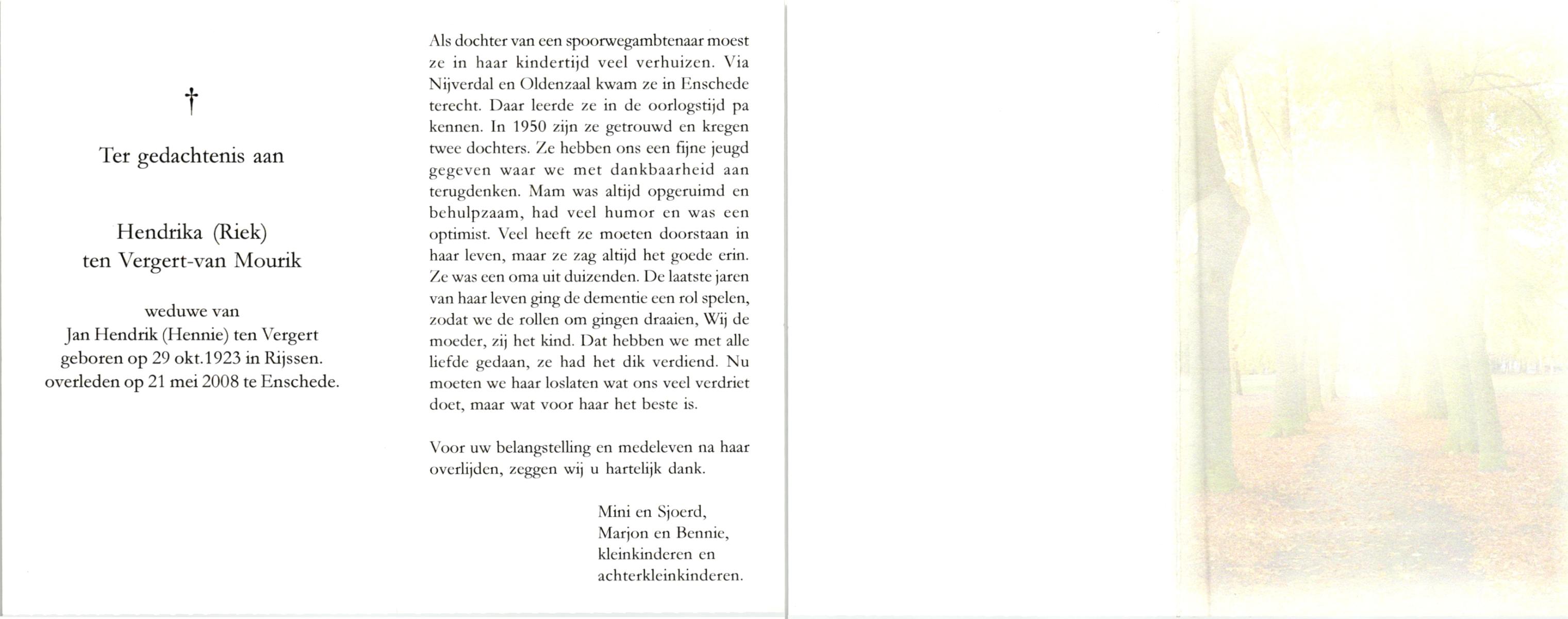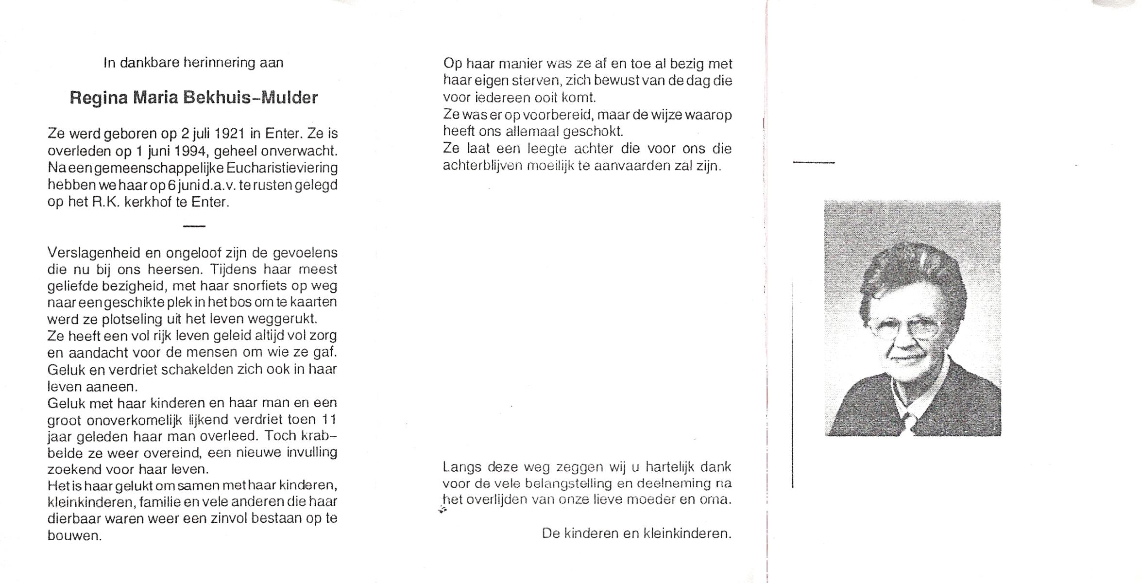 MULDER, Regina Maria, geboren op 2-7-1921 te Enter, overleden op 1-6-1994 op 72-jarige leeftijd, begraven op 6-6-1994 te Enter.