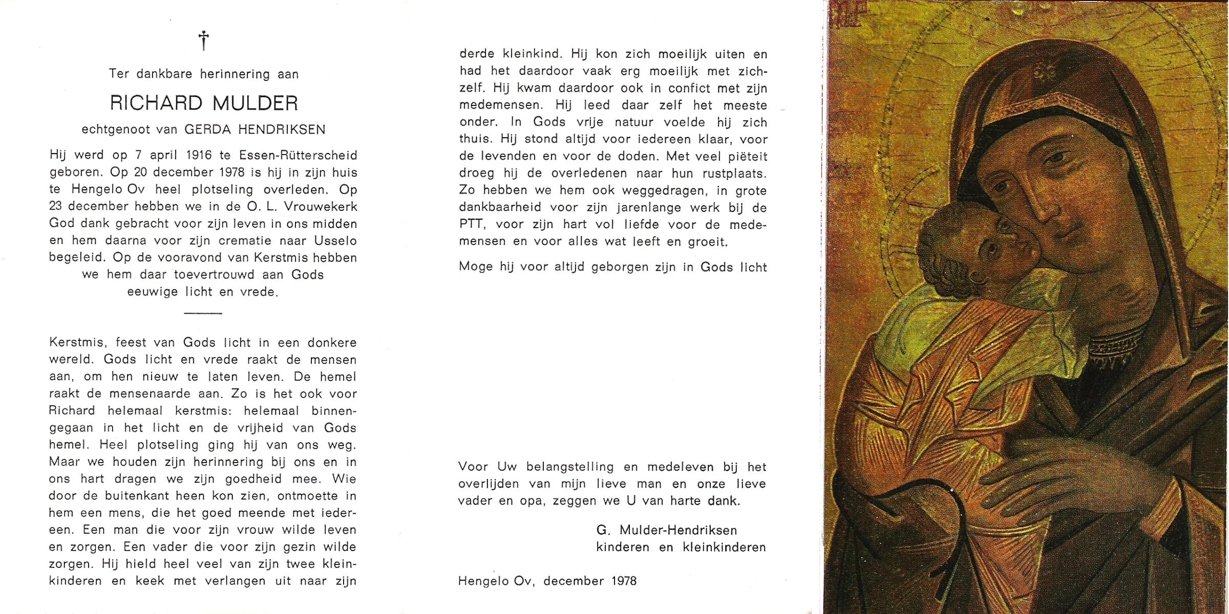 MULDER, Richard, geboren op 7-4-1916 te Rutterscheid(D), overleden op 20-12-1978 te Hengelo (Ov.) op 62-jarige leeftijd, gecremeerd op 23-12-1978 te Usselo.