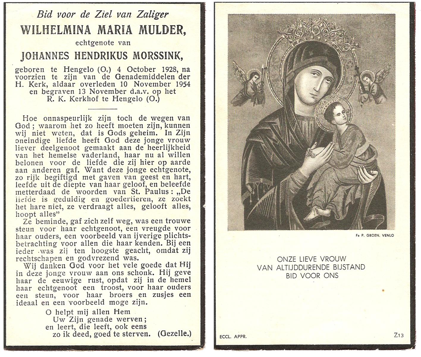 MULDER, Wilhelmina Maria, geboren op 4-10-1928 te Hengelo (O), overleden op 10-11-1954 op 26-jarige leeftijd, begraven op 13-11-1954 te Hengelo (Ov.).