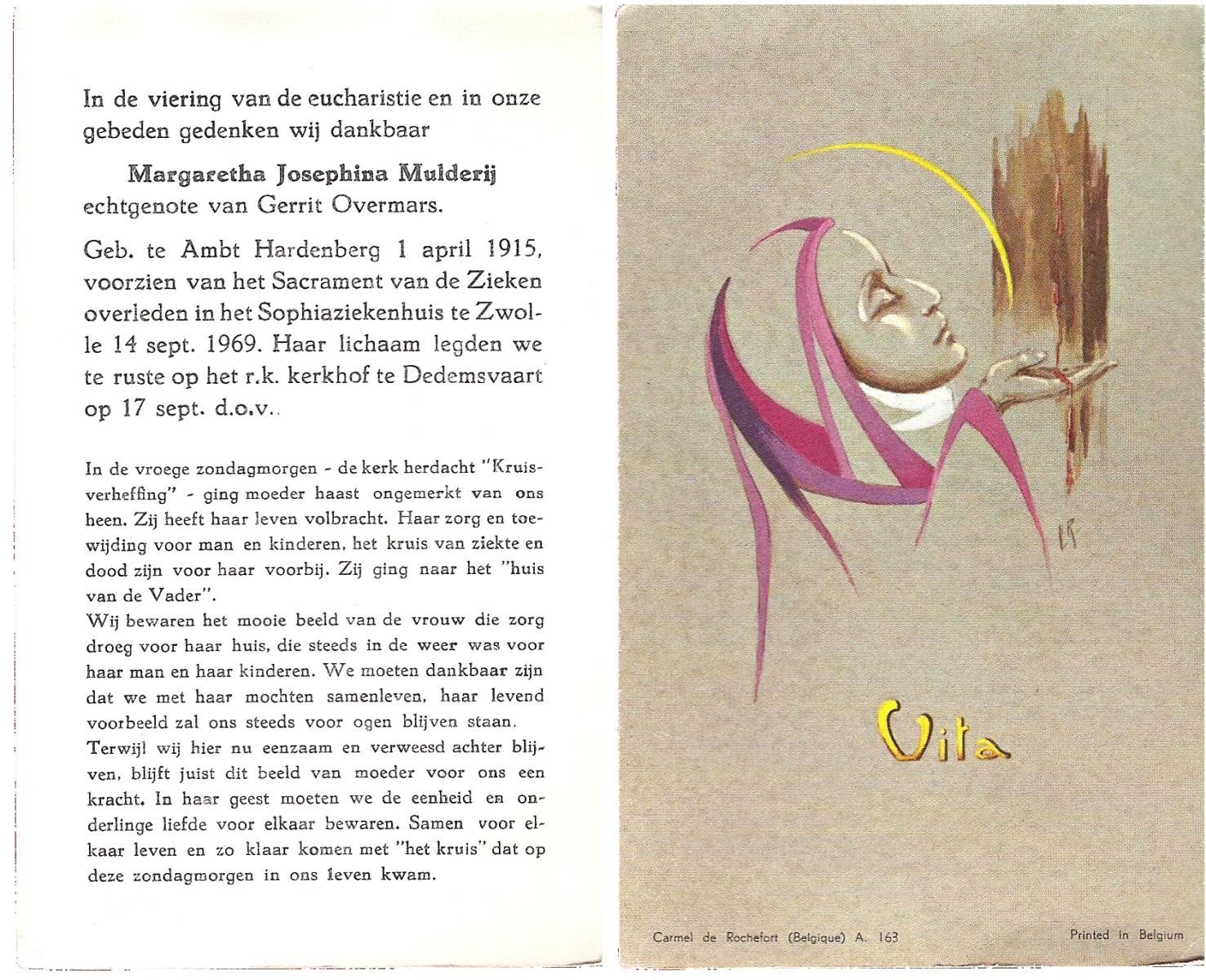 MULDERIJ, Margaretha Josephina, geboren op 1-4-1915 te Hardenberg, Ambt, overleden op 14-9-1969 te Zwolle op 54-jarige leeftijd, begraven op 17-9-1969 te Dedemsvaart.