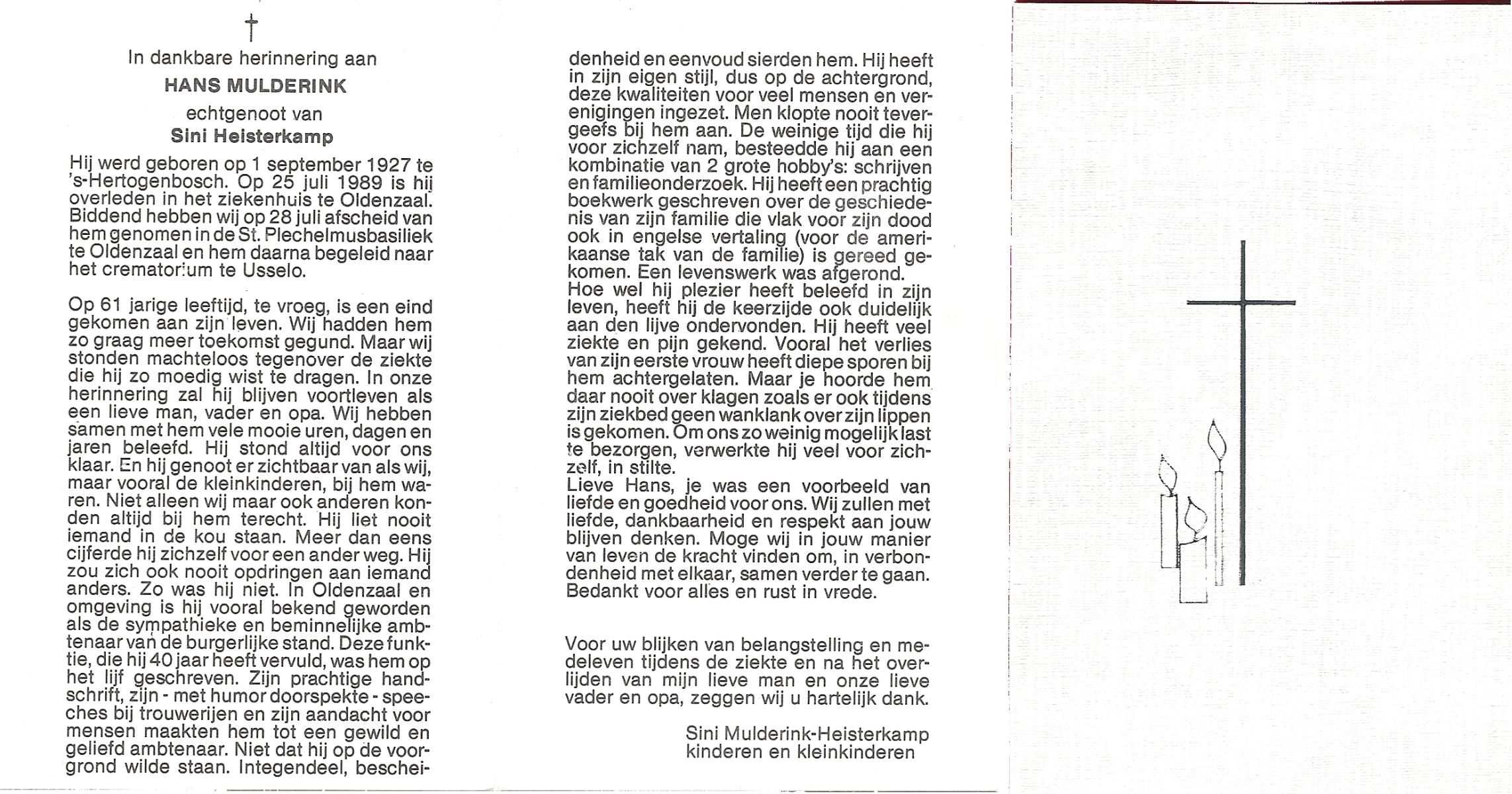 MULDERINK, Hans, geboren op 1-9-1927 te 's Hertogenbosch, overleden op 25-7-1989 te Oldenzaal op 61-jarige leeftijd, gecremeerd op 28-7-1989 te Usselo.