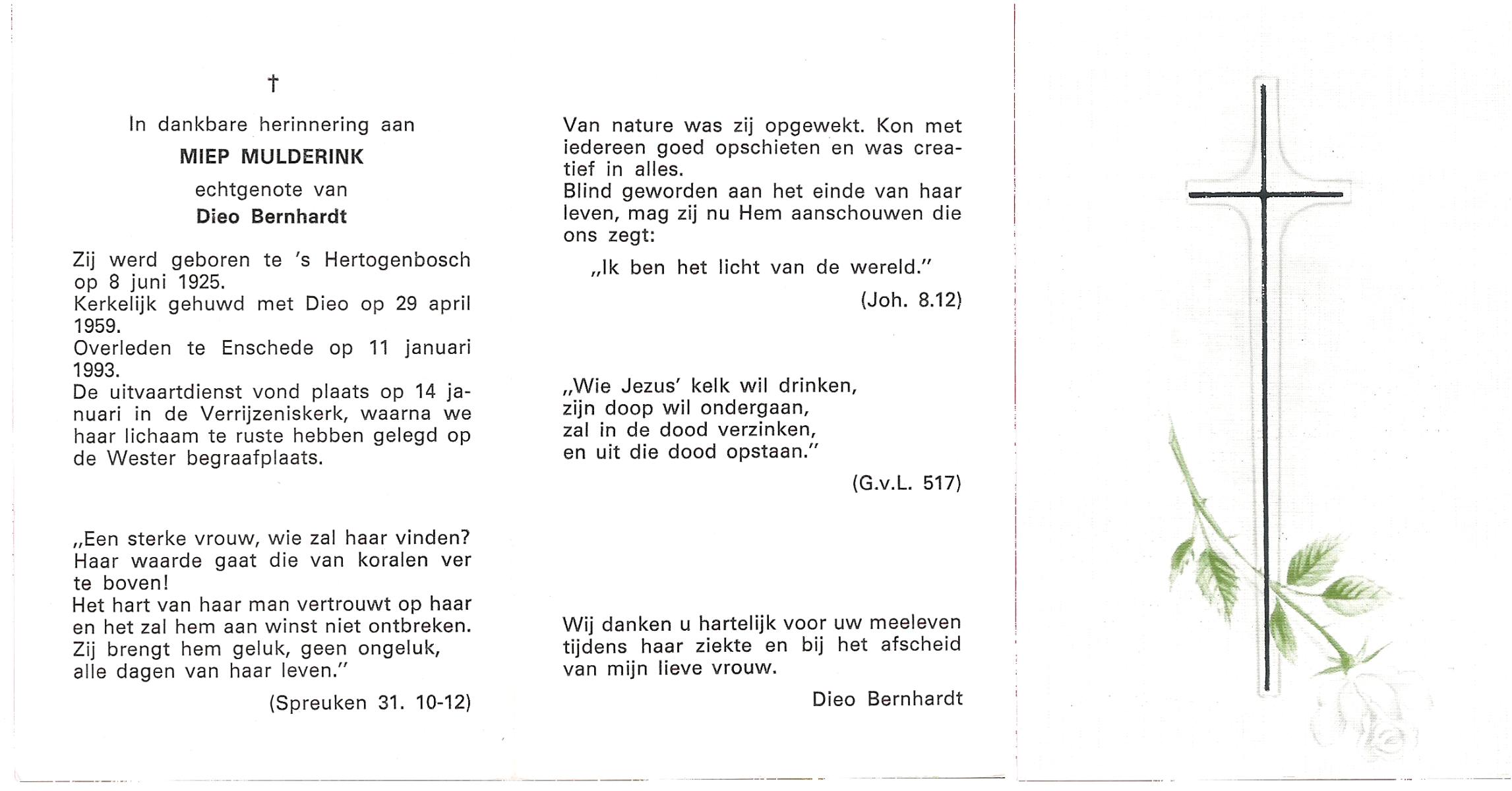 MULDERINK, Miep, geboren op 8-6-1925 te 's Hertogenbosch, overleden op 11-1-1993 te Enschede op 67-jarige leeftijd, begraven op 14-1-1993 te Enschede Westerbegraafplaats.