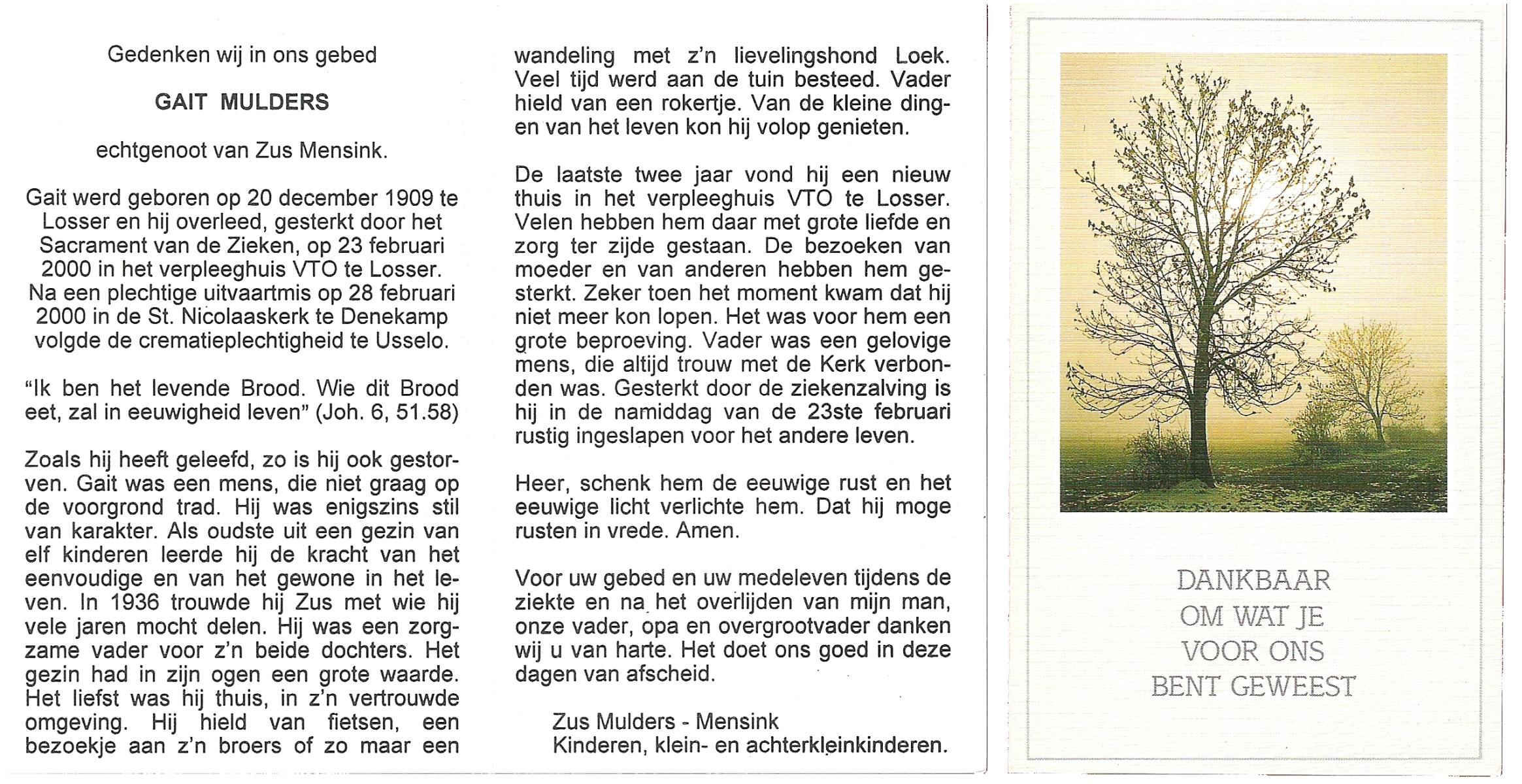 MULDERS, Gait, geboren op 20-12-1909 te Losser, overleden op 23-2-2000 te Losser op 90-jarige leeftijd, gecremeerd op 28-2-2000 te Usselo.