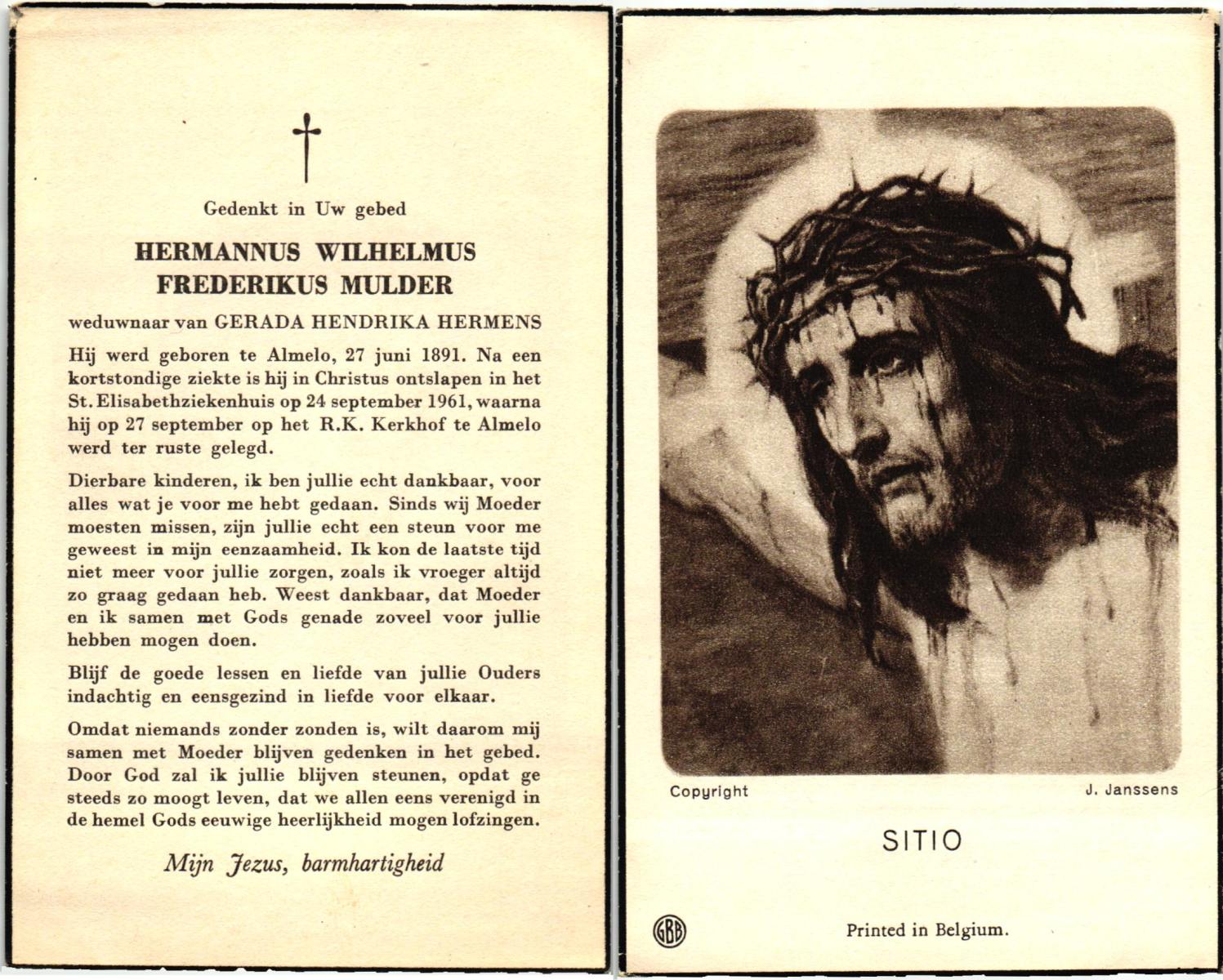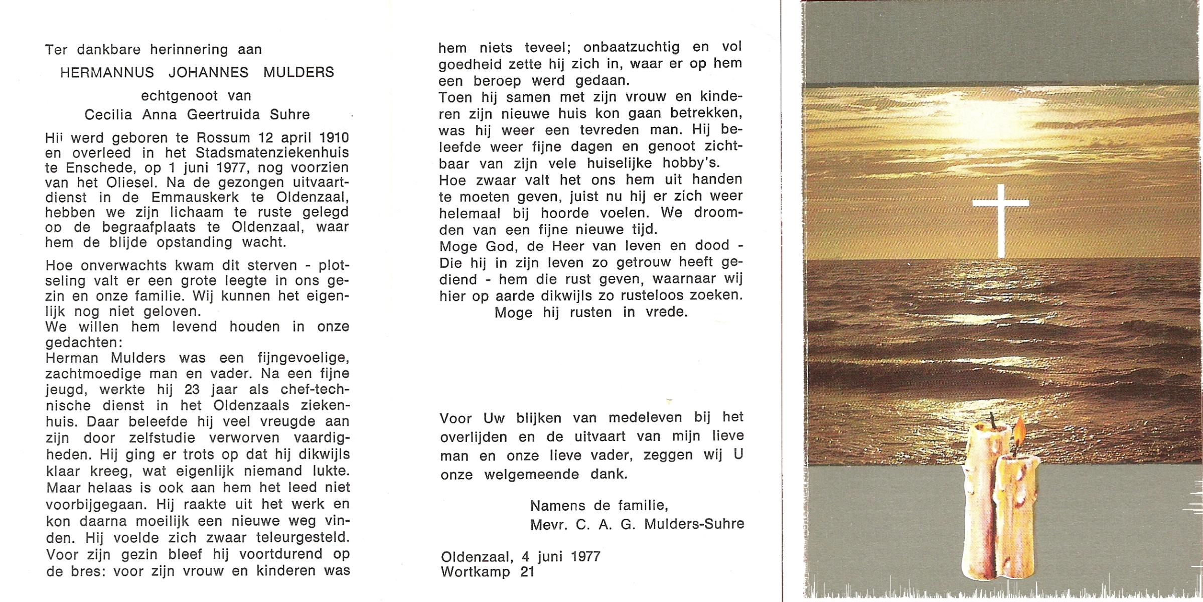 MULDERS, Hermannus Johannes, geboren op 12-4-1910 te Rossum, overleden op 1-6-1977 te Enschede op 67-jarige leeftijd, begraven te Oldenzaal.