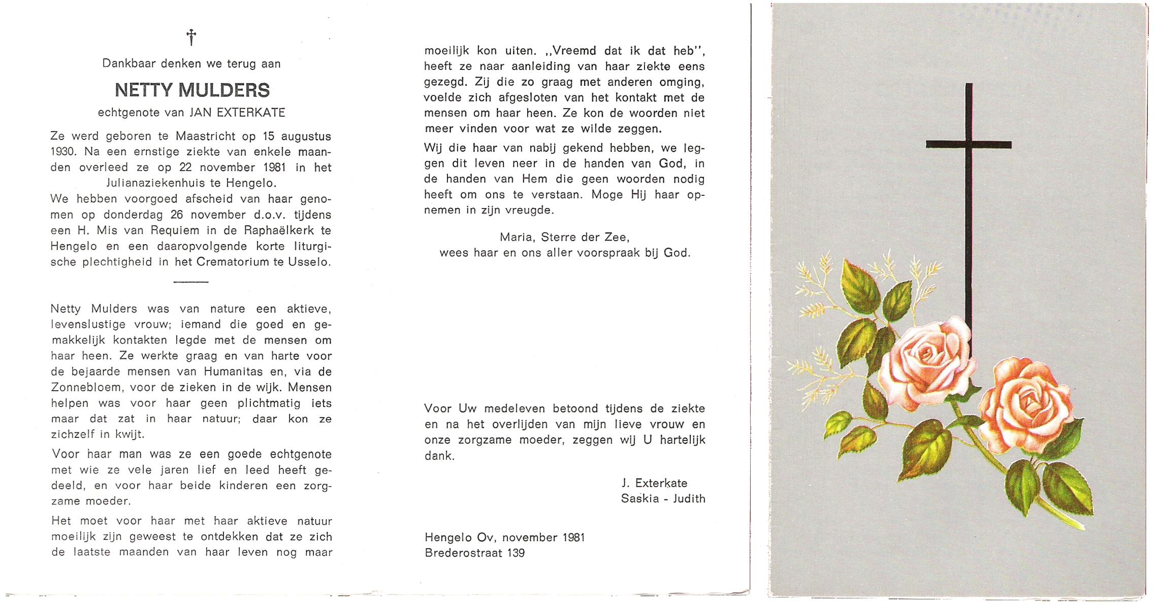 MULDERS, Netty, geboren op 15-8-1930 te Maastricht, overleden op 22-11-1981 te Hengelo (Ov.) op 51-jarige leeftijd, gecremeerd op 26-11-1981 te Usselo.